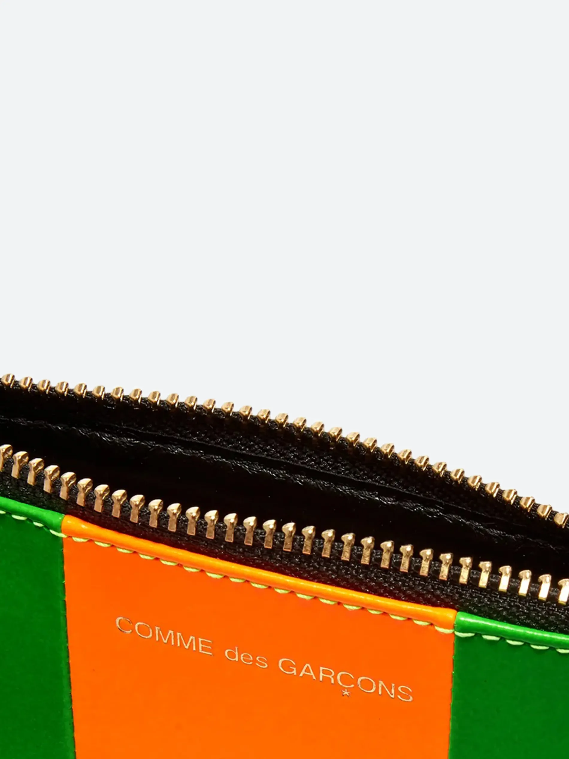 Comme des Garçons WALLET made from a super fluorescent premium cowhide leather. Features a gold-tone zip closure for a subtle touch.