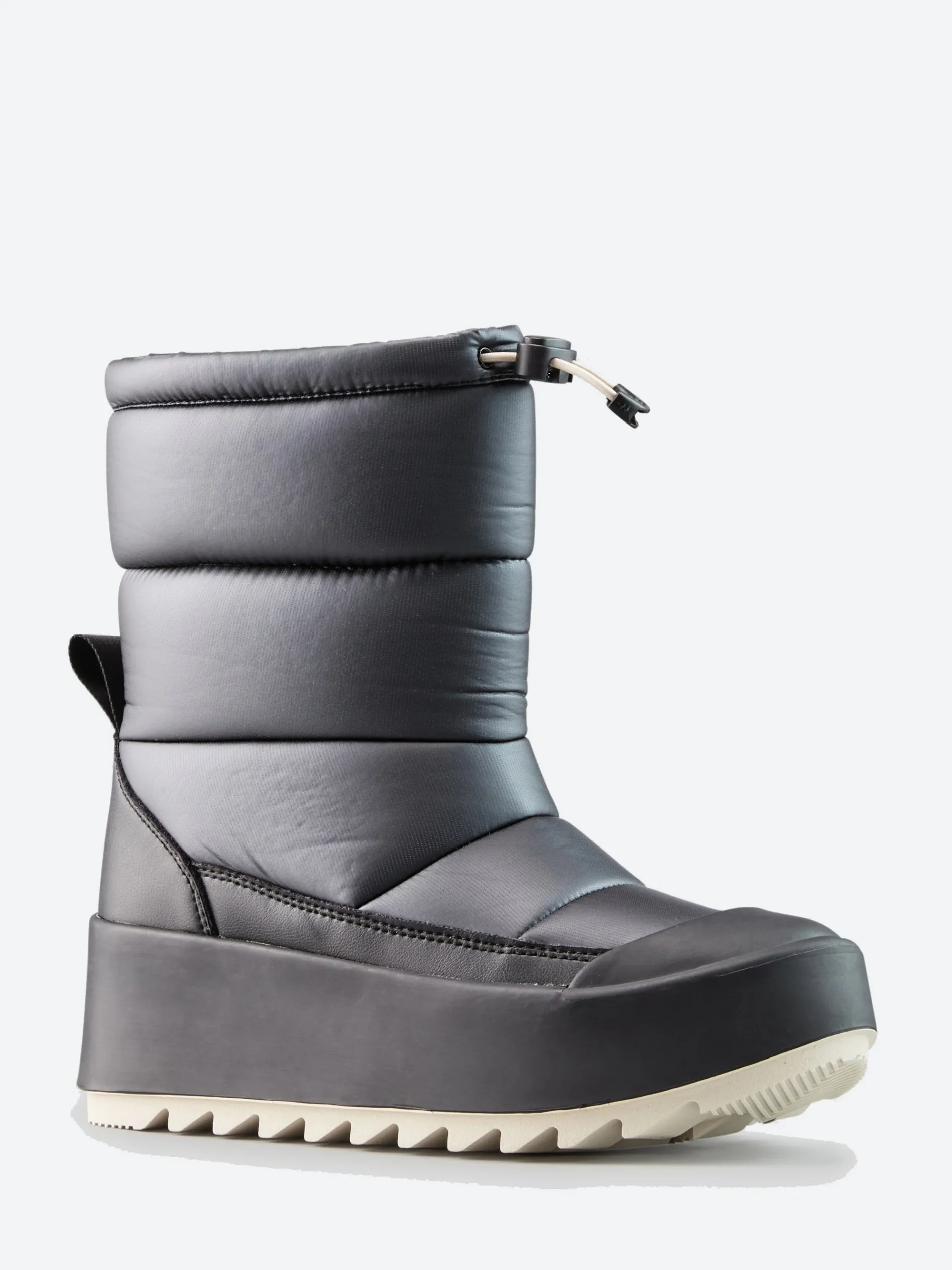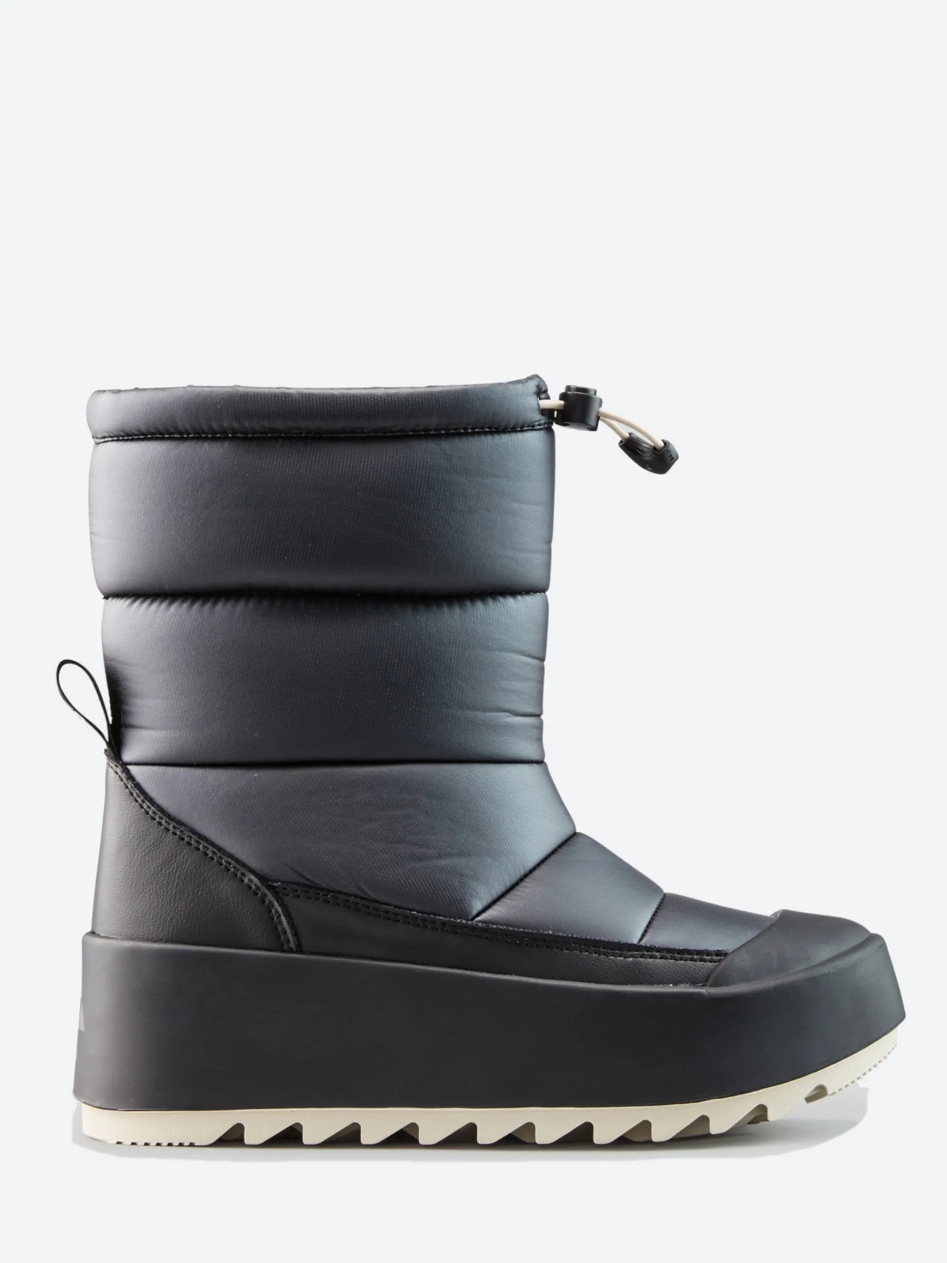 Mid-height nylon pull-on boot with a padded shaft and quilt detail stitching. Two colour rubber shell with injected EVA wedge sole.