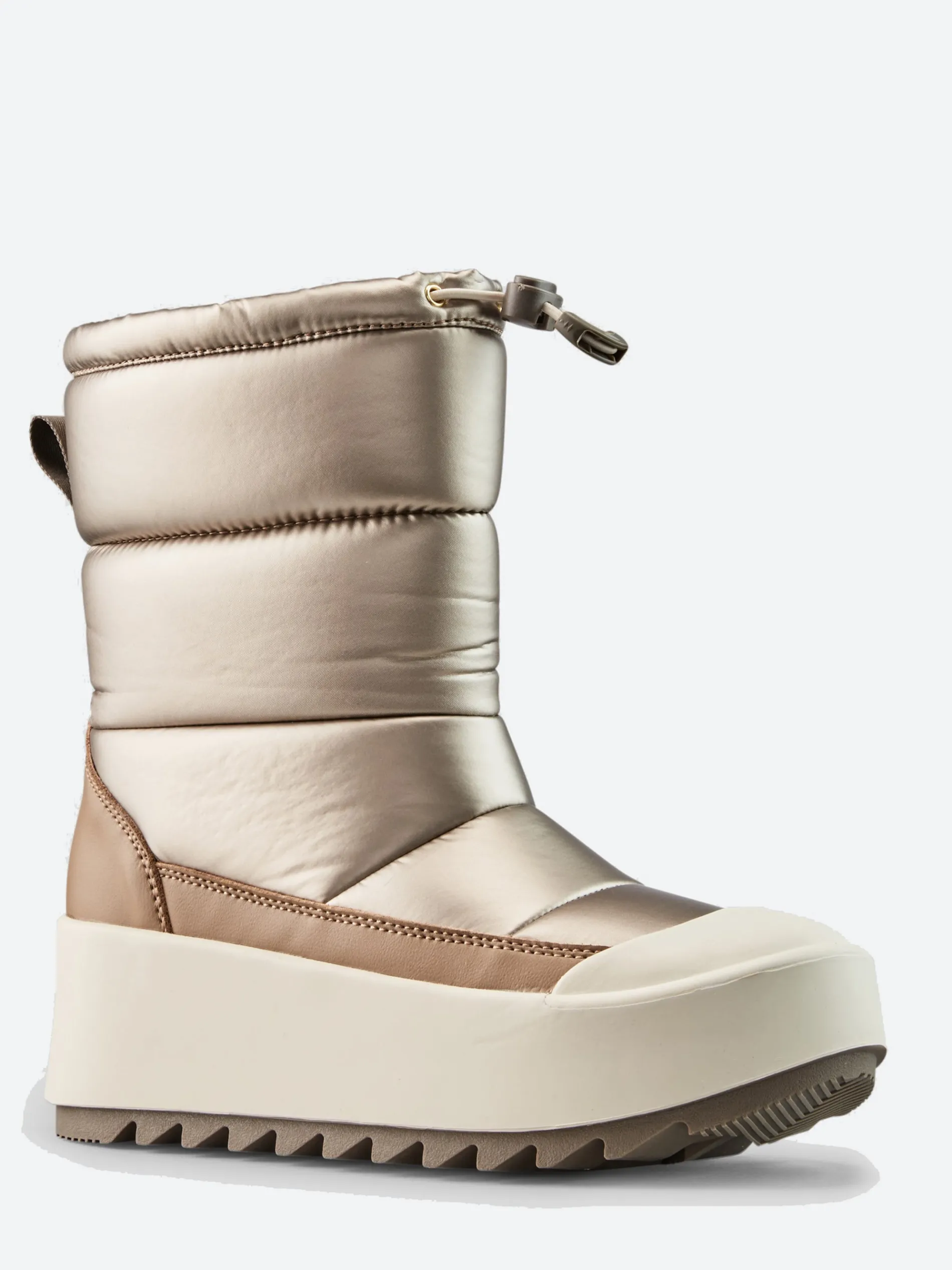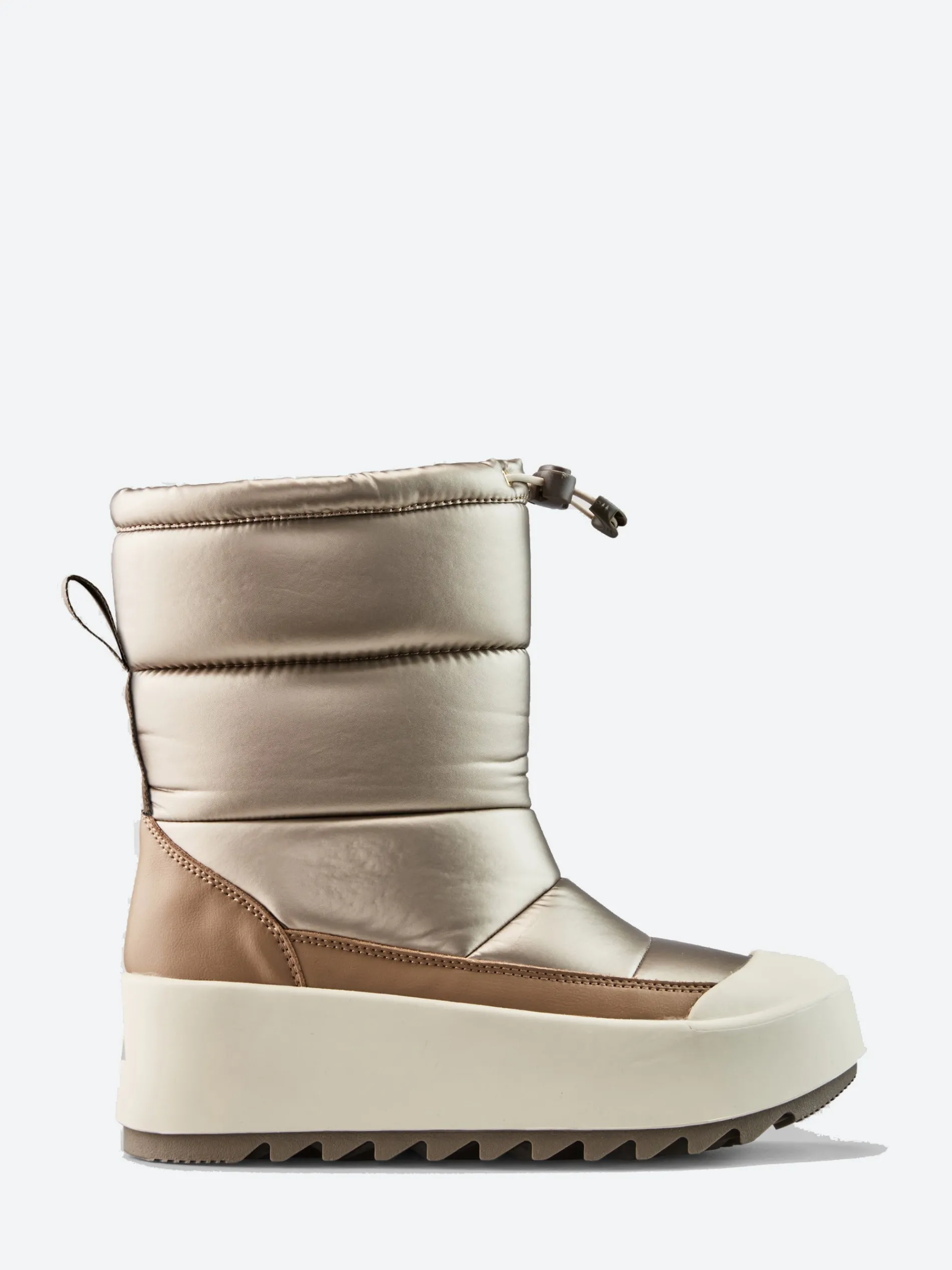 Mid-height nylon pull-on boot with a padded shaft and quilt detail stitching. Two colour rubber shell with injected EVA wedge sole.