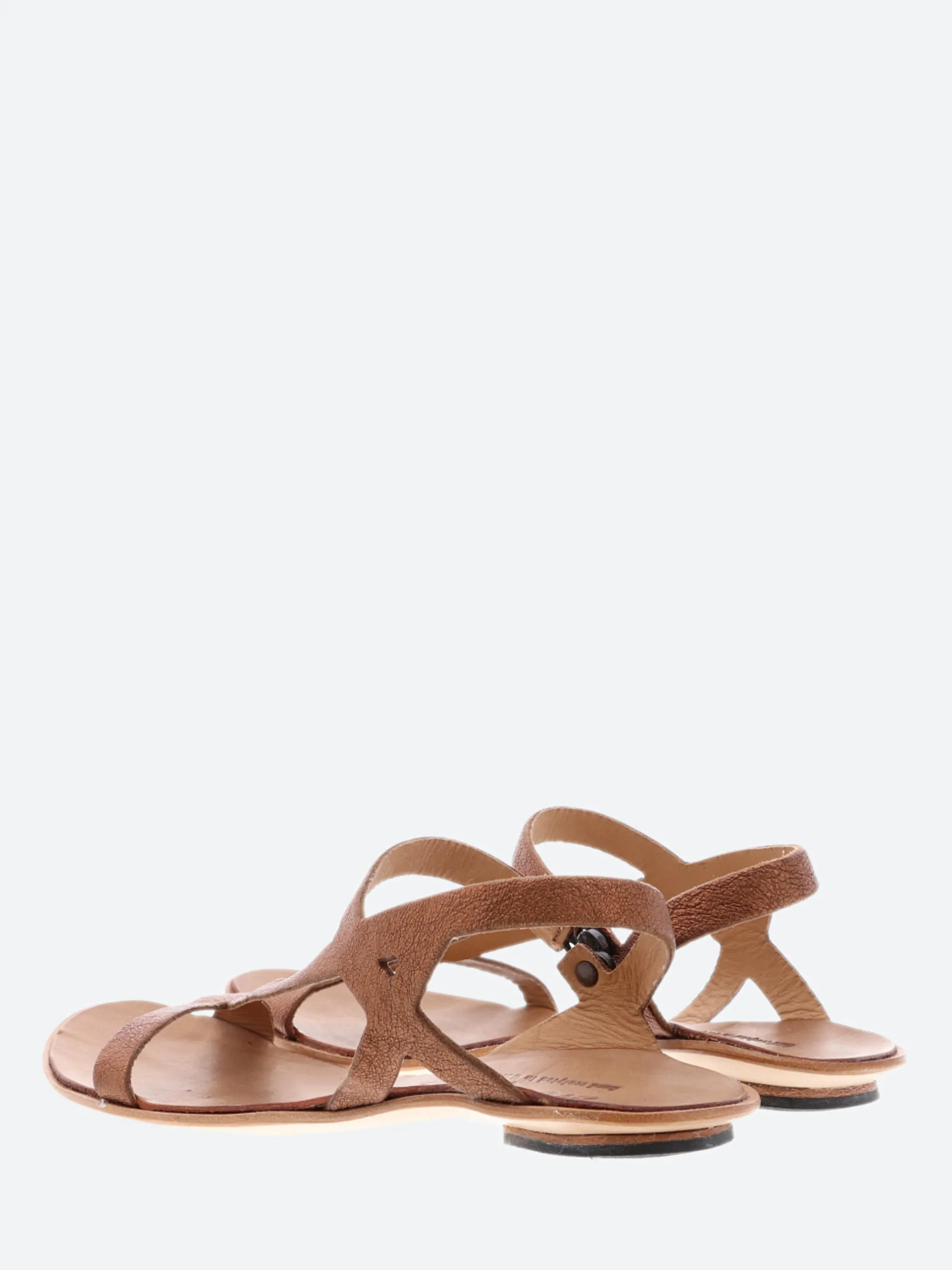 Crafted from Italian leather, a single strap zig zags across your foot and is secured with a loop-an-button closure.