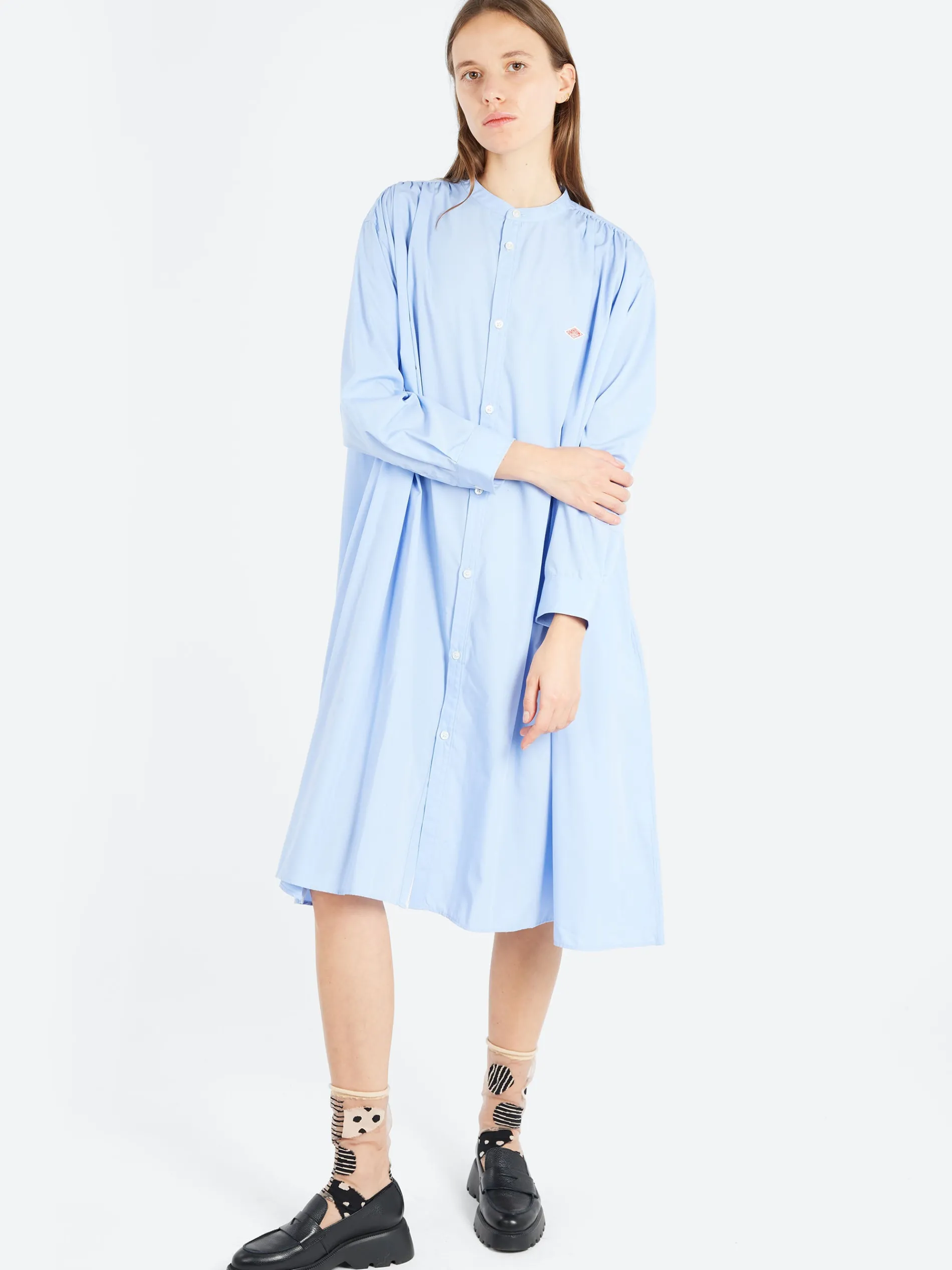 A shirt dress with gathered yoke seams on both the front and back. Made of high-density broad cloth combined with polyester and cotton.