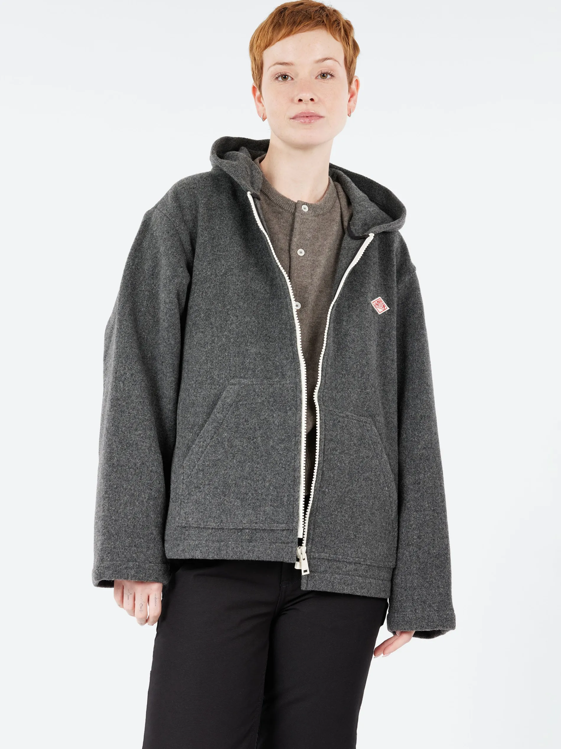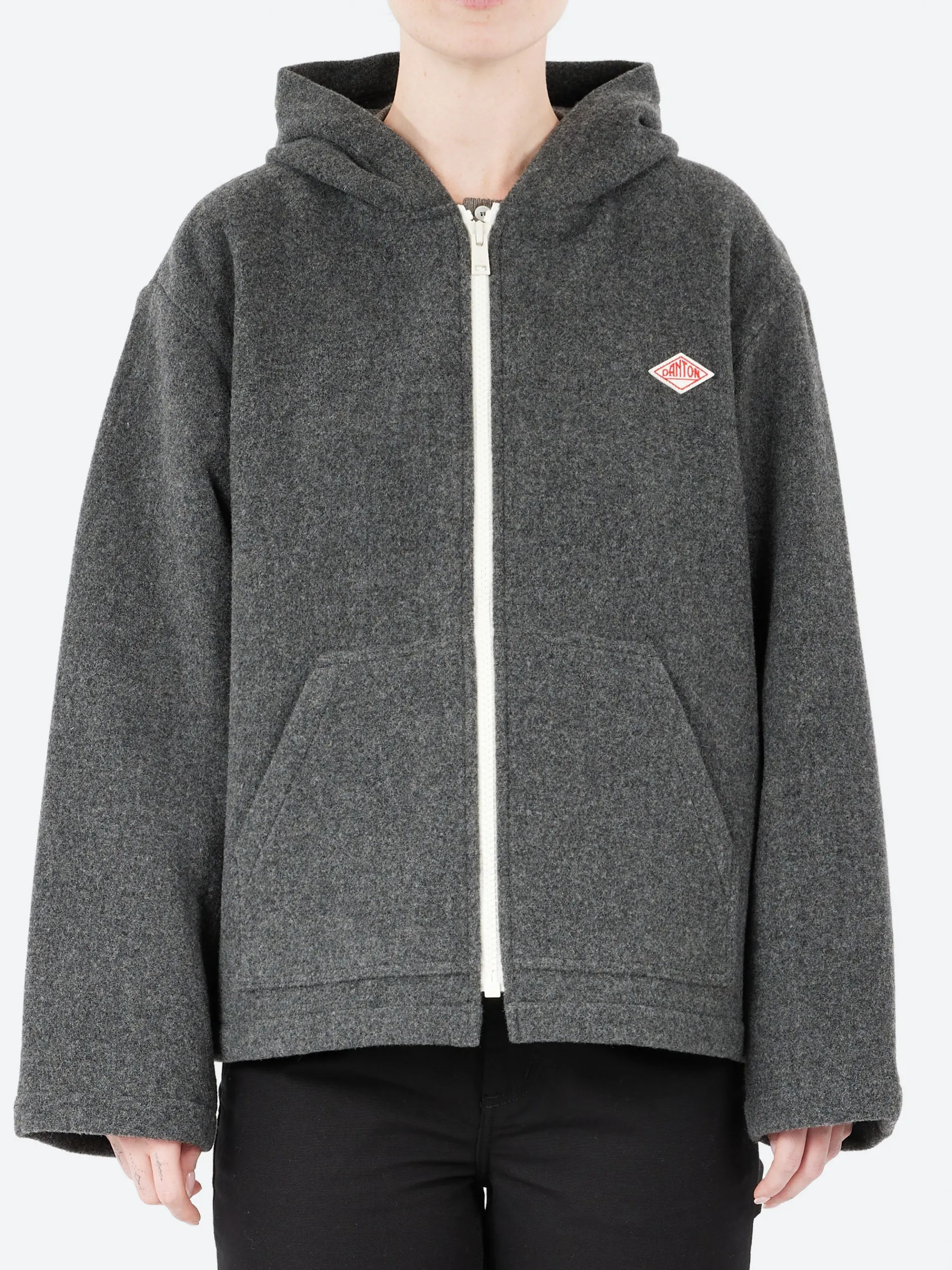 Danton hooded jacket with wide silhouette. Made from a double-faced wool pile with texture.