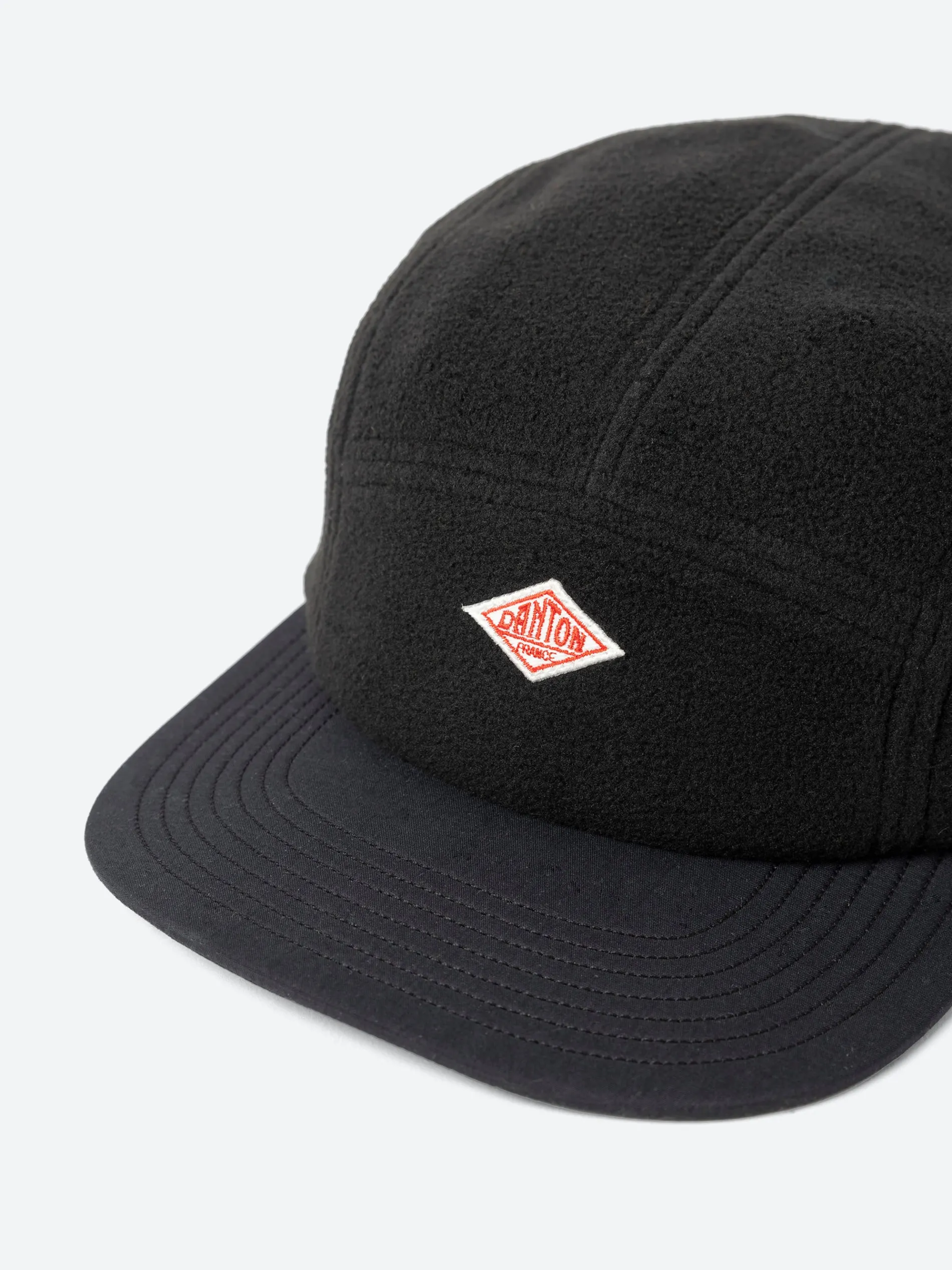 Two tone five panel micro fleece cap with an adjustable strap at the back.
