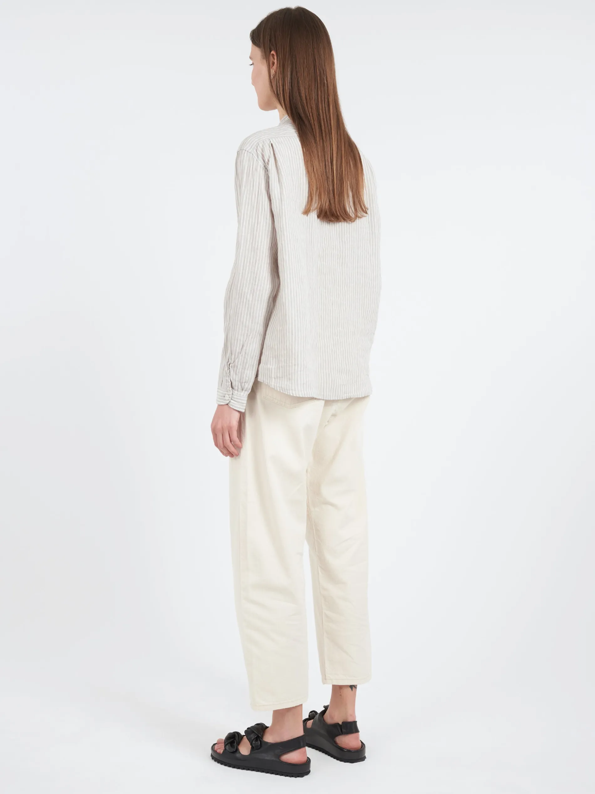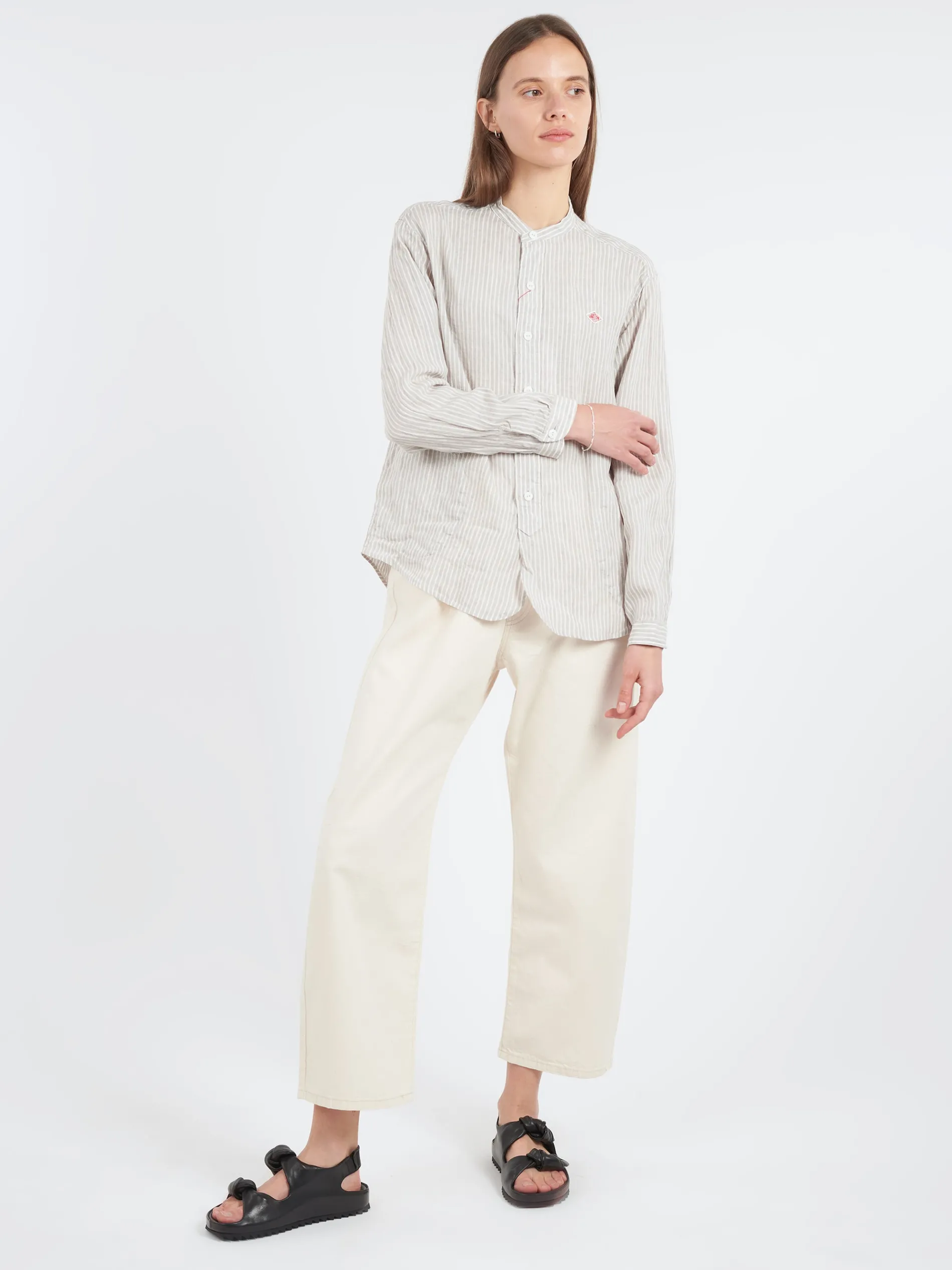 Danton button-up shirt with a band collar and rounded pockets at the sides.