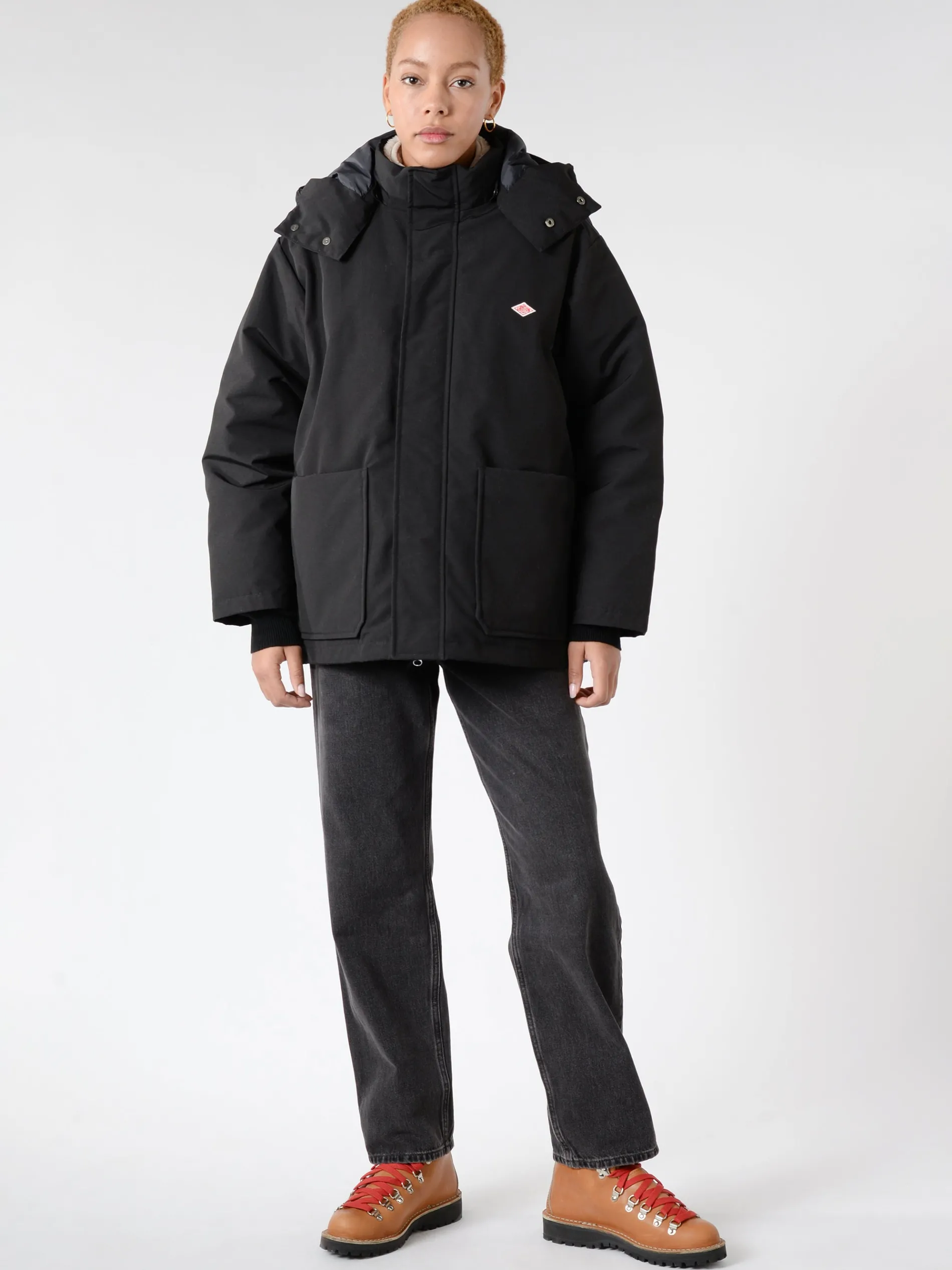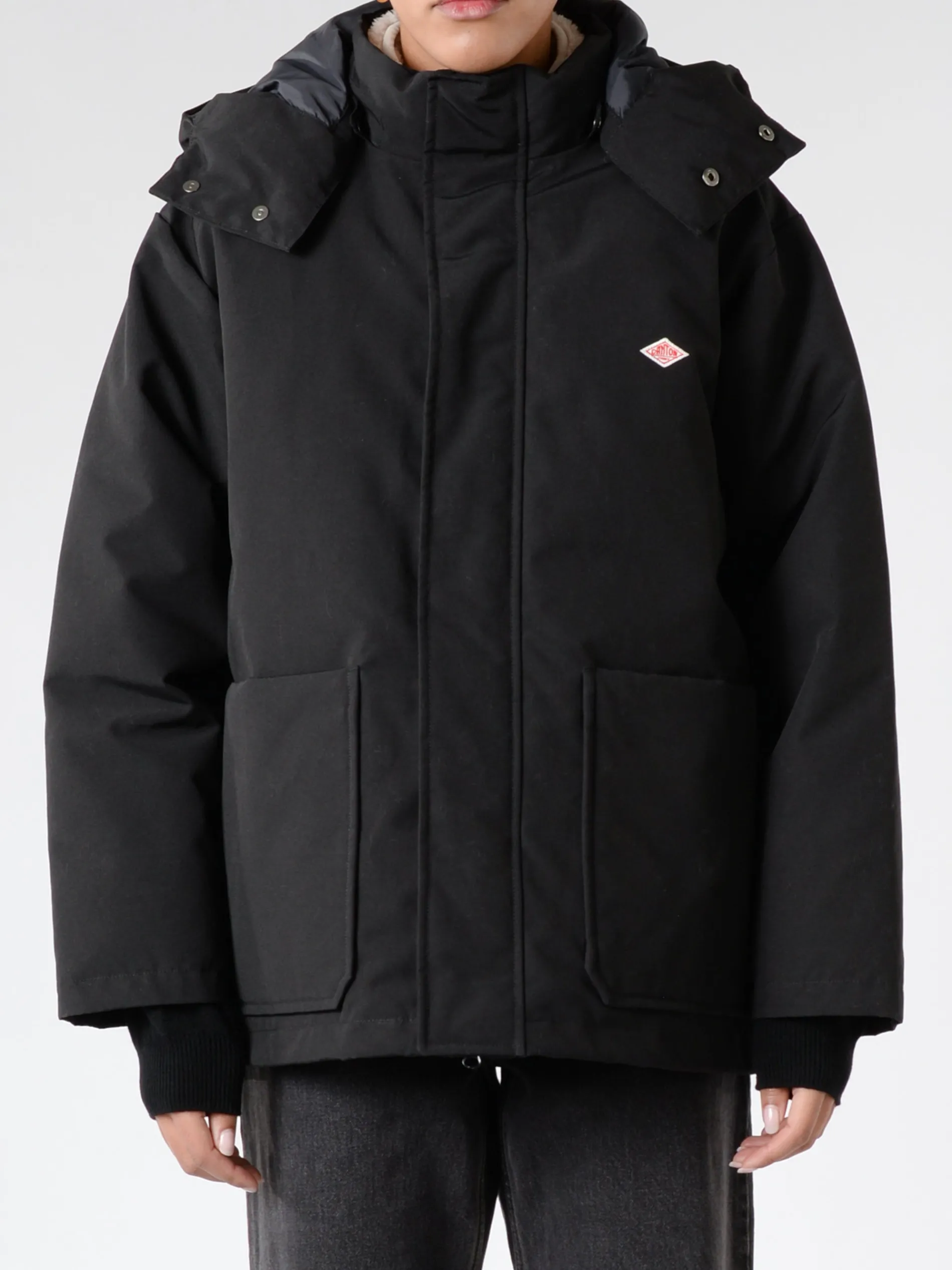 Danton hooded down jacket with an A-line silhouette. Made from a polyester-cotton blended tussah fabric.