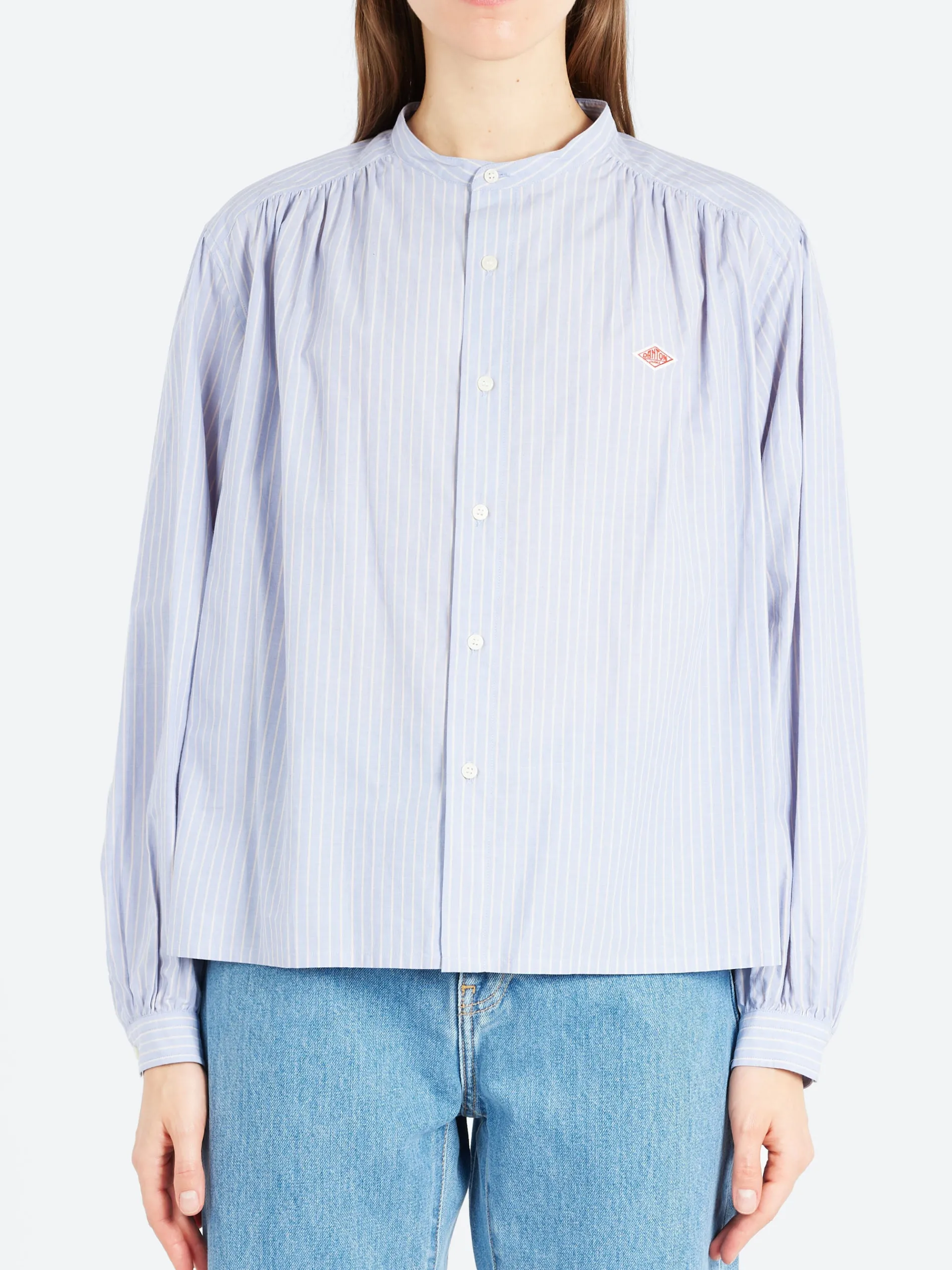 A band collar shirt with shorter length. Made from a high density typewriter cloth woven with delicate striped design.
