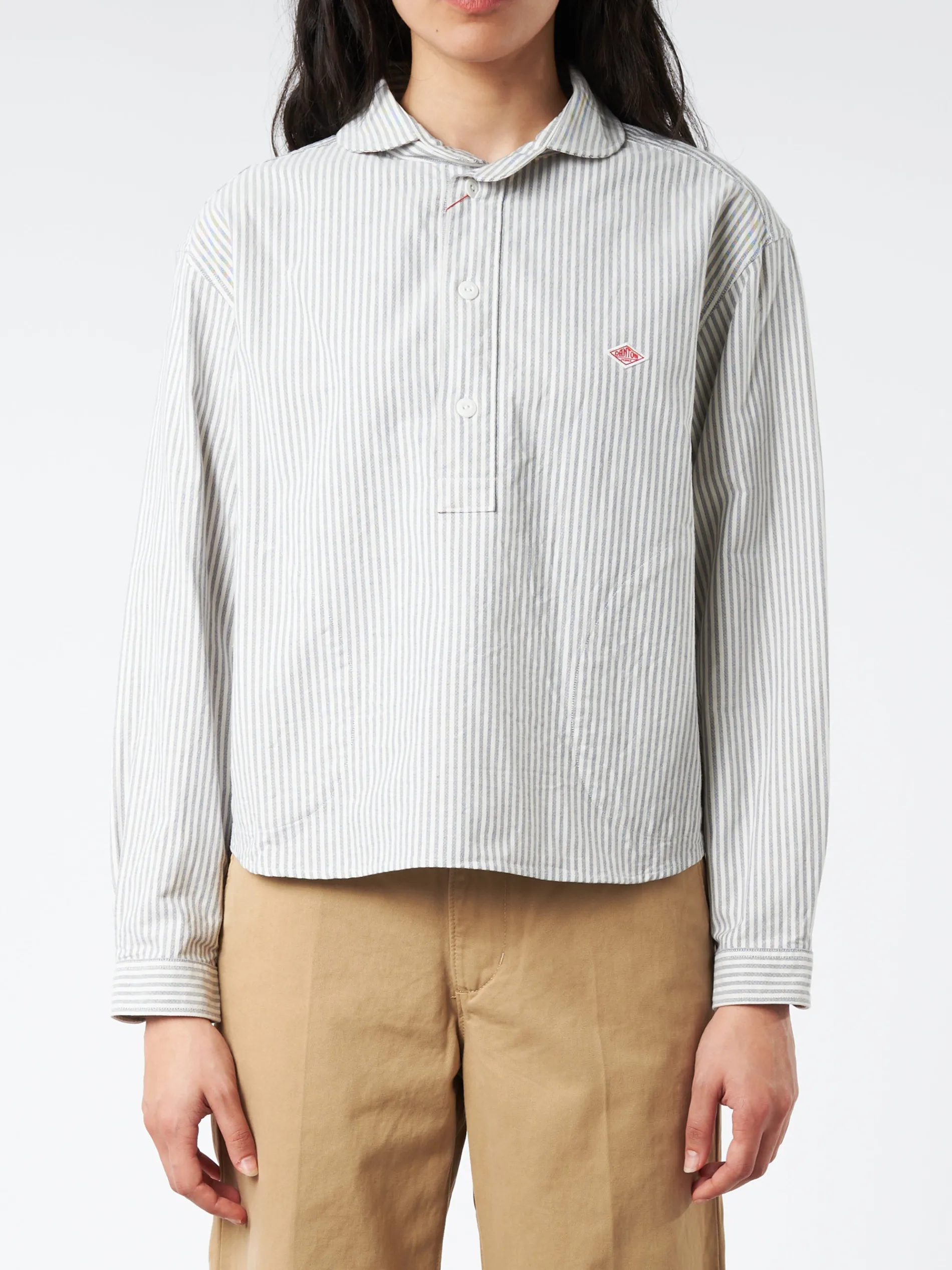 Danton’s signature round collar shirt with newly designed wide silhouette. Made with Japanese oxford fabric woven with high quality supima cotton, which is known for its extra-fine quality and texture.