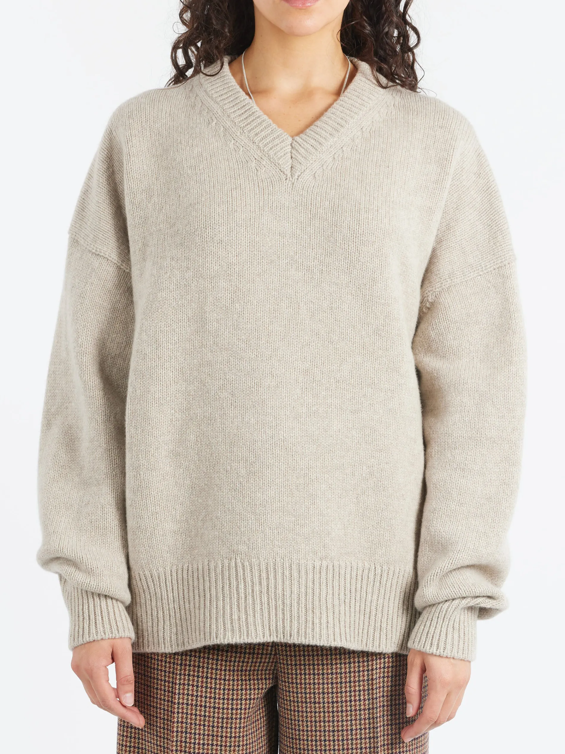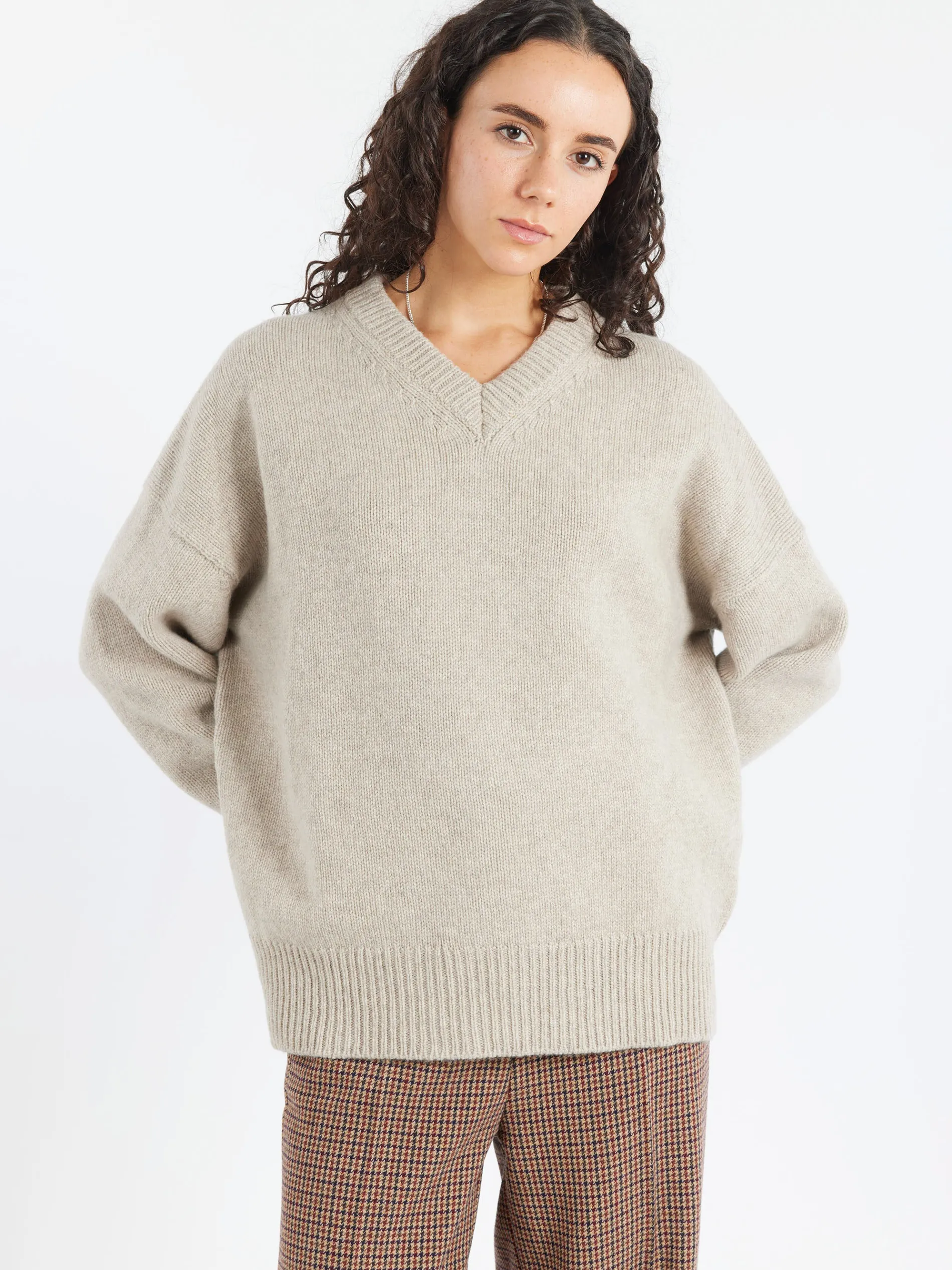 The soft elegance of a boyish V-neck collar. The Balla V is crafted in a chunky 5-gauge weight for a beautifully soft hand-feel and tactile warmth. Subtly draped and gently oversized.