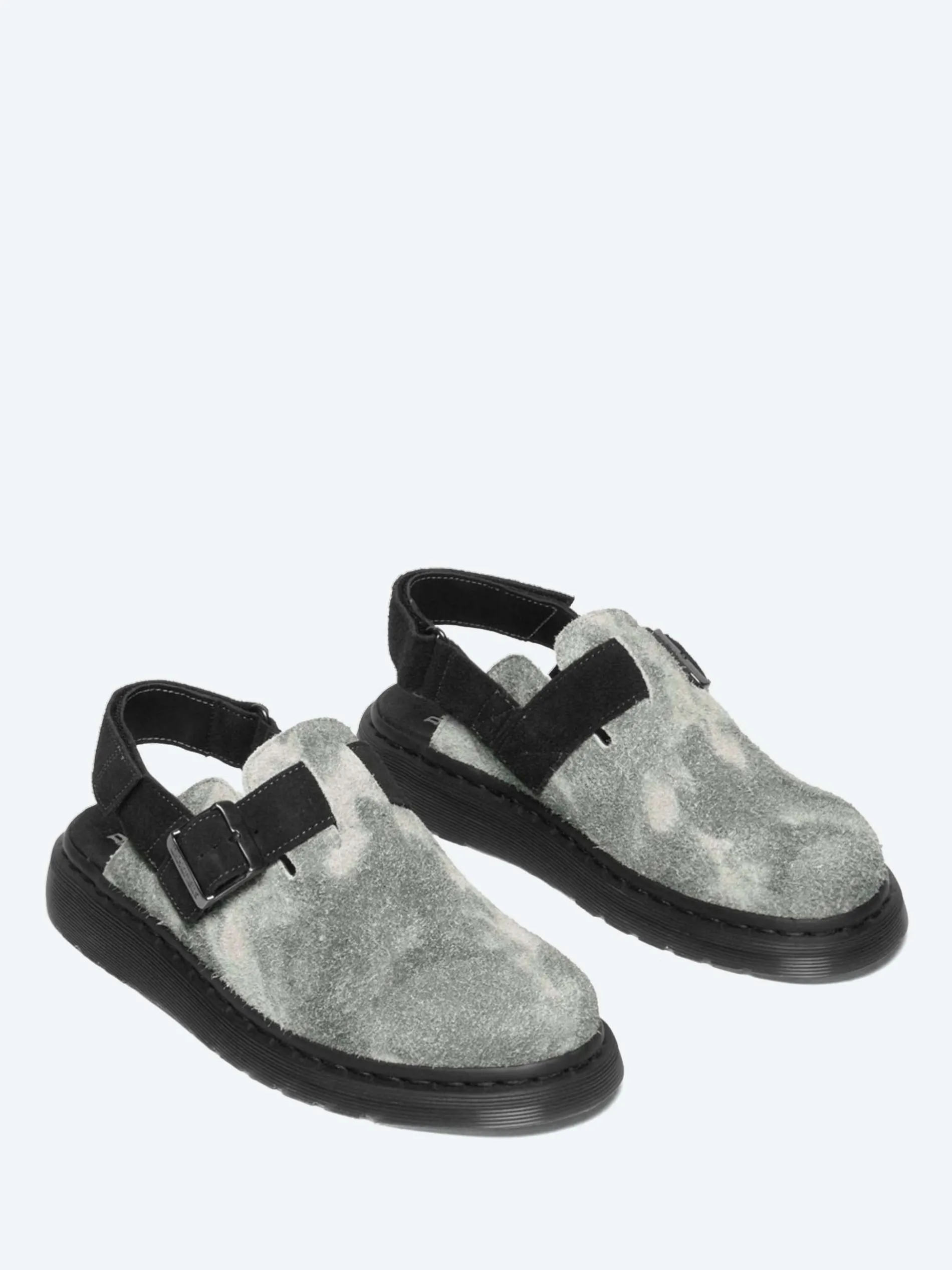 Dialed up with a distressed, worn-in-looking material, Dr. Martens slip-on Jorge mule returns in newly tanned Stonewashed Hairy suede. Part shoe, part sandal, the versatile mule is fitted with gunmetal buckles for a secure fit.