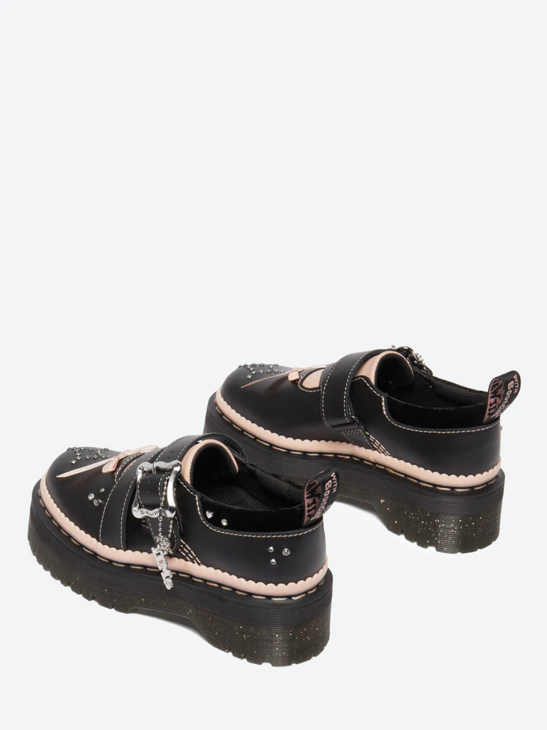 Dr. Martens new Kemsley shoe is covered heel to toe with playful details and bursts of color. A shiny silver buckle, DM’s branded charm, velvet ribbons, embroidery, and diamante detailing. With padding around the ankle and a statement pink tongue. The platform Quad sole is infused with glitter, secured with powder pink welt stitching, and detailed with a powder pink scalloped rand. The heel loop is also signed in powder pink script.