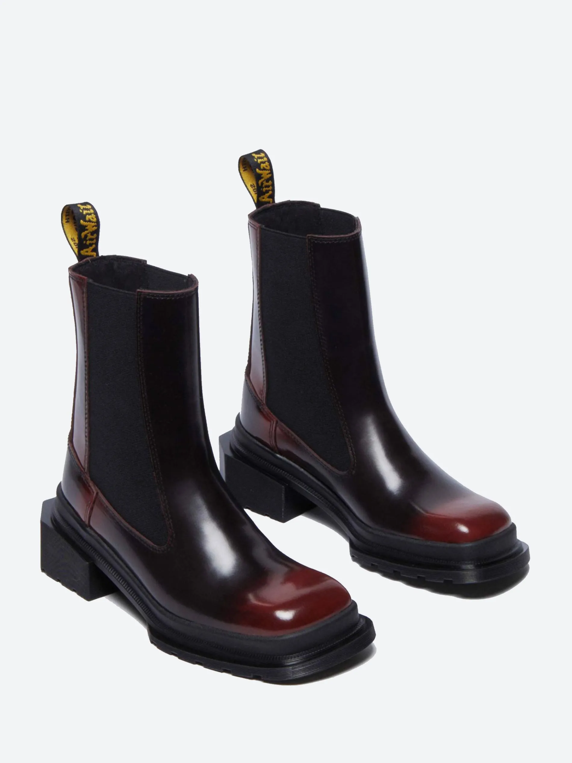 Dr. Martens new slip-on Maybole Chelsea boot has a square toe upper, emphasized and exaggerated by an extended, angular new sole. The boot is fitted with extra-long elastic panels for easy on-off wear.
