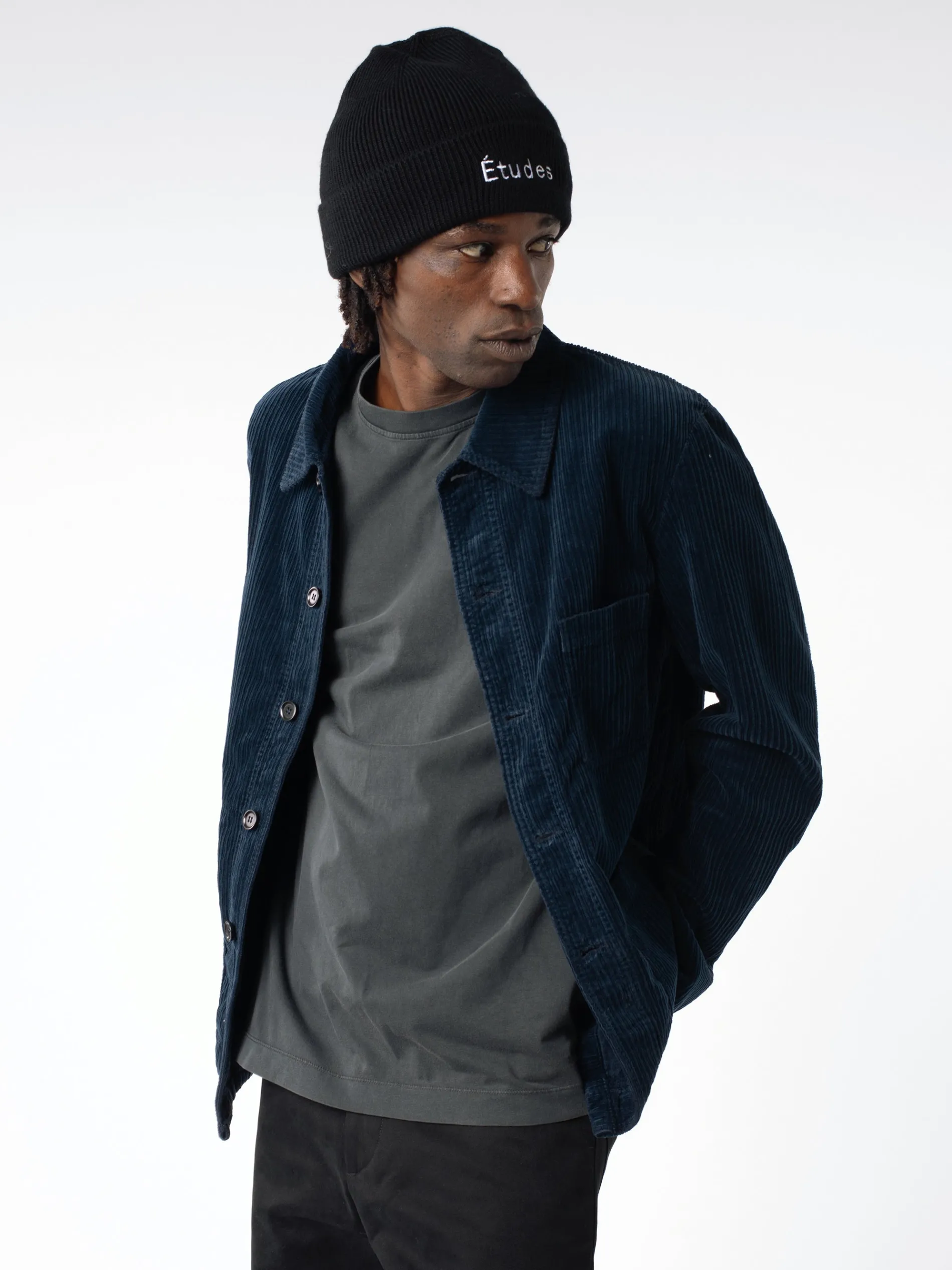 The Beanie Études is a rib knit wool beanie with an embroidery of the Études logo in white at rolled brim.