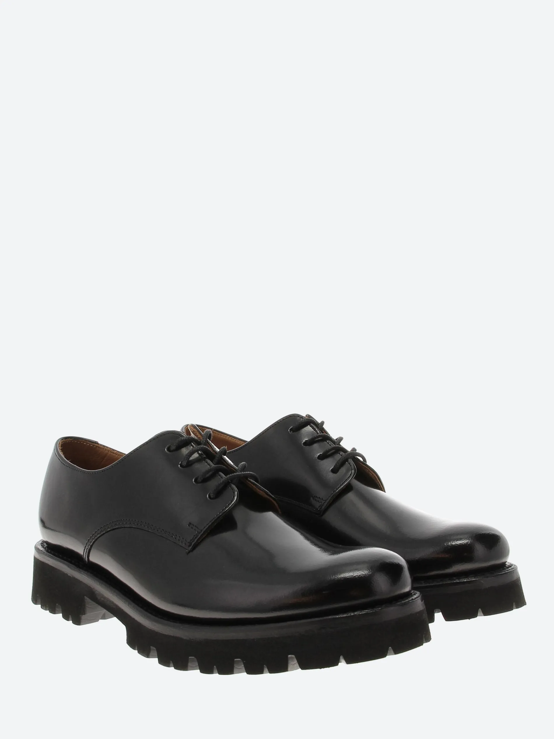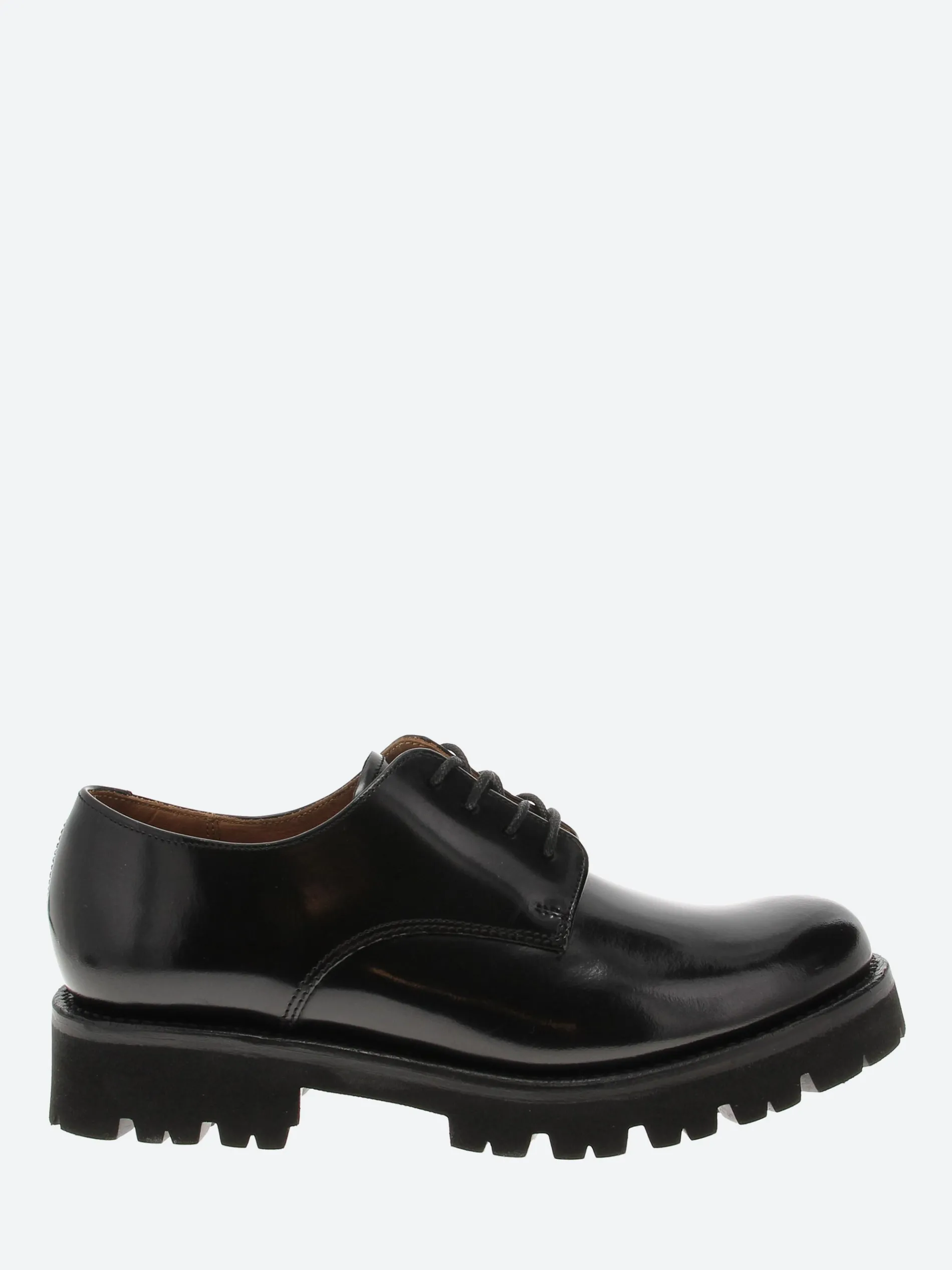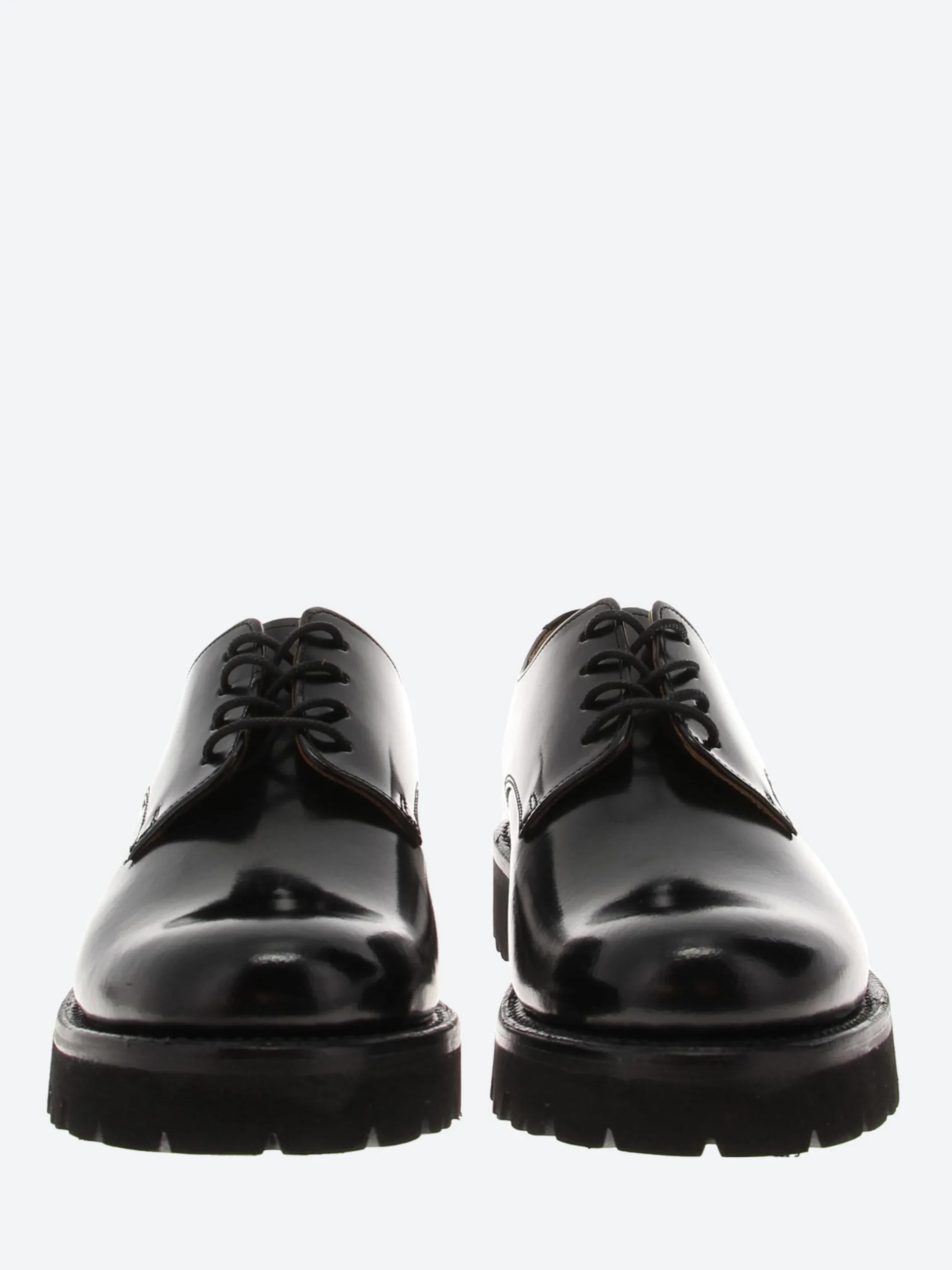 Grenson Evie is their signature women’s derby shoe. Made in polished black hi shine leather on a chunky, but lightweight commando sole.