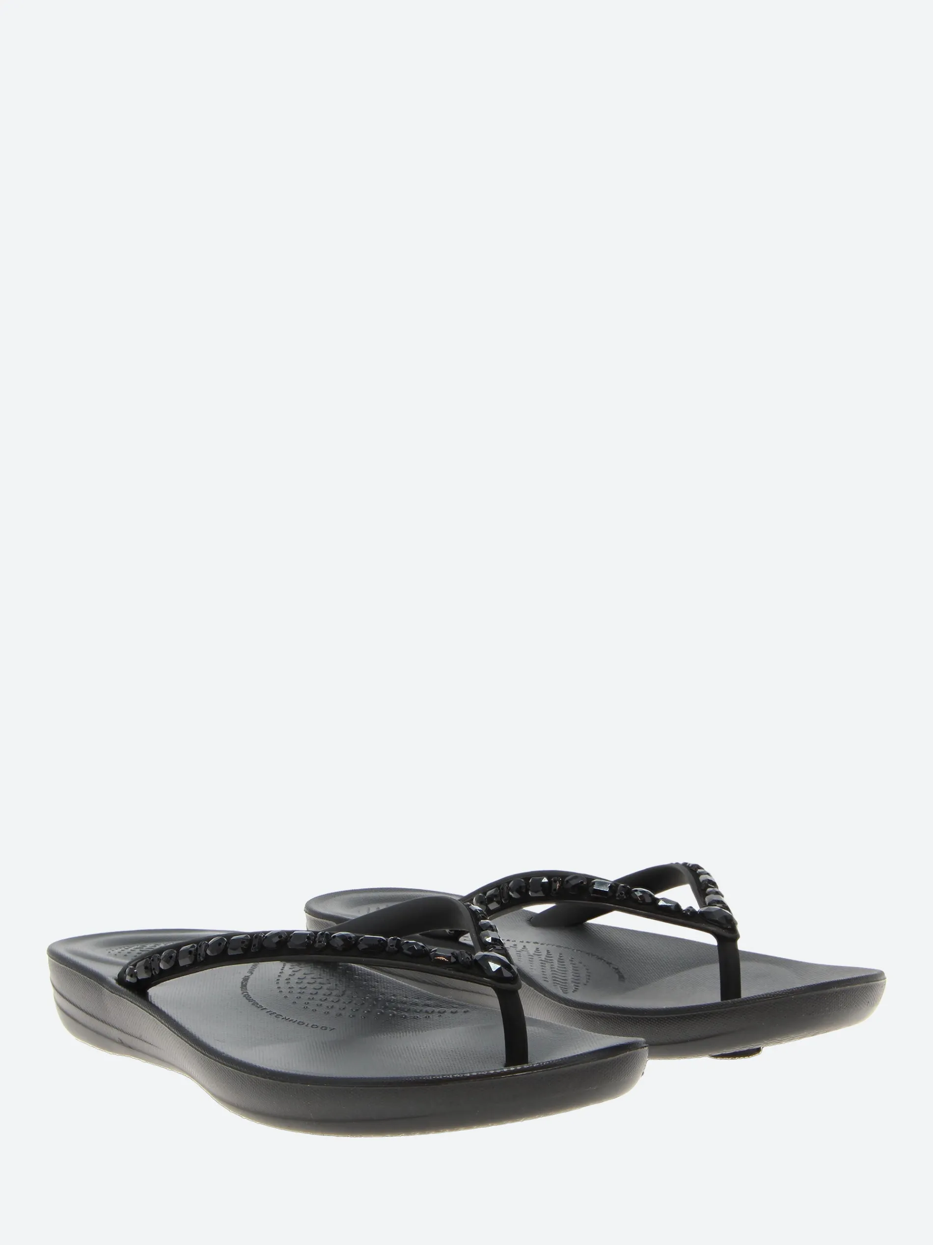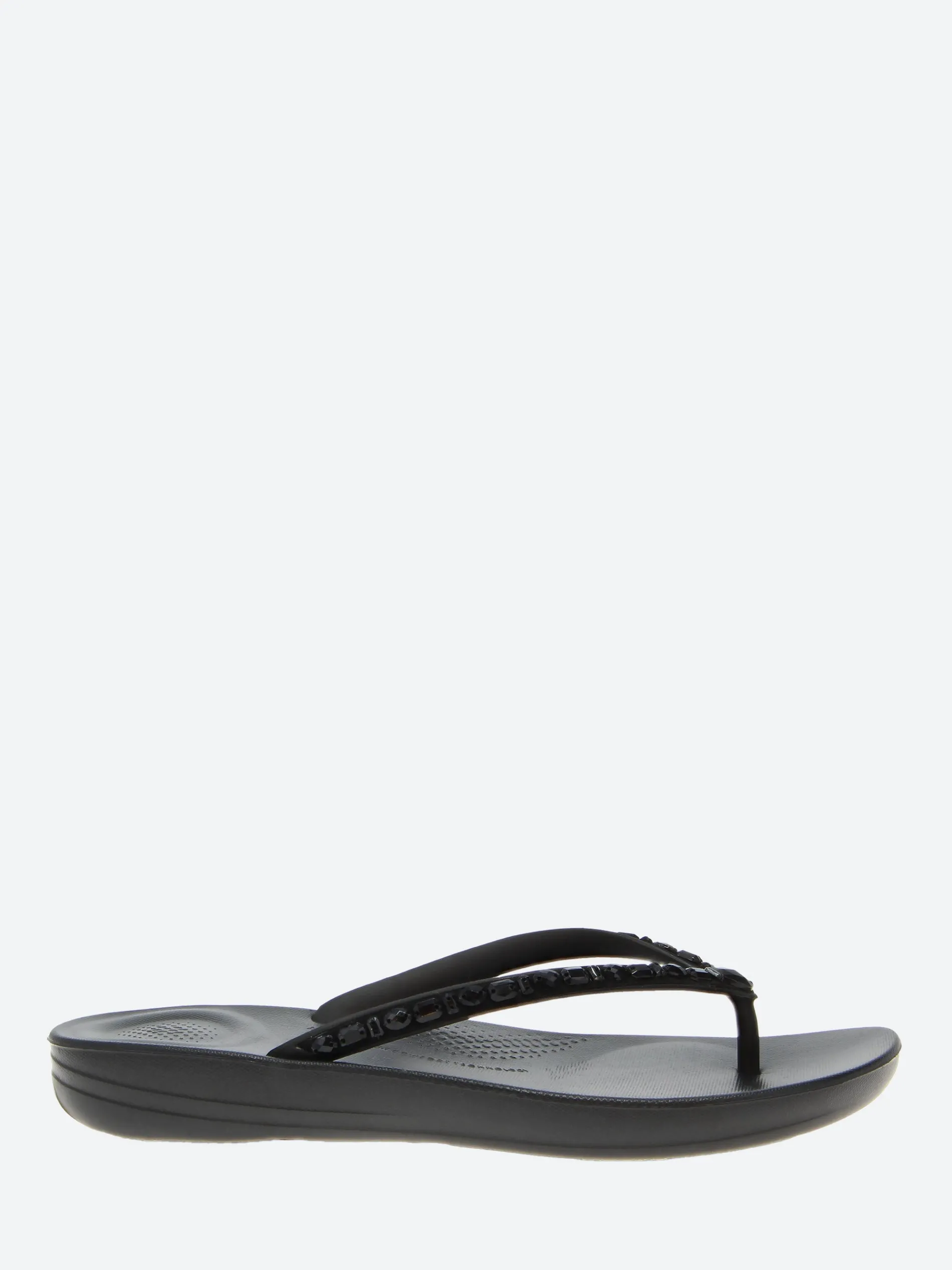 The FitFlop iQushion Multi-Crystal Ergonomic Flip Flops are a stylish and comfortable footwear option designed for all-day wear. These flip flops feature FitFlop’s proprietary iQushion™ technology, which includes ultra-cushioned impact-absorbing pillows, ergonomic arch contouring, and rebound soles to provide superior comfort and support.