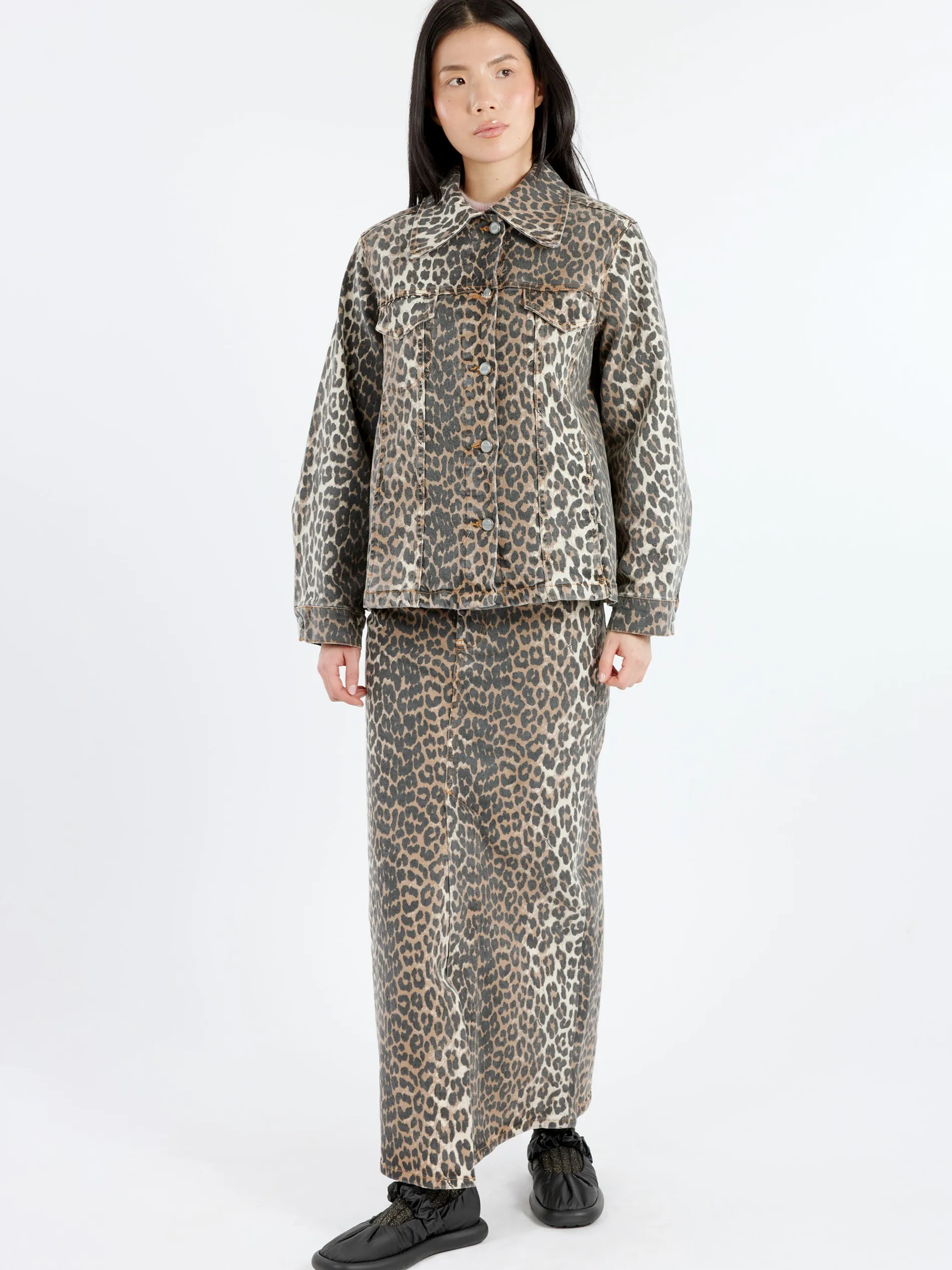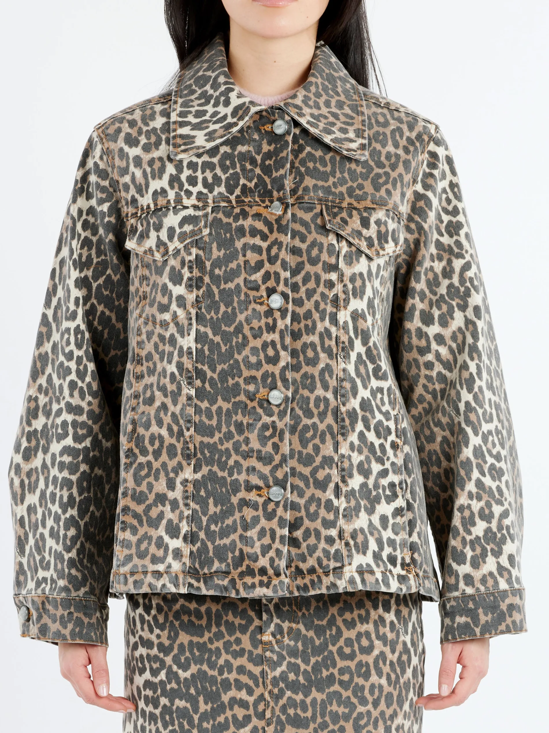 This Leopard Printed Denim Jacket features a collar, button closure, two front pockets and side pockets.