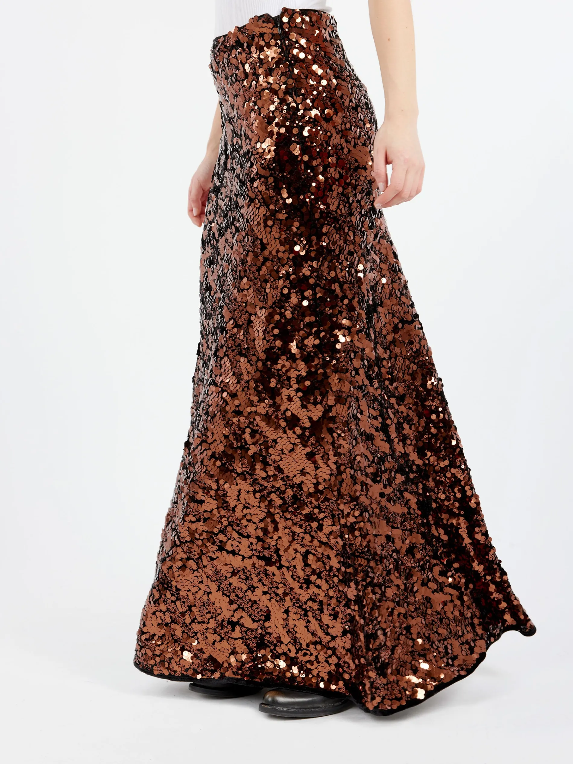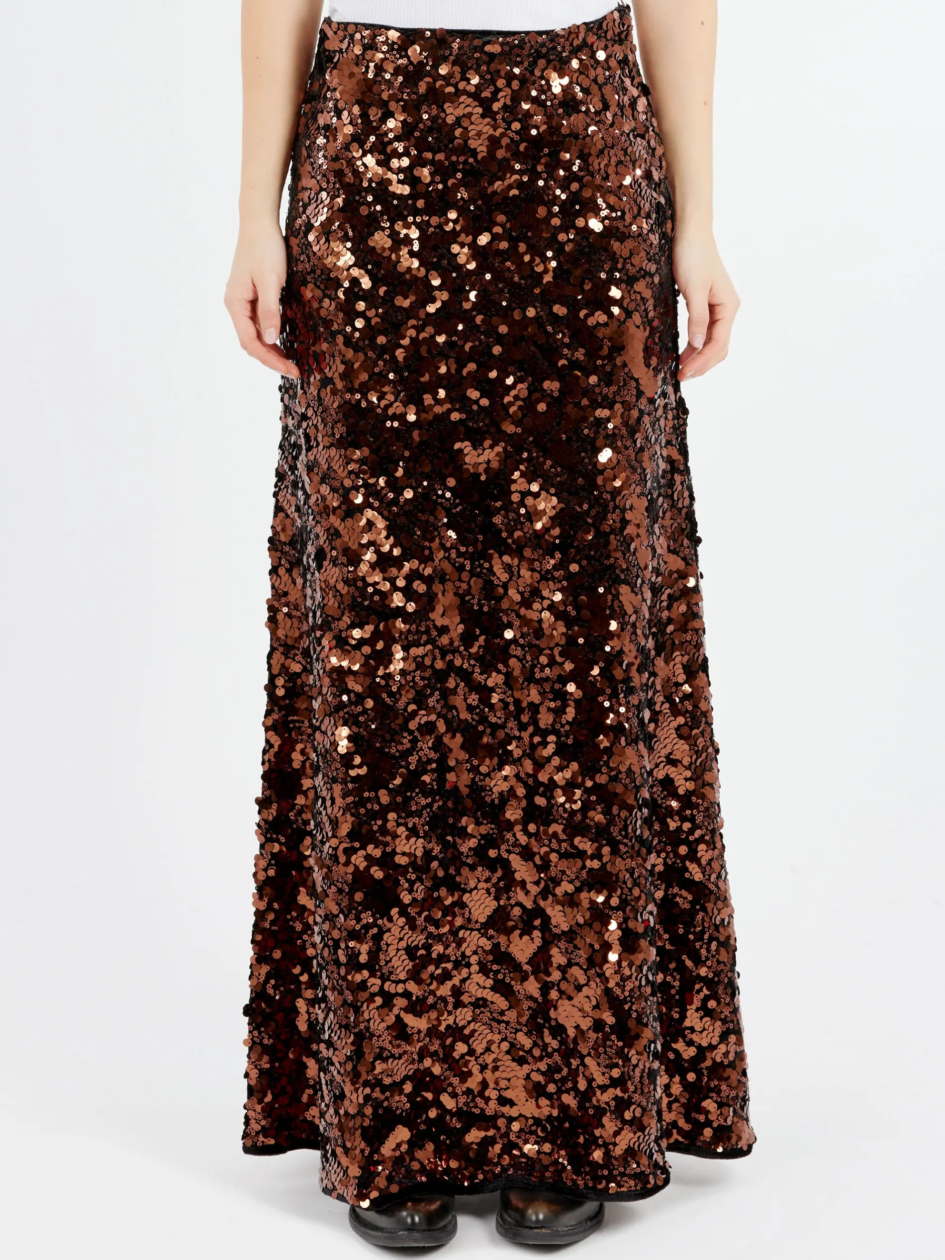 This Sequins Maxi Skirt features a zip closure at the side and all-over brown sequins.