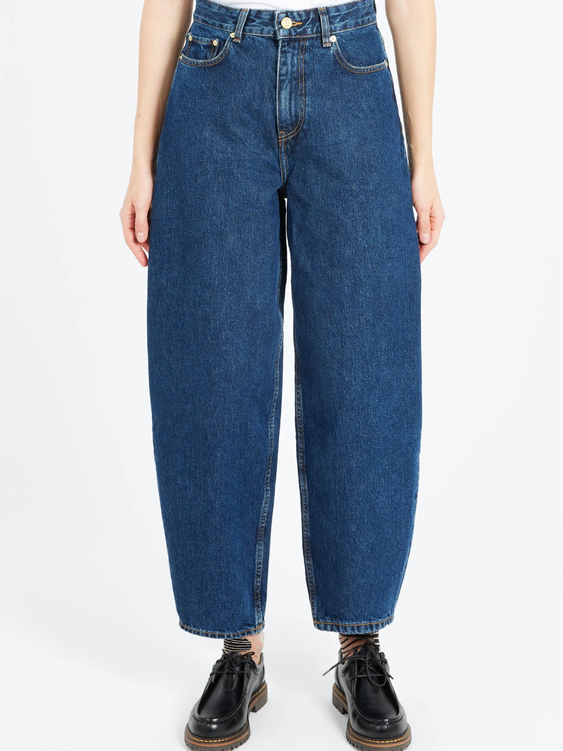 These Dark Blue Stary Jeans are designed for a fitted look at the waist and a relaxed fit through the hips and thighs with a curved-leg silhouette.