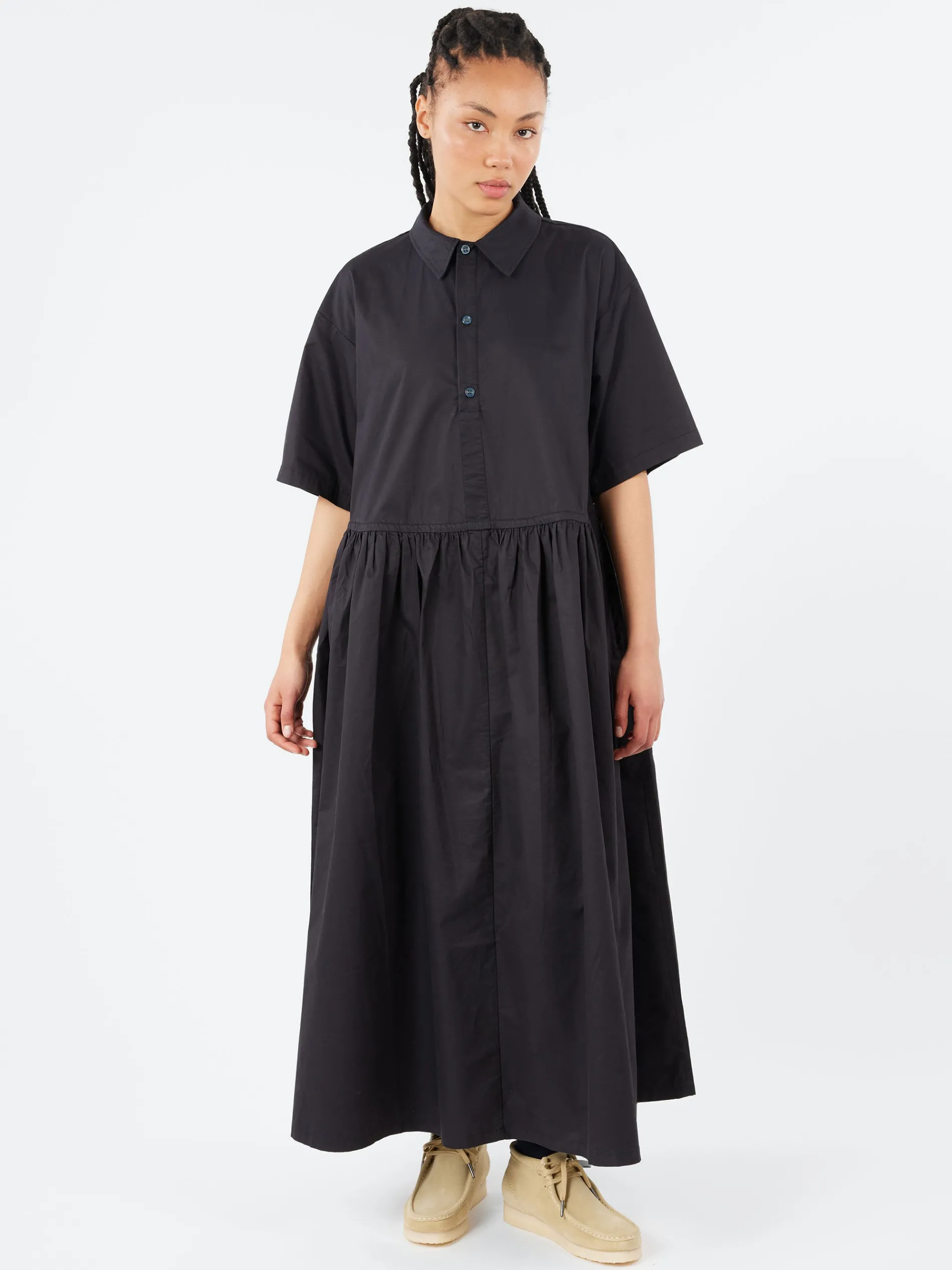 This button-up dress features an oversized silhouette that offers a relaxed and comfortable fit. The design gently narrows at the waist creating a flattering shape. The pleated detailing adds texture and movement. With short sleeves, it’s perfect for warmer days while keeping a breezy look.