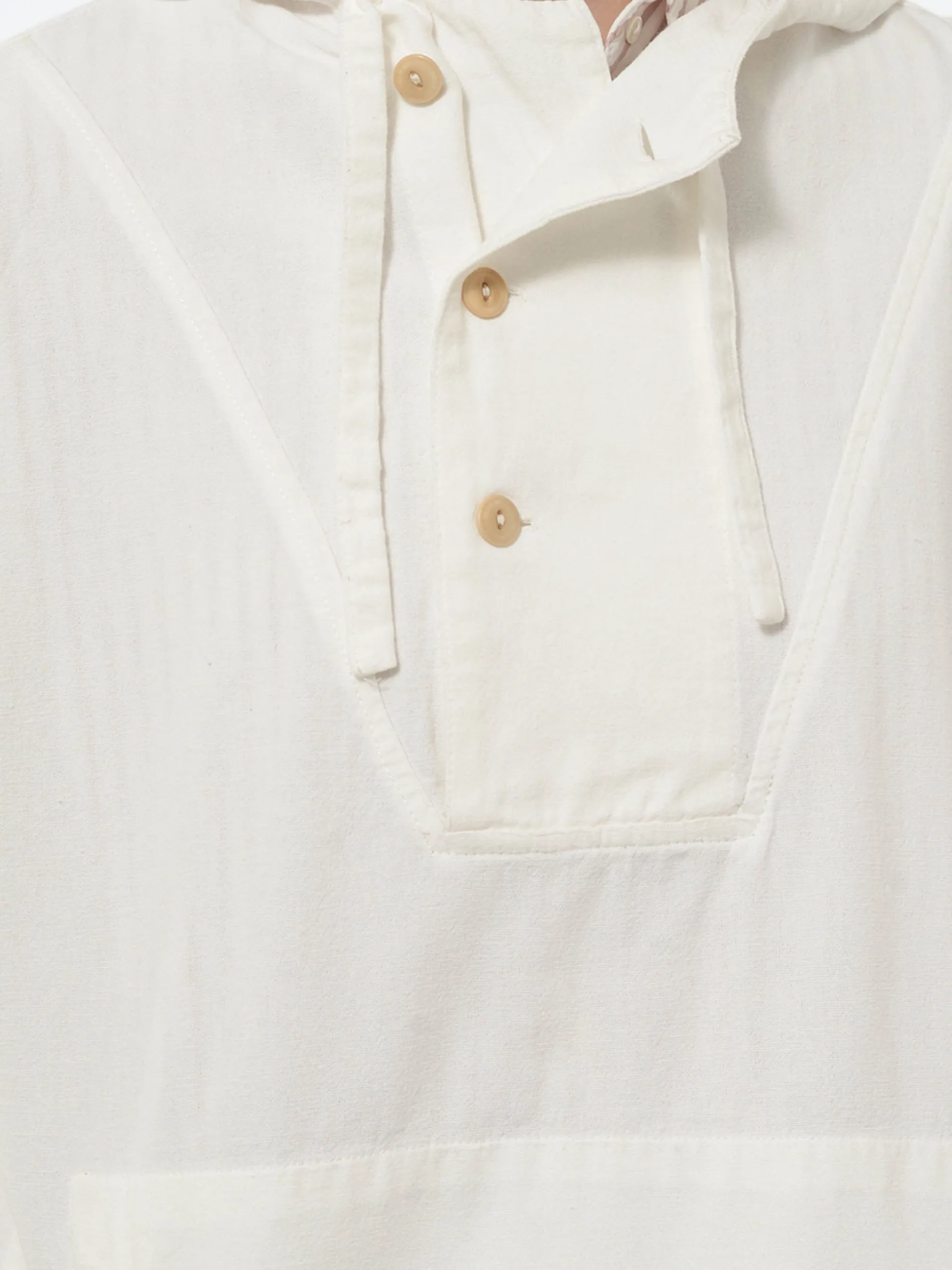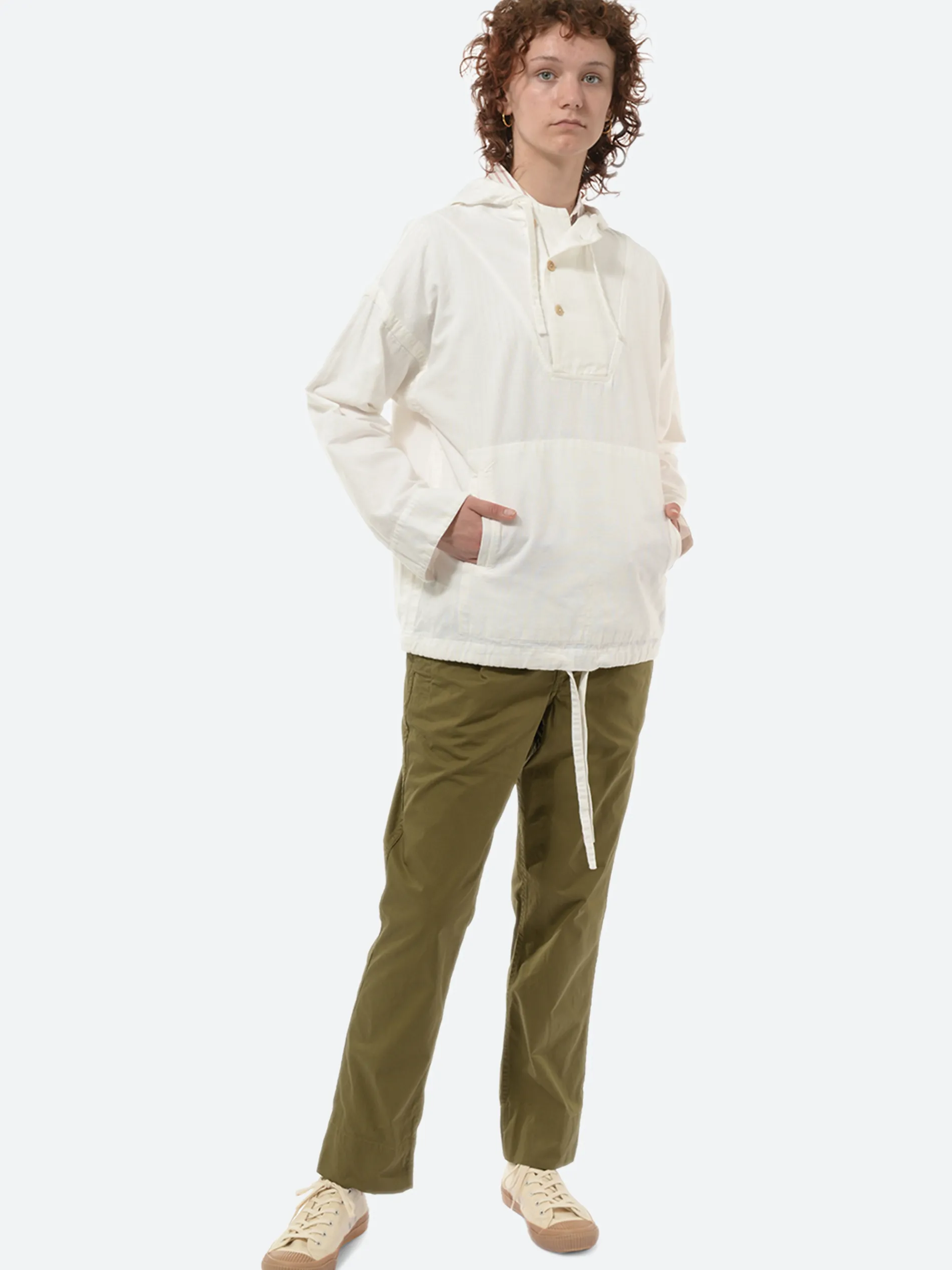 A hooded pull-on smock shirt that fits rather loose and comfy. Made from a premium raw cotton.