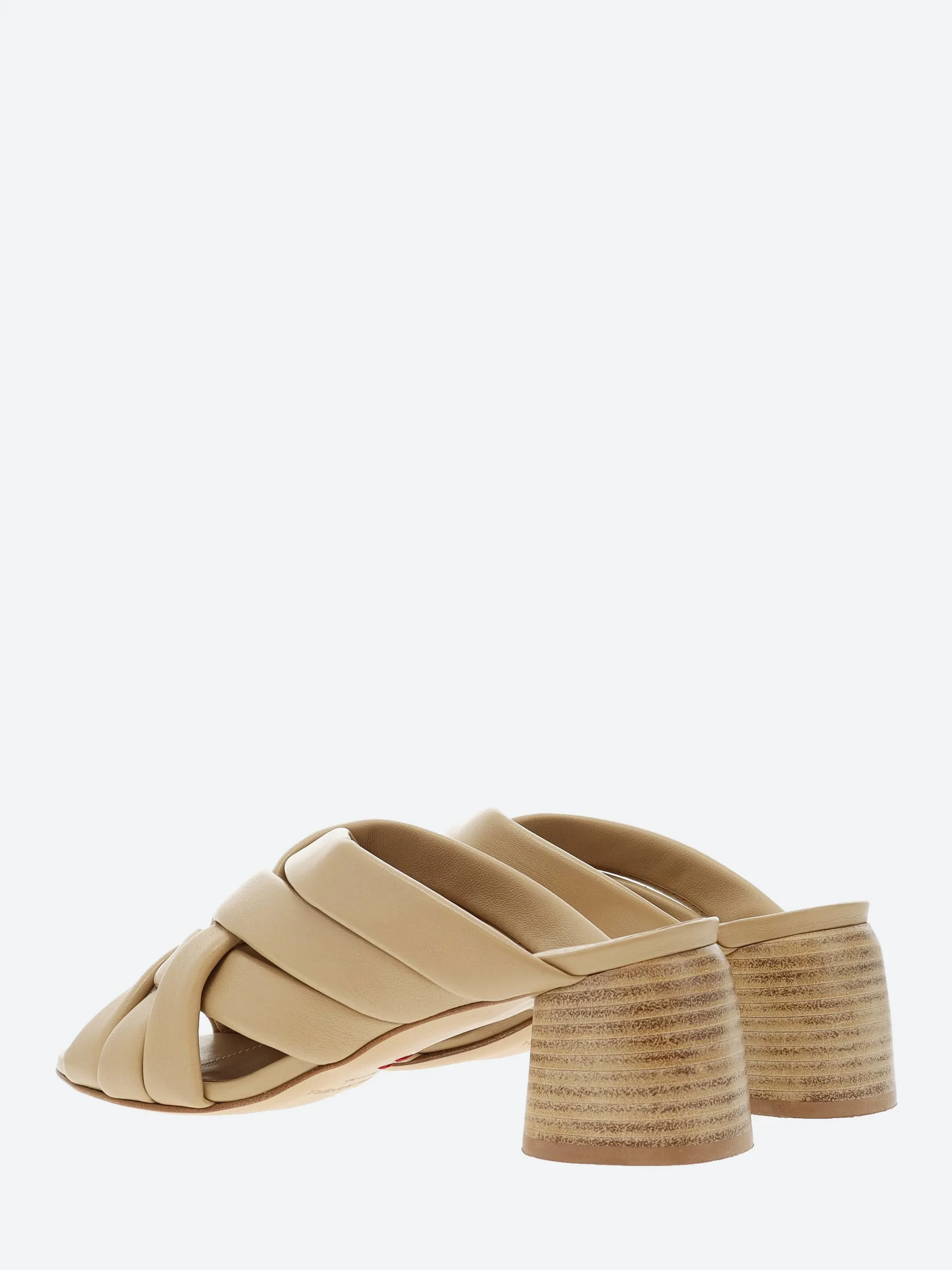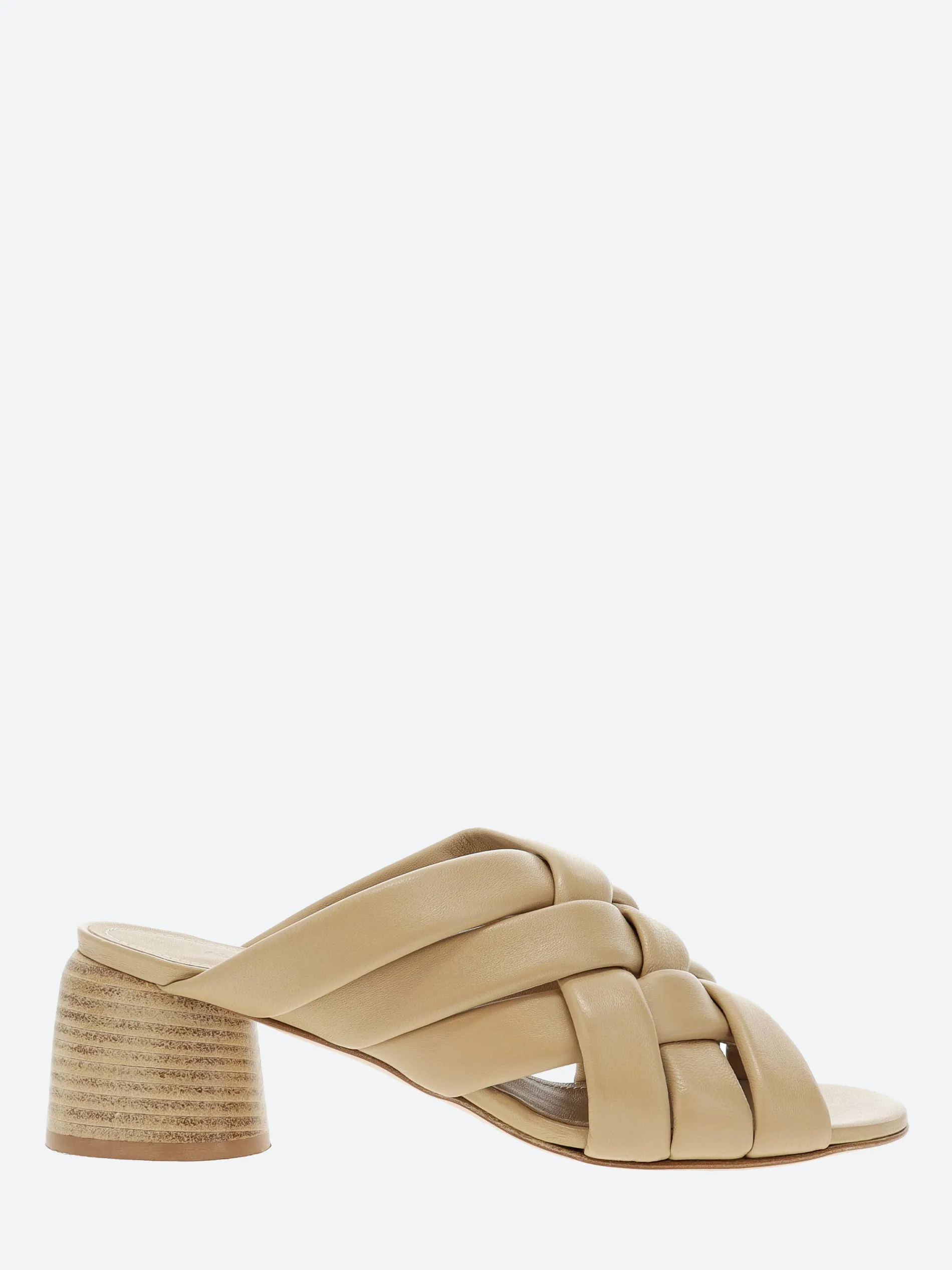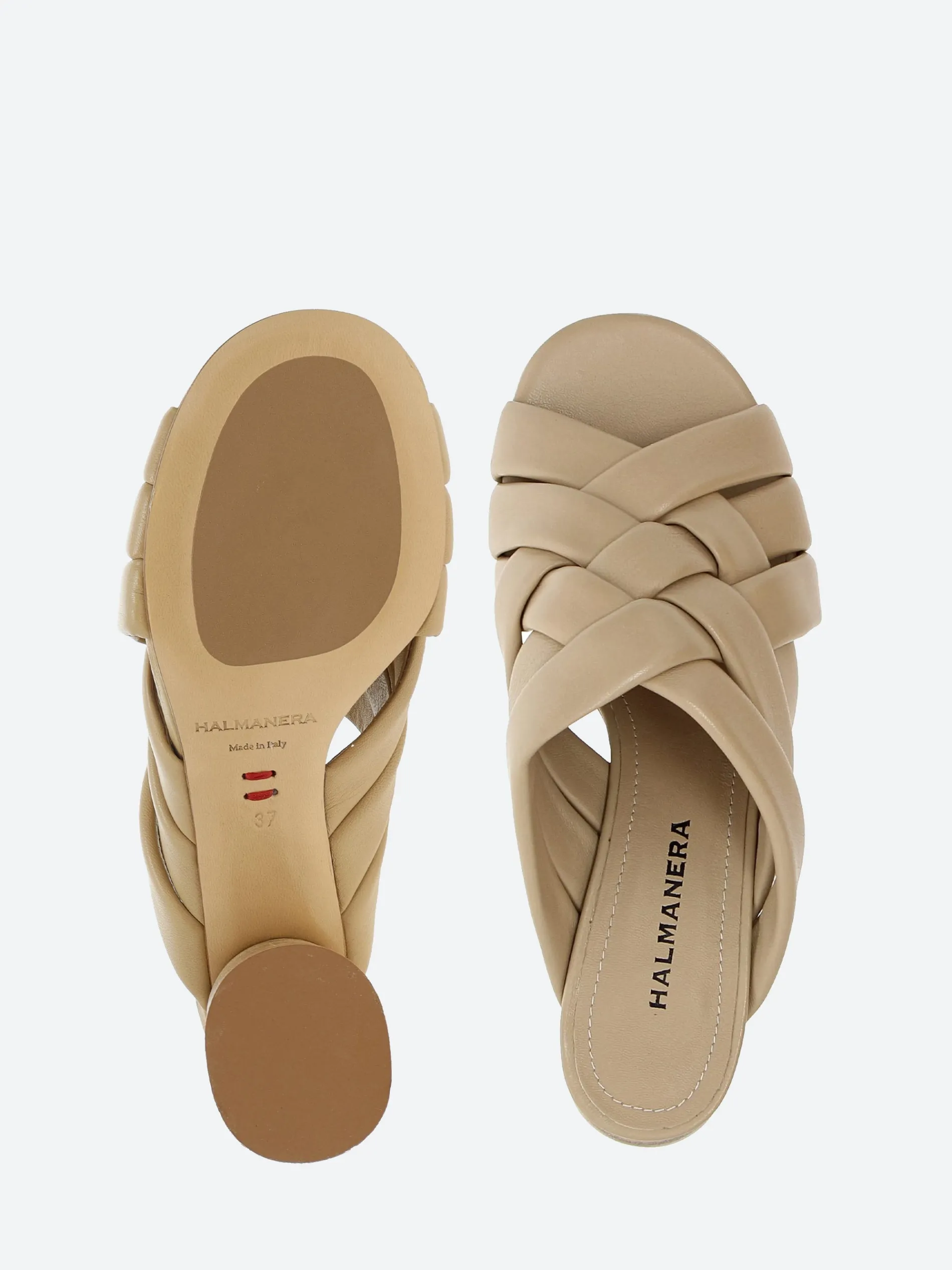 Halmanera woven sandal in soft nappa leather. A slip-in mule for easy on and off. Finished with a tonal wooden heel.