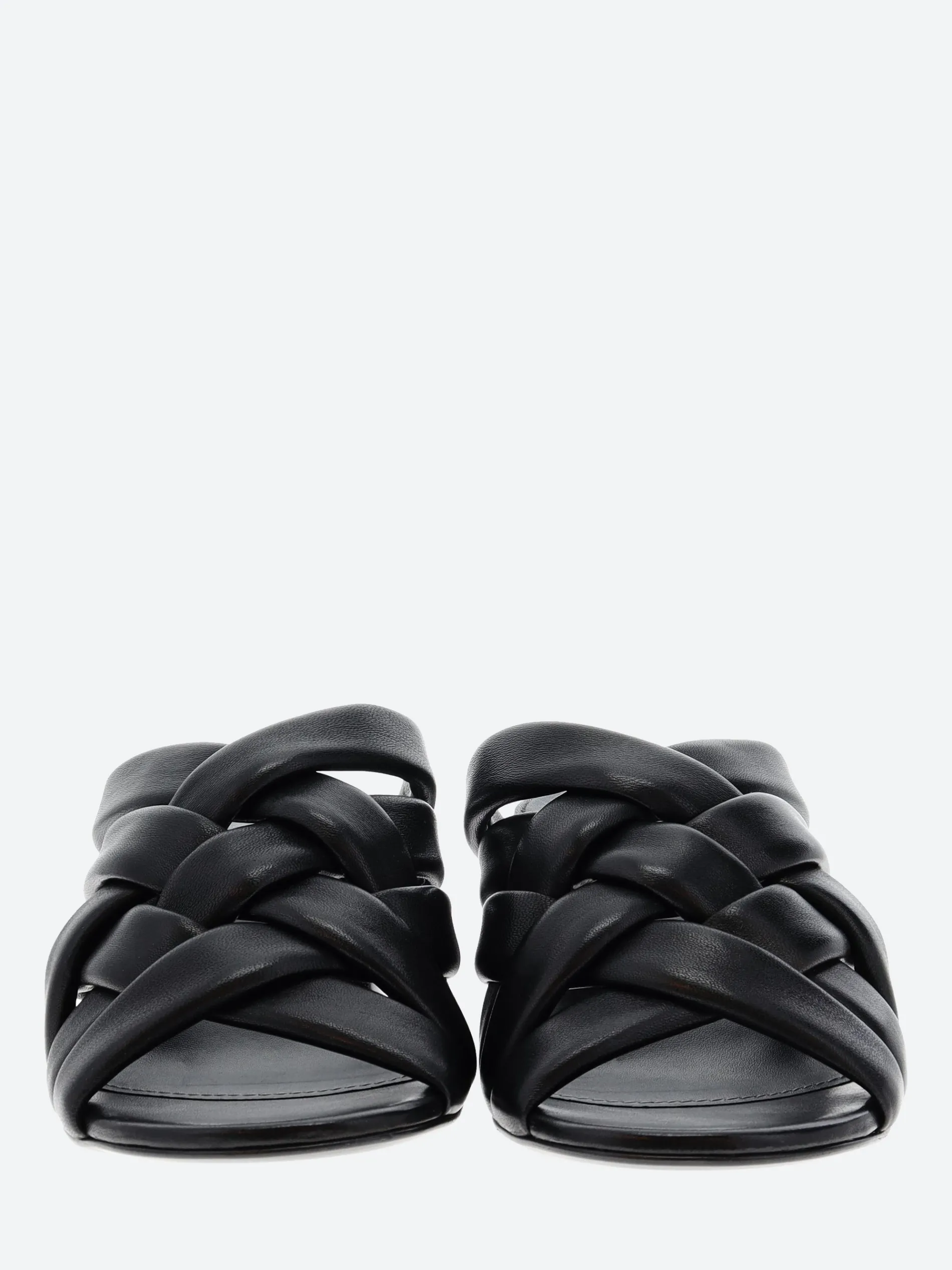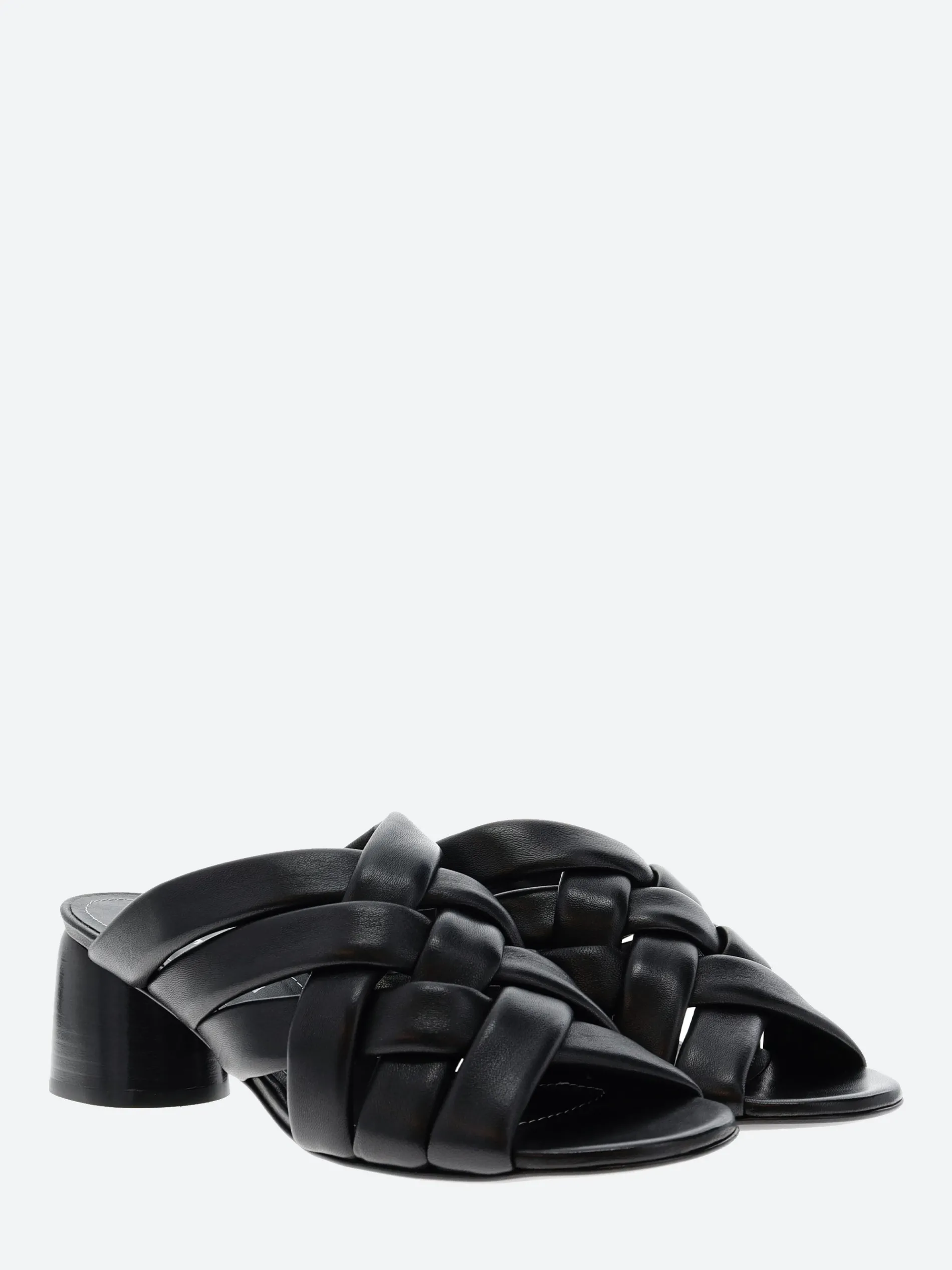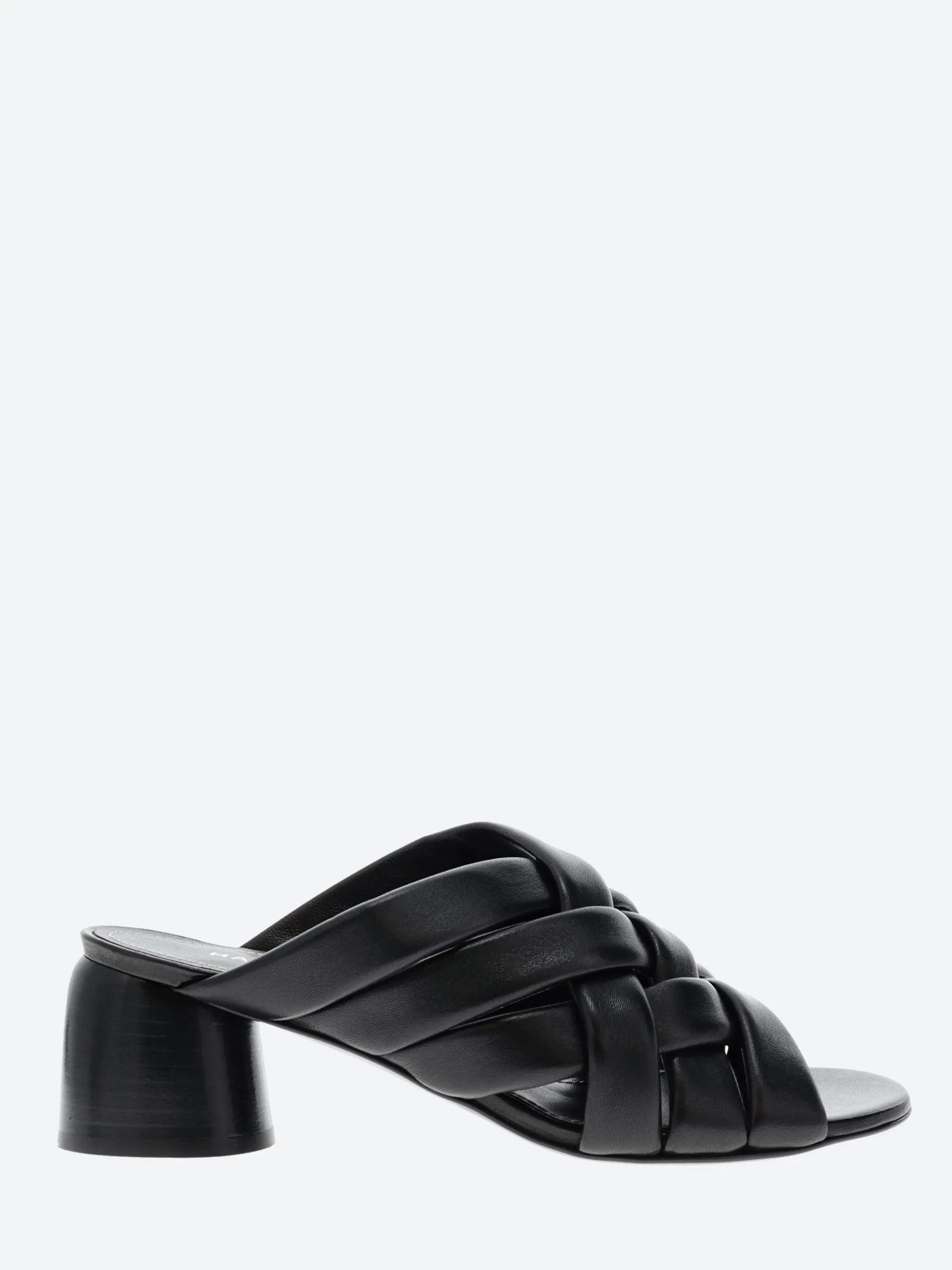 Halmanera woven sandal in soft nappa leather. A slip-in mule for easy on and off. Finished with a tonal wooden heel.