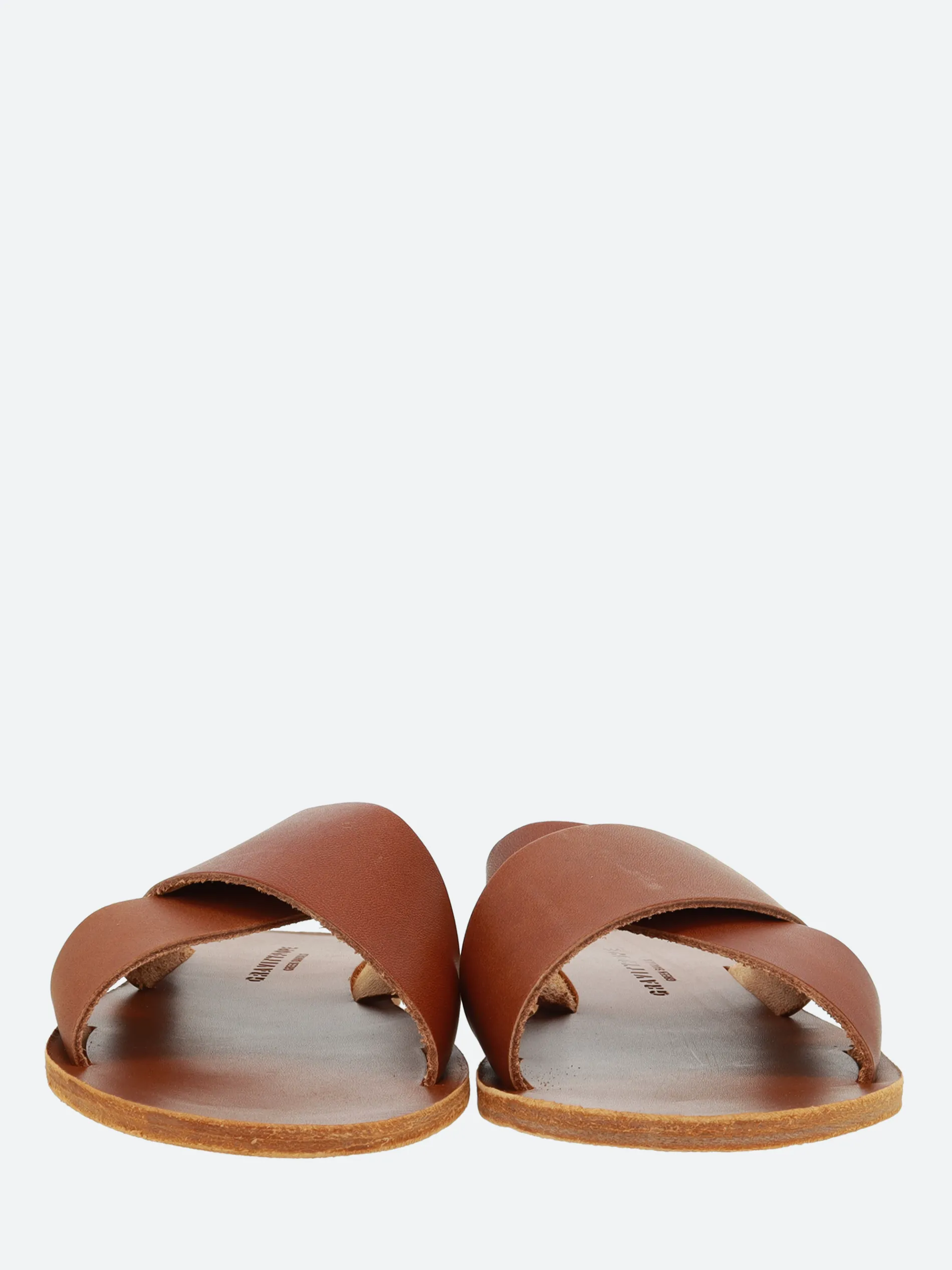 A timeless, minimal cross-strap slide sandal, made from an elegant smooth leather.