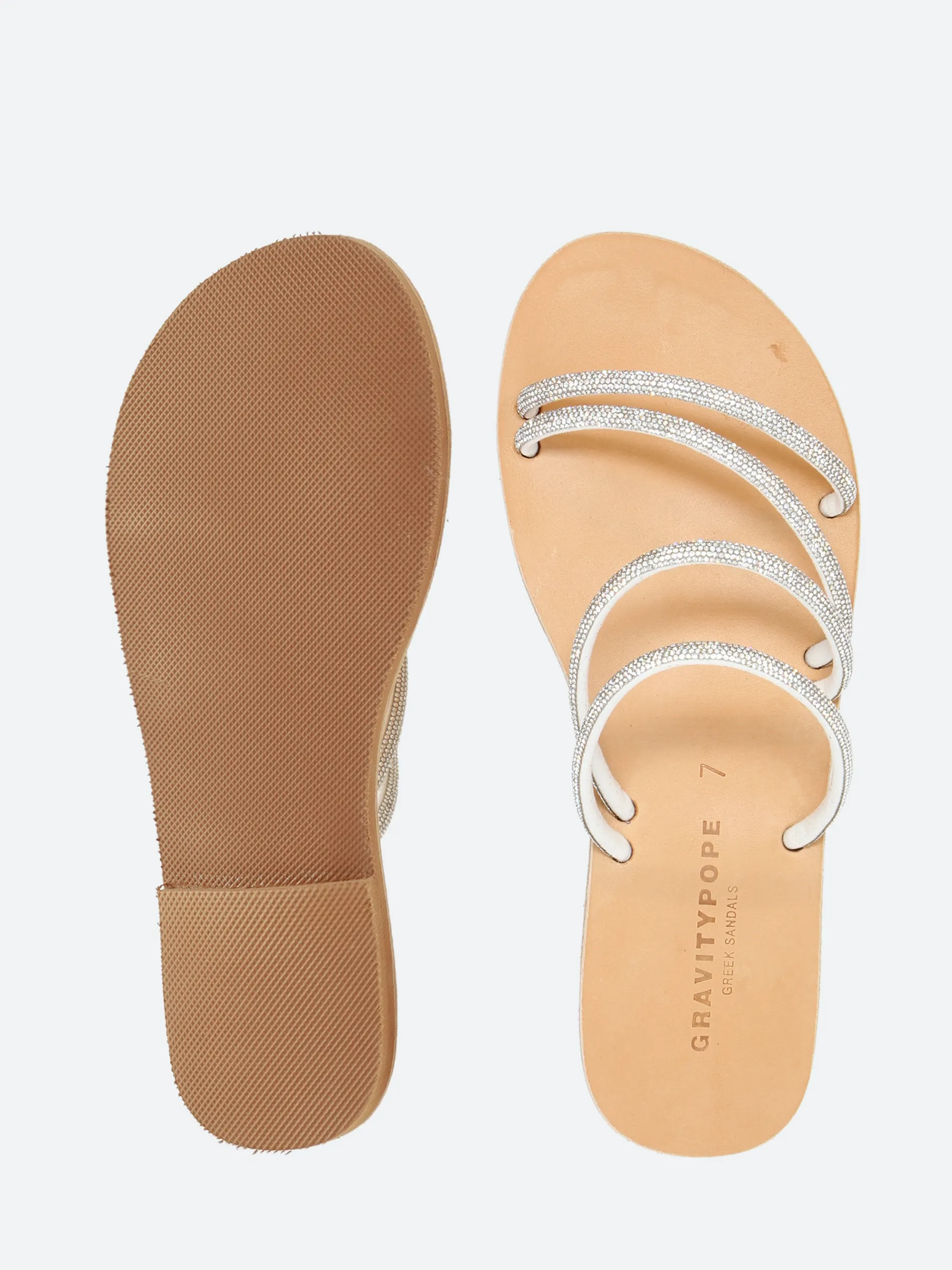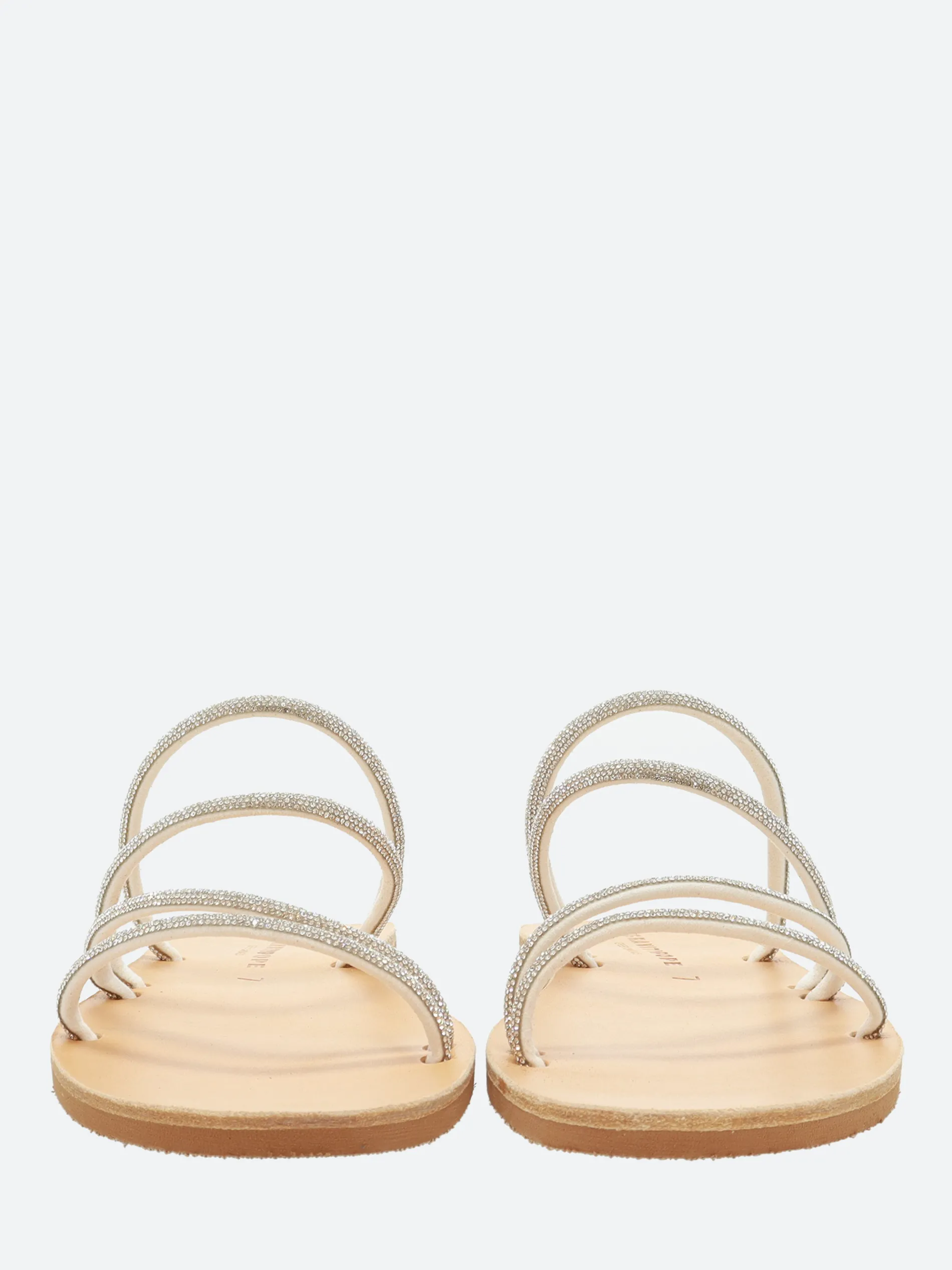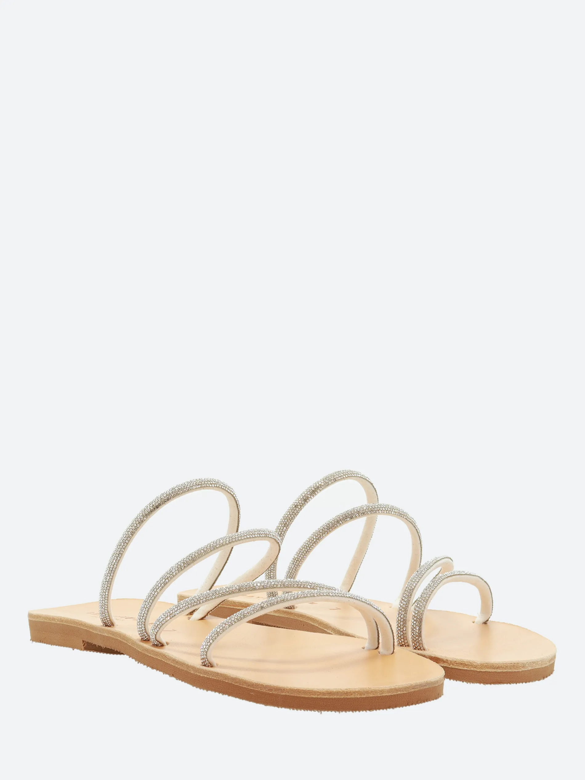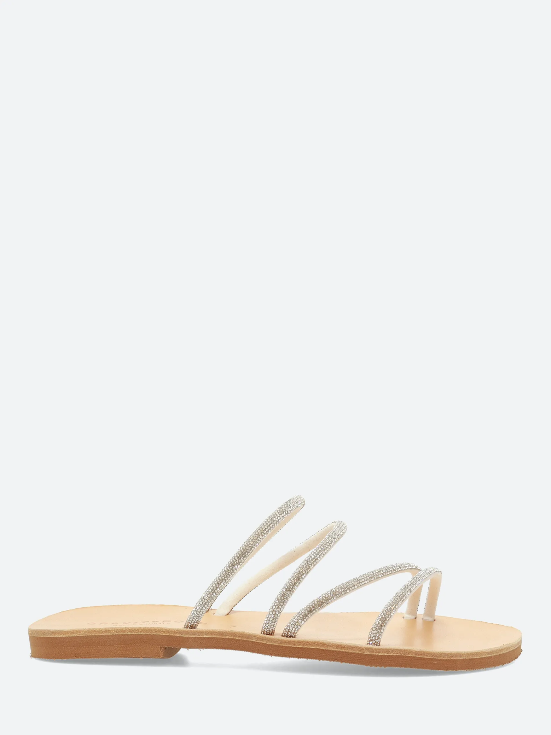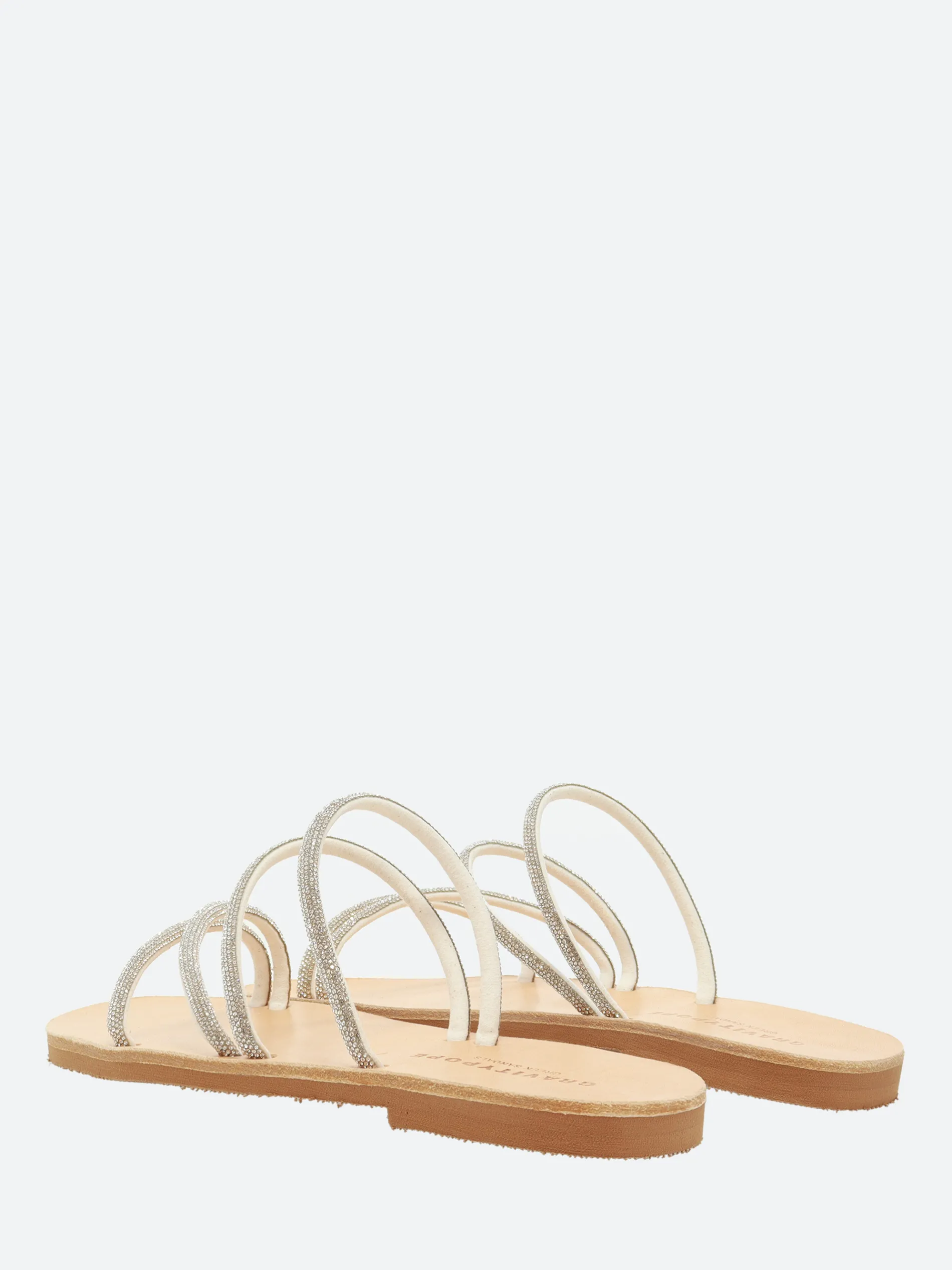 A minimalist slip-on sandal, thin fixed cross-straps with embellishing details, made from soft leather.