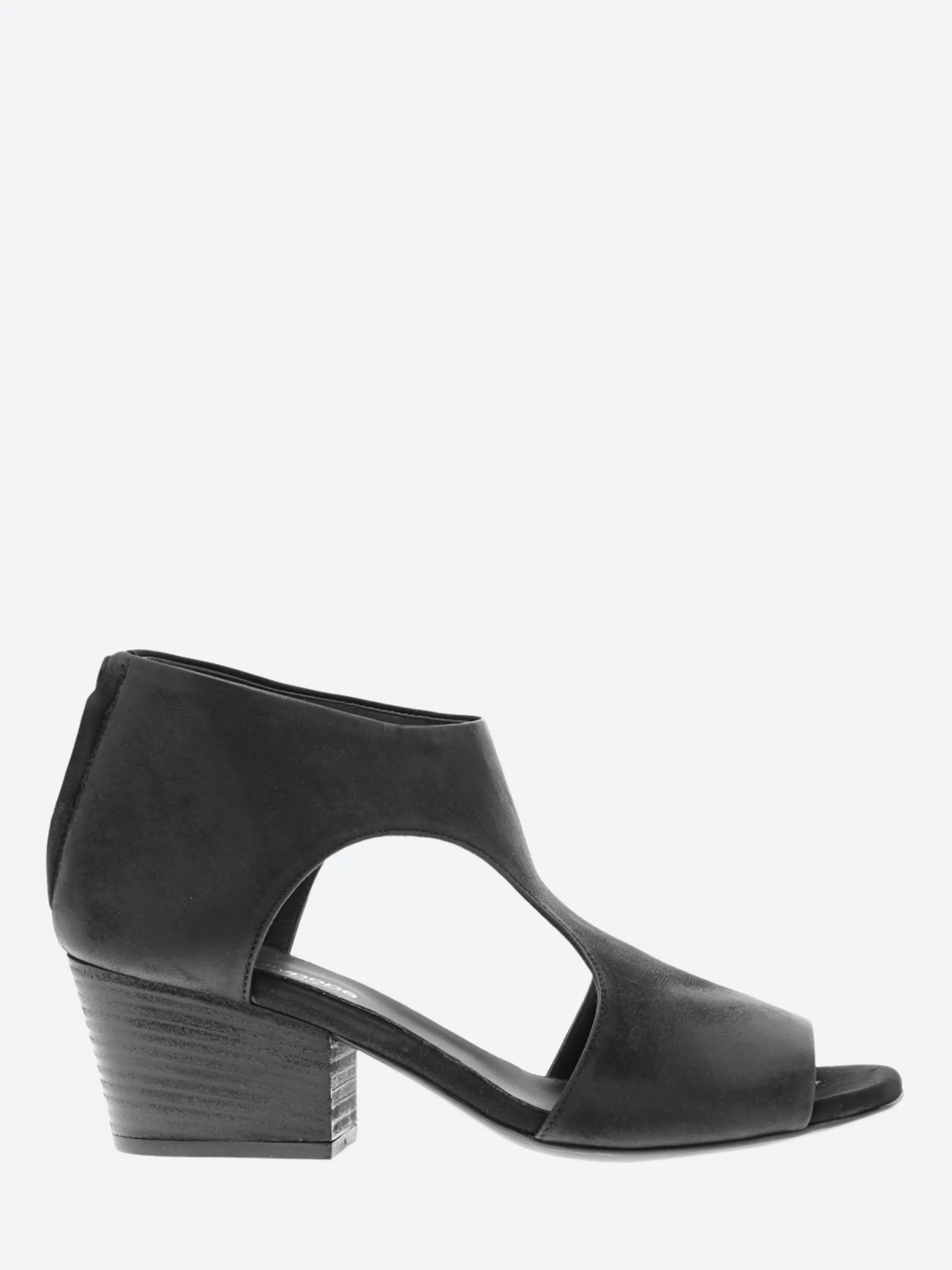 This mid-heel sandal features a two inch block heel, lateral cut out details and back zip closure.