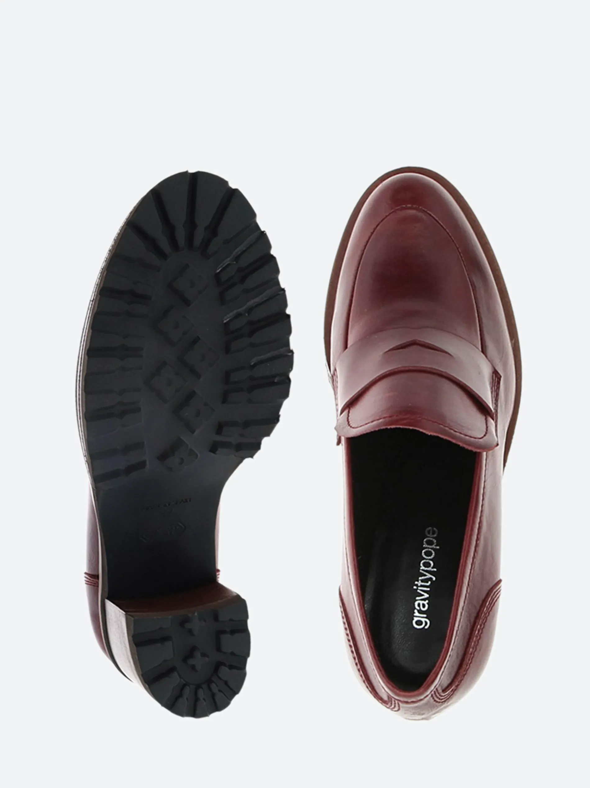 Versatile and endlessly wearable, the gravitypope Zena loafer sits on a solid wood block heel with lugged traction.