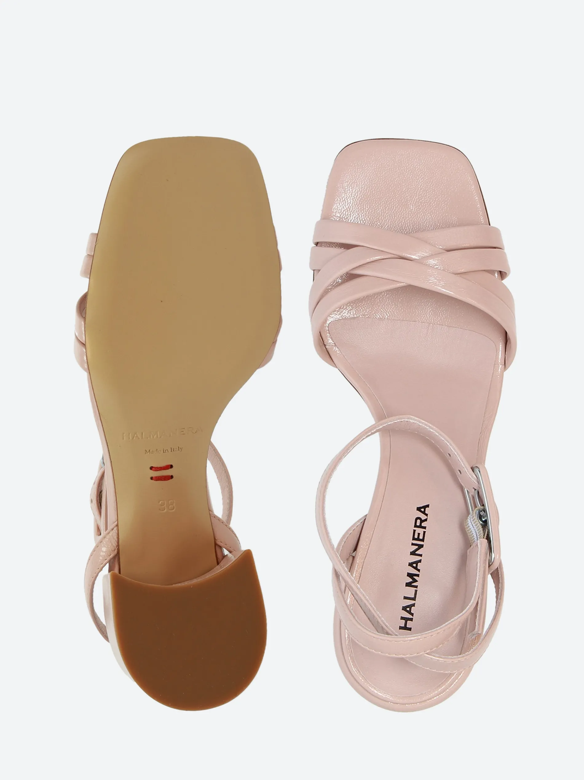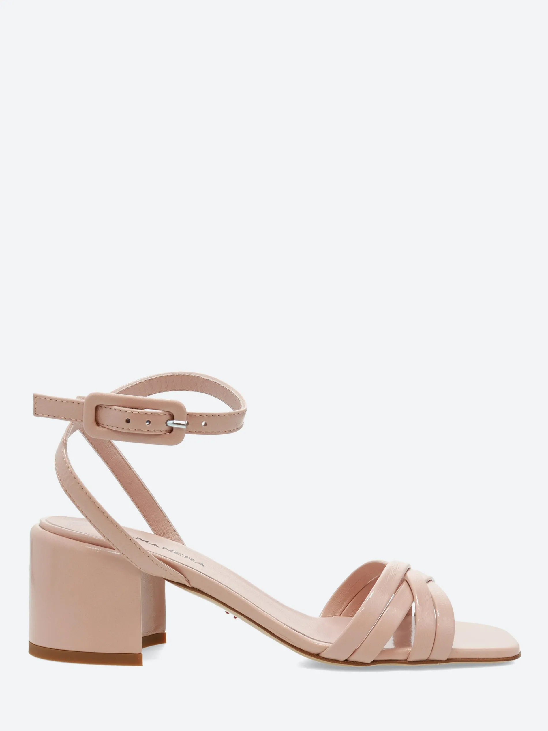 Crafted with a block heel and subtle square toe, this sandal features slender straps for an elegant silhouette.