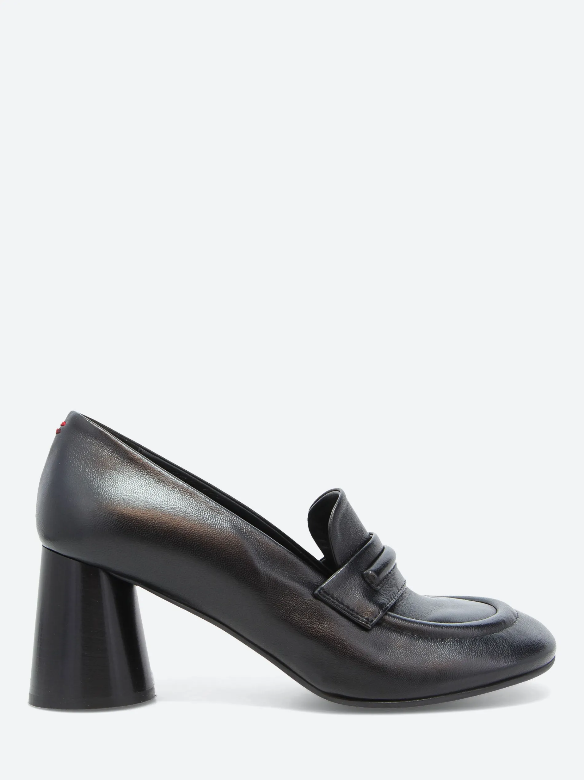 Classic penny loafer with a blocked-heel made from sleek leather with moc toe detailing.