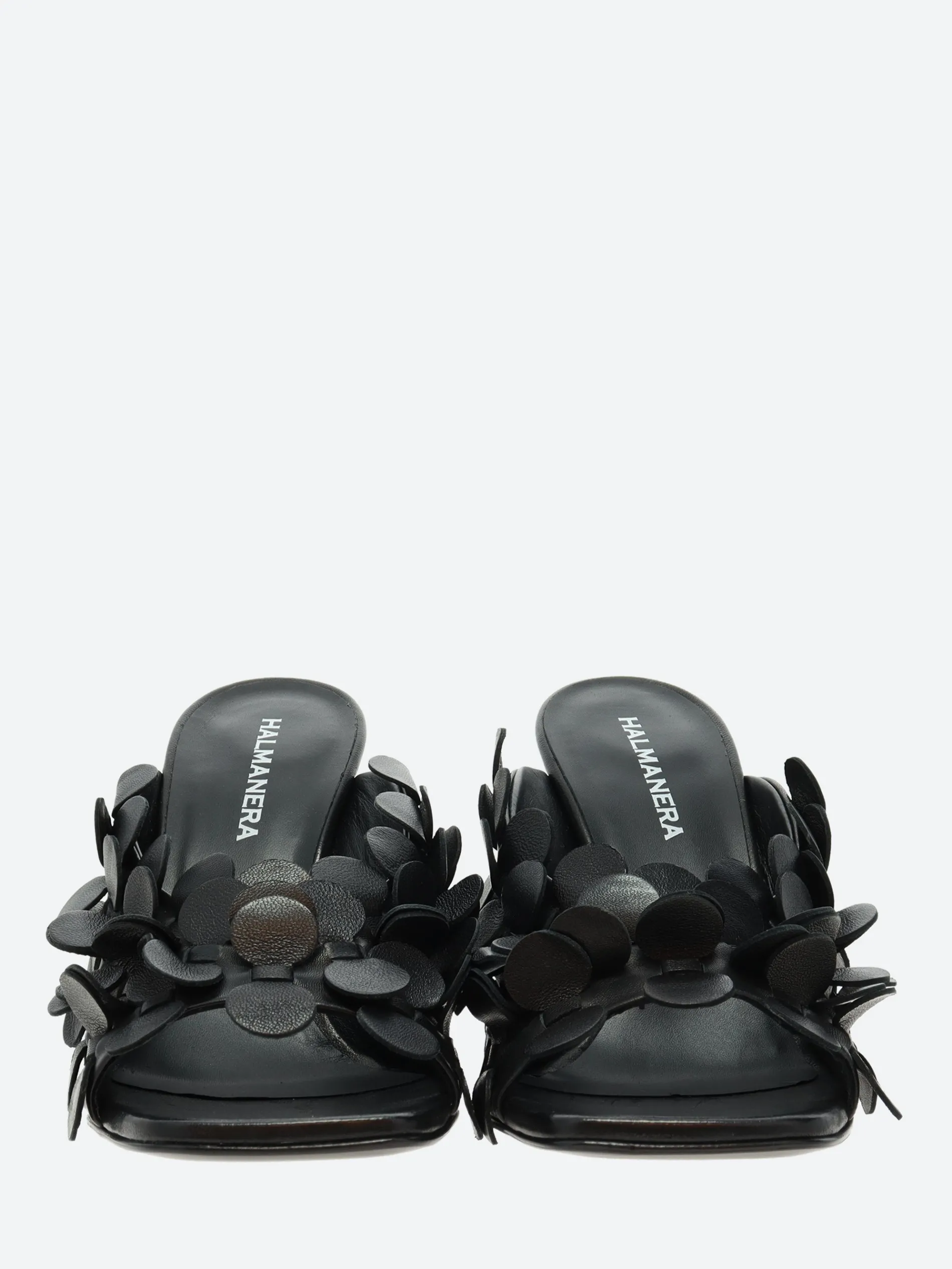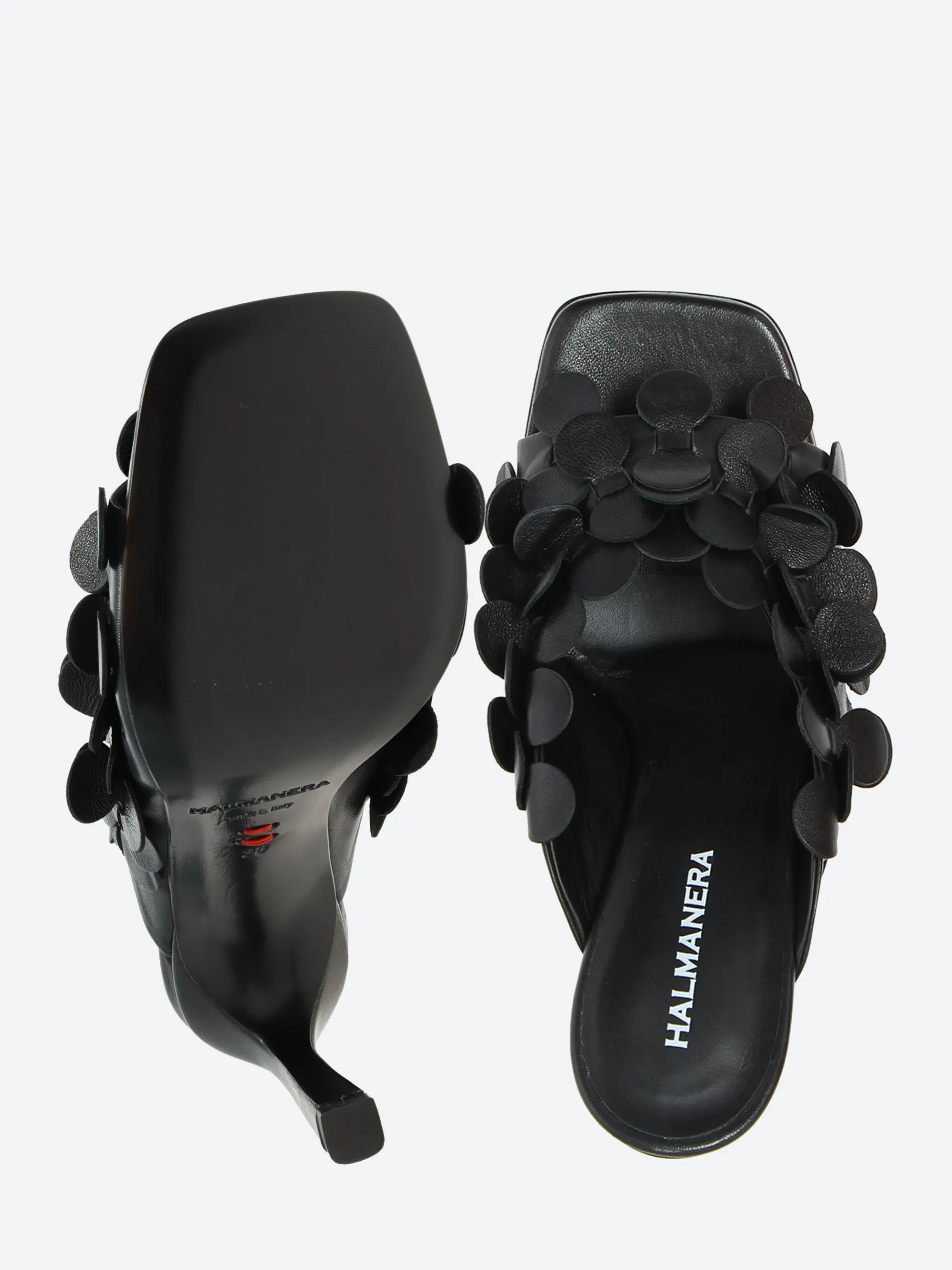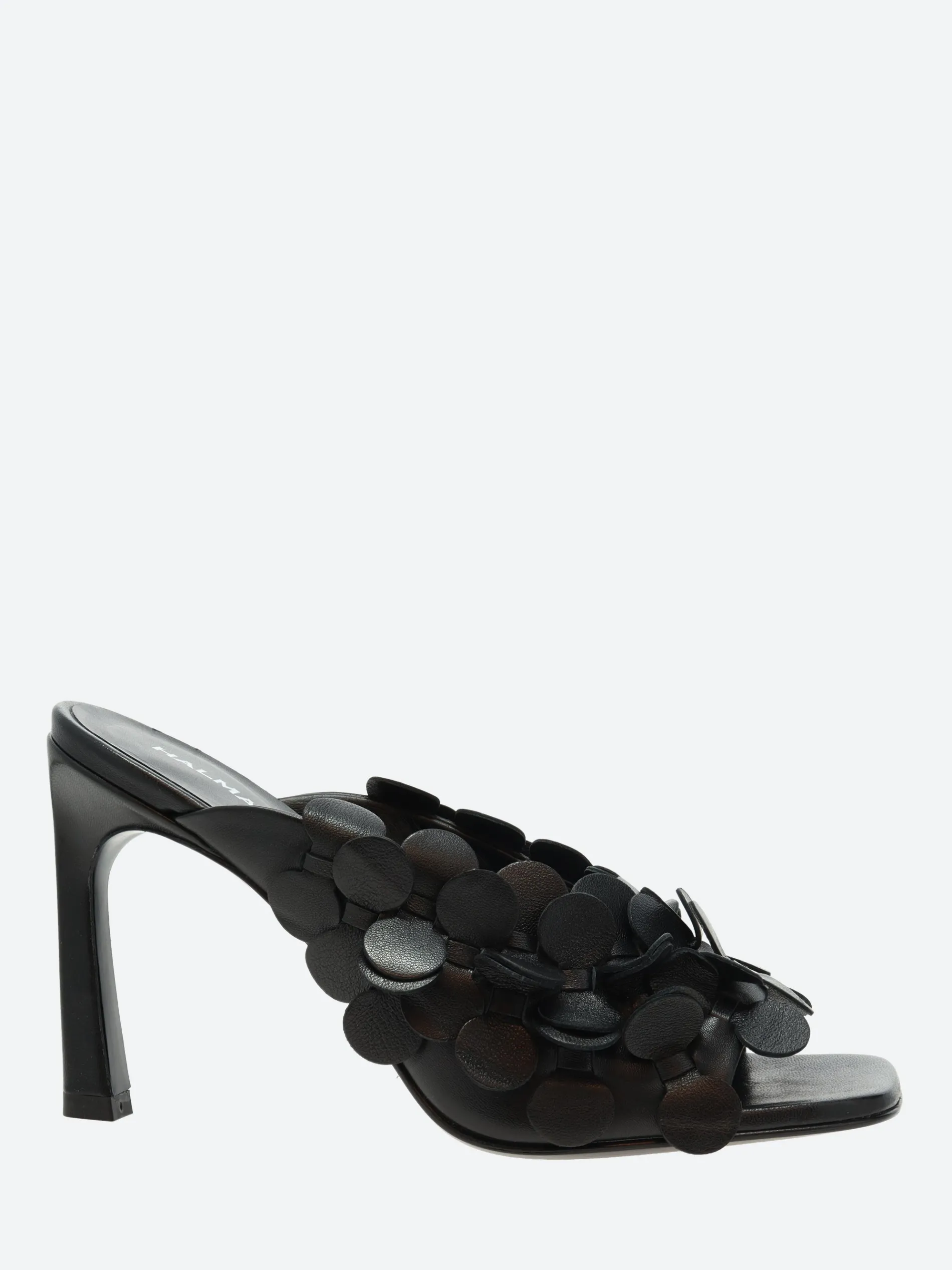 A playful black mule, sitting on an elegant Stiletto heel.