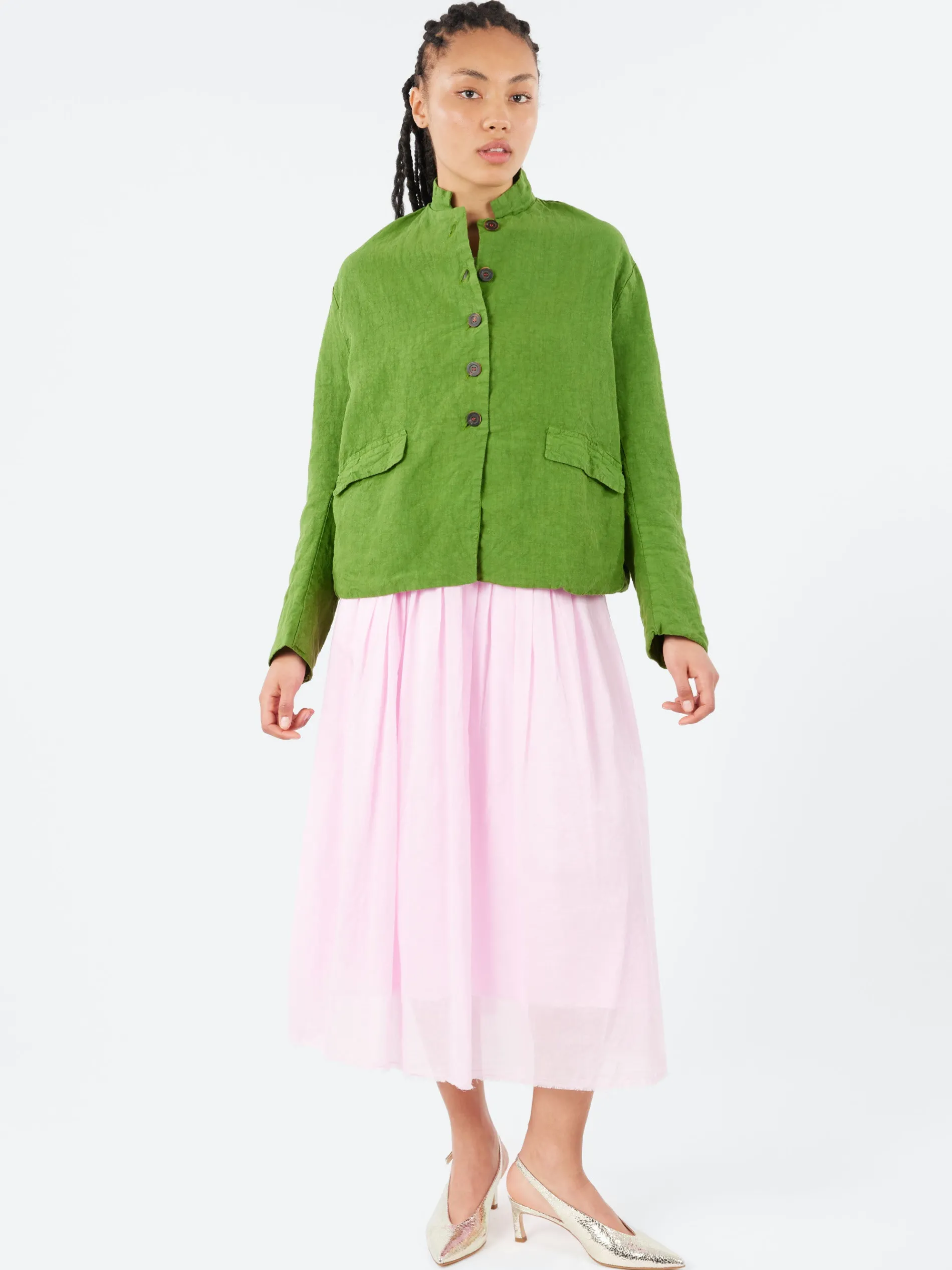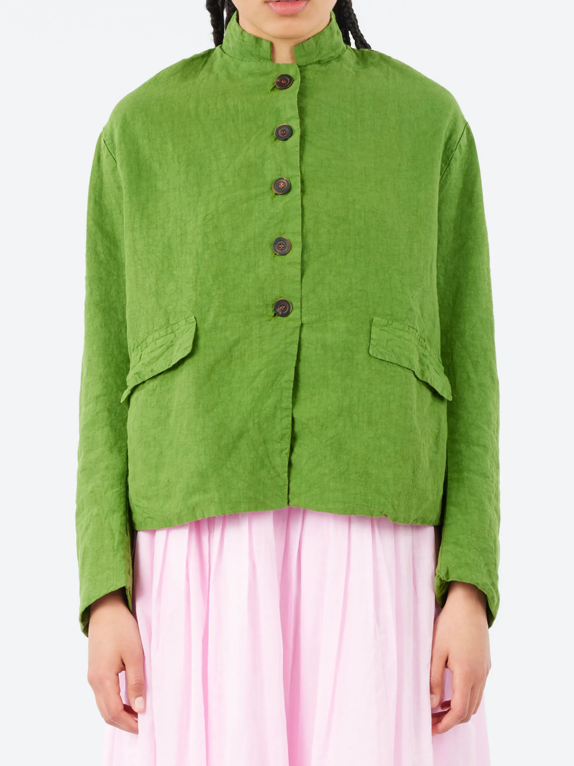 The Hannoh Wessel Josephine Jacket is a beautifully crafted piece made from soft, breathable linen. The jacket features a small, neatly finished collar and functional front pockets. A back slit ensures ease of movement and enhances the overall design. The interior is fully lined with soft cotton for a smooth and comfortable fit against the skin. The button closure is thoughtfully stitched with red thread, adding a subtle but distinctive detail that sets the jacket apart. An ideal layering piece, perfect for transitioning through seasons in both casual and more polished outfits.