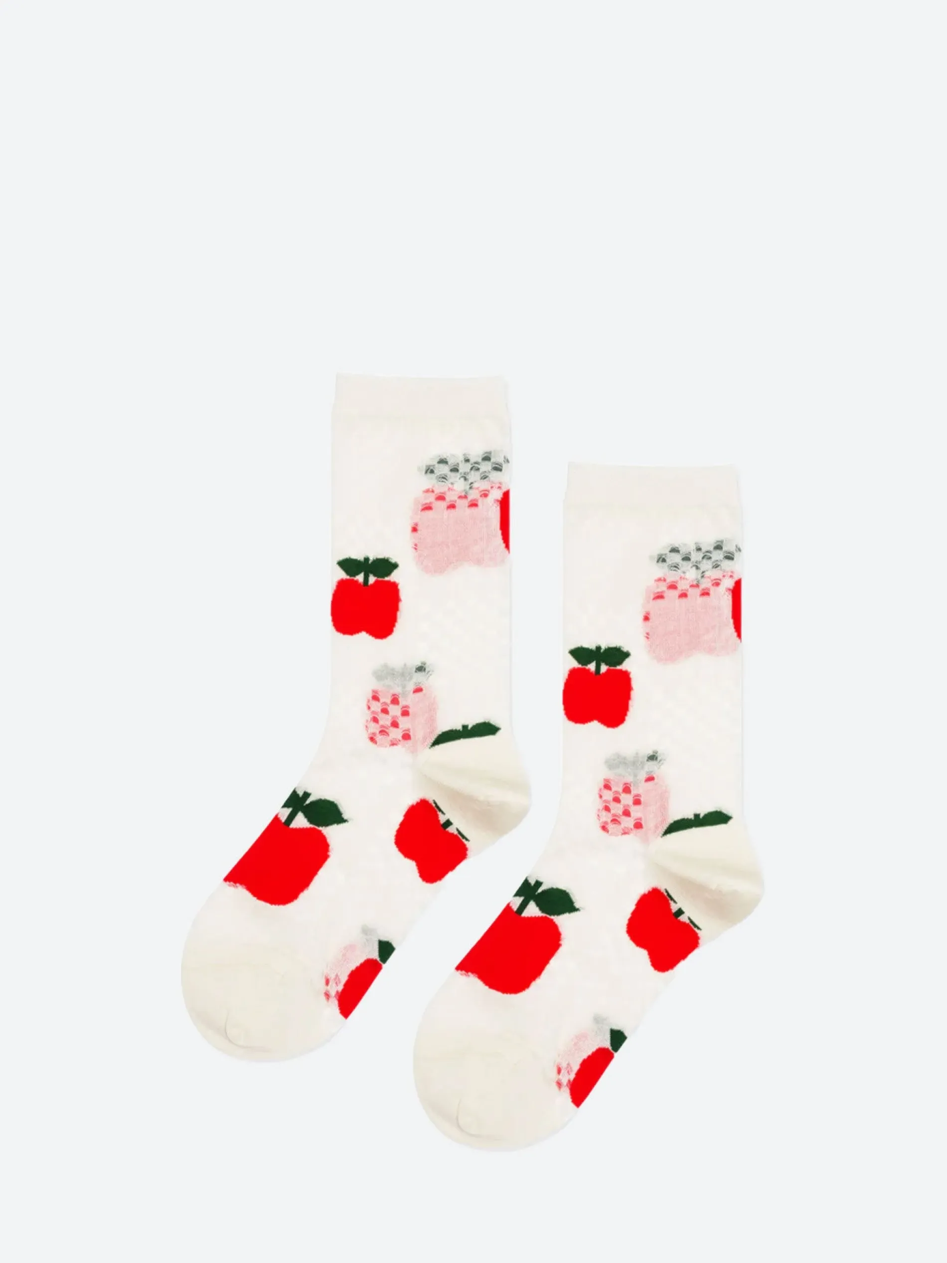 Hansel from Basel sheer nylon crew sock featuring an apple pattern with checkerboard blocks.