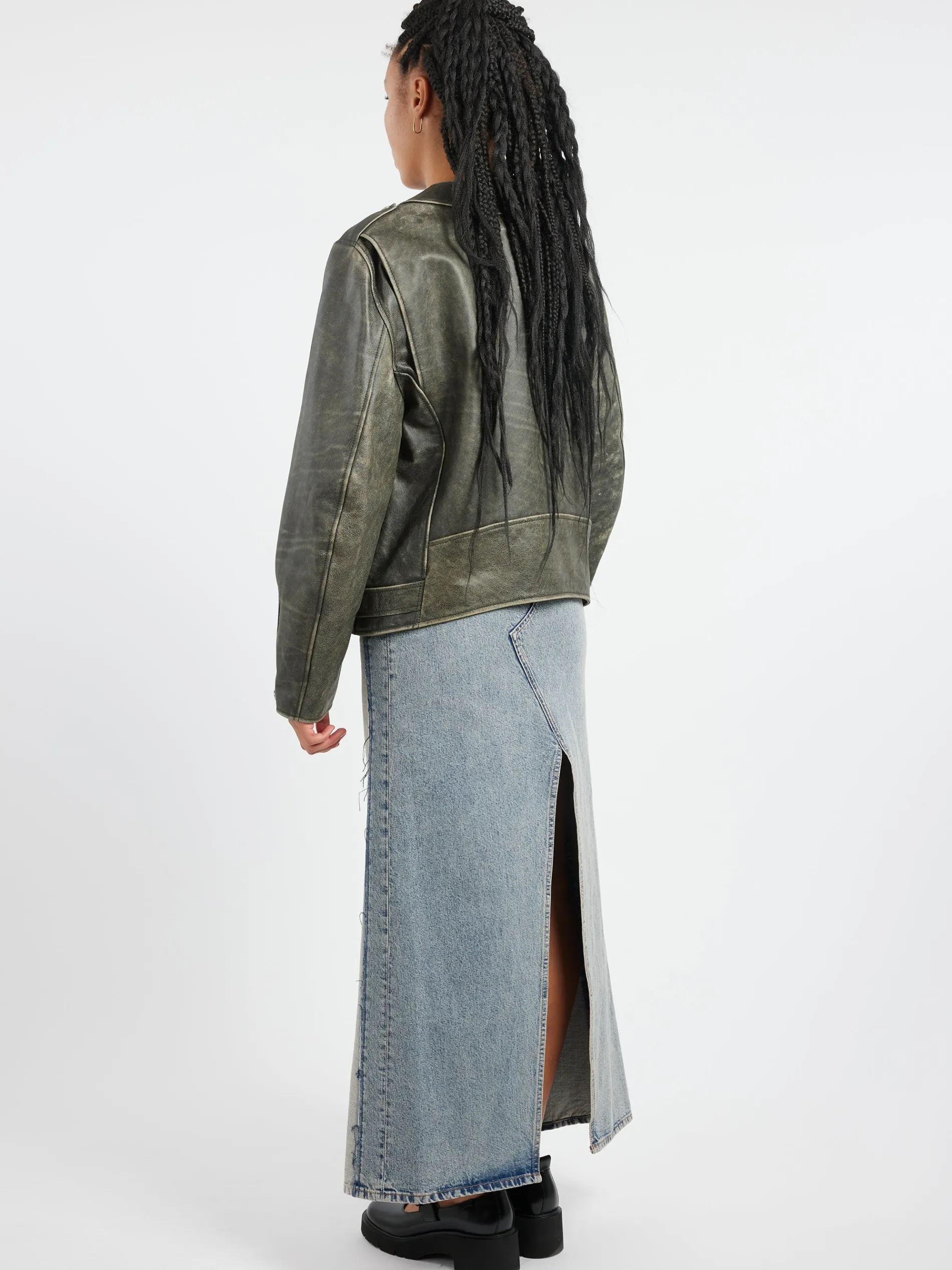 Biker jacket shaped to a boxy, oversized fit from lightly distressed leather. The style also features wide notched lapels and a belt, as well as buttoned flap pockets. MM6’s discreet yet distinct signature, a horizontal line of white stitches, is also found on the back of the garment.
