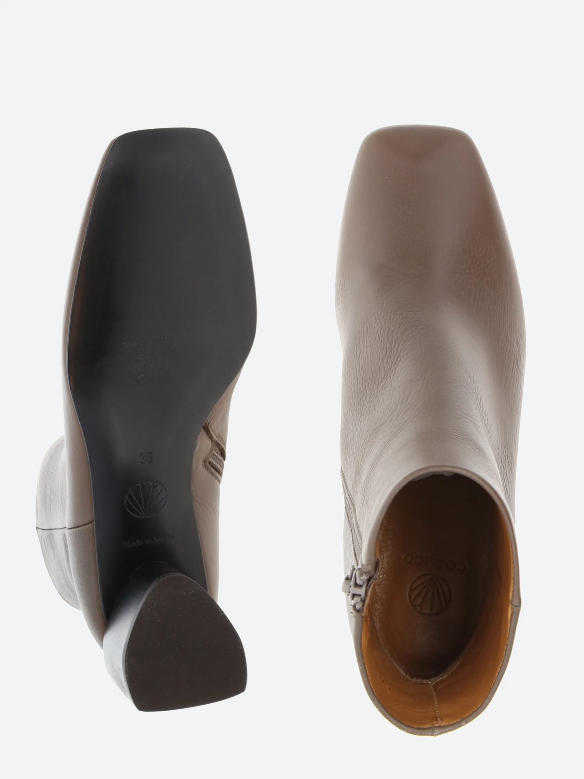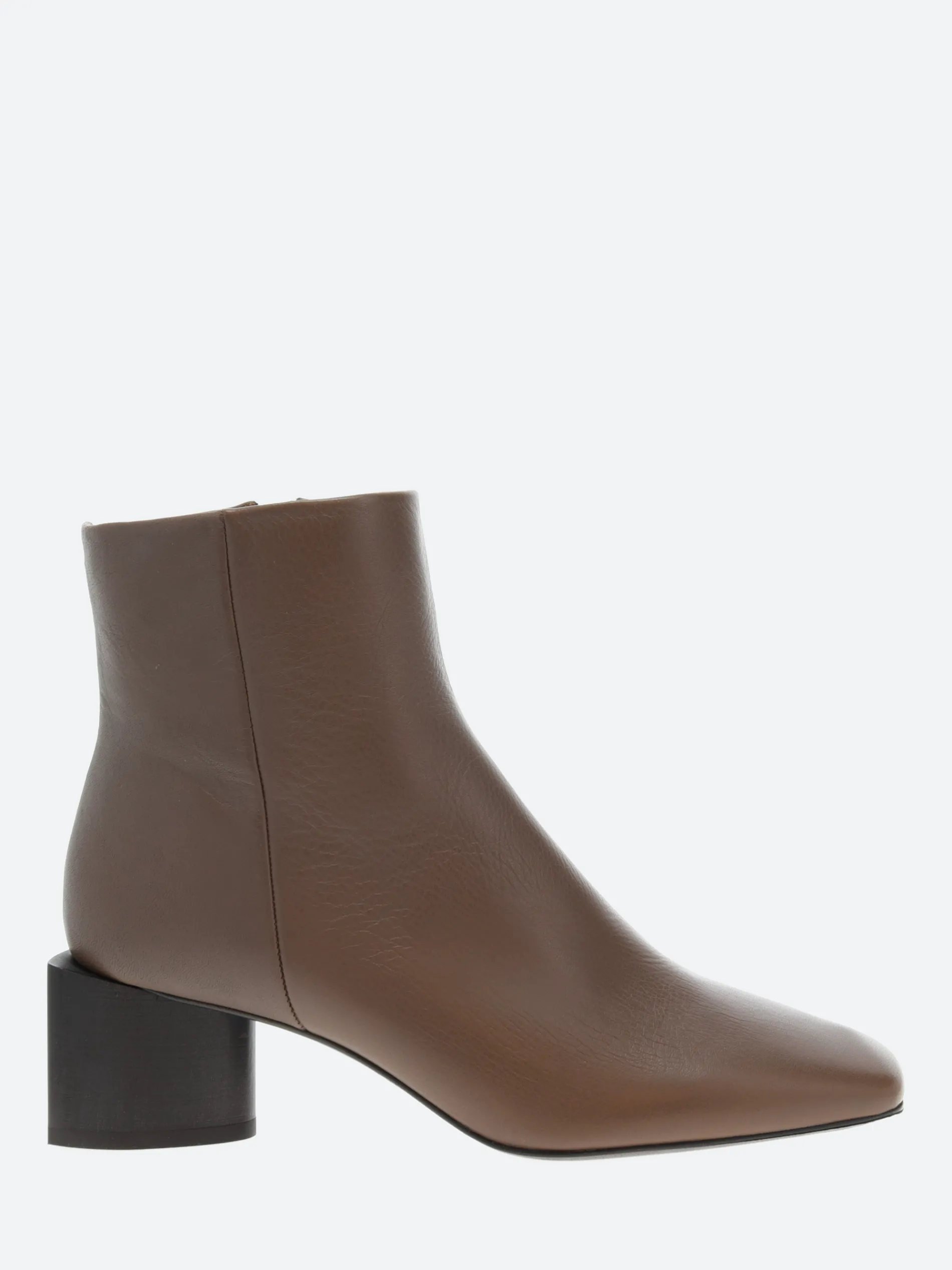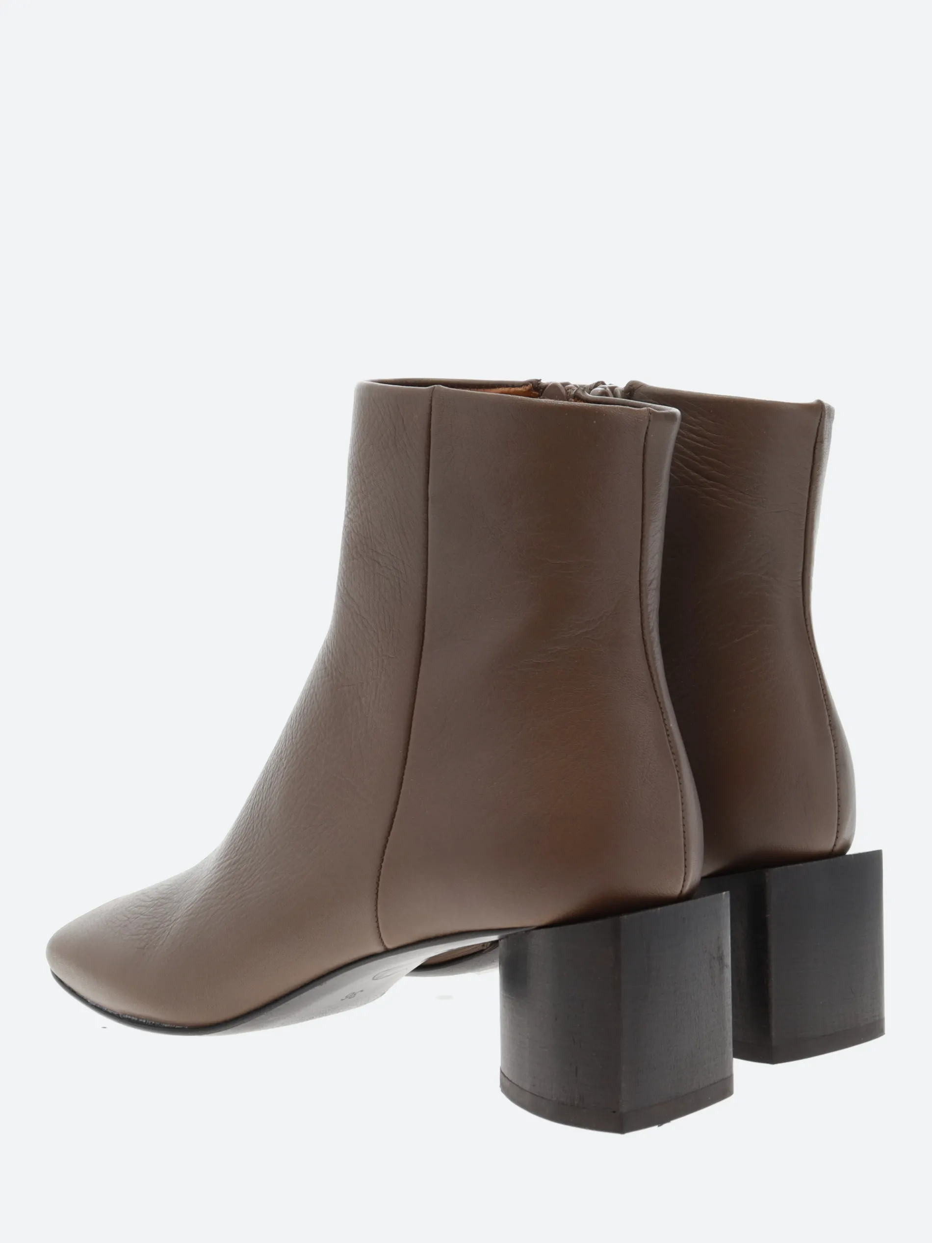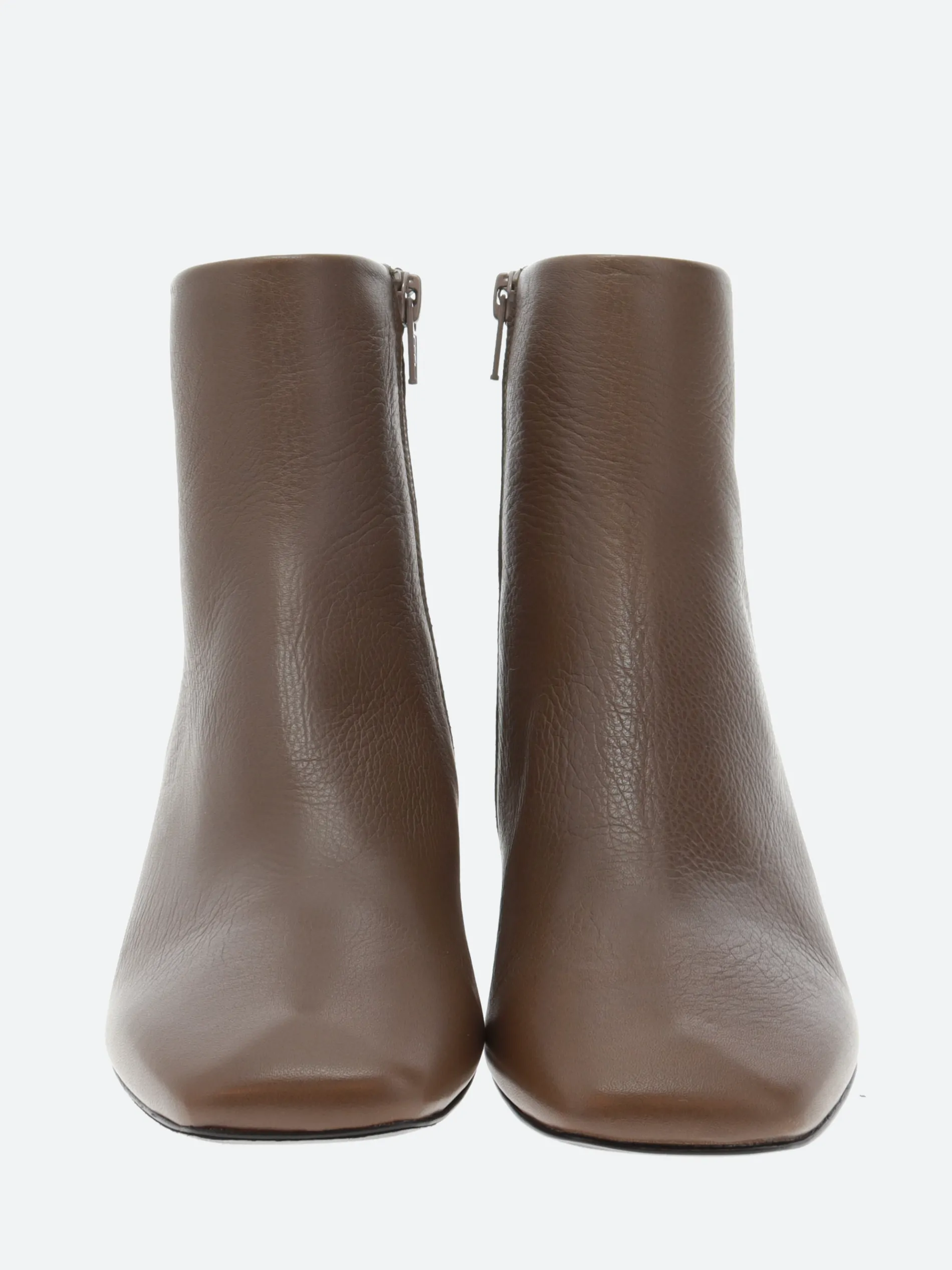 To achieve the perfectly minimal, modern look of the Ione boot no attention to detail was spared. Note the squared off toe with its distinctive toe box which is mirrored by the sculptural block-heel, squared off in the back and curved to a gentle point under the center of the foot.