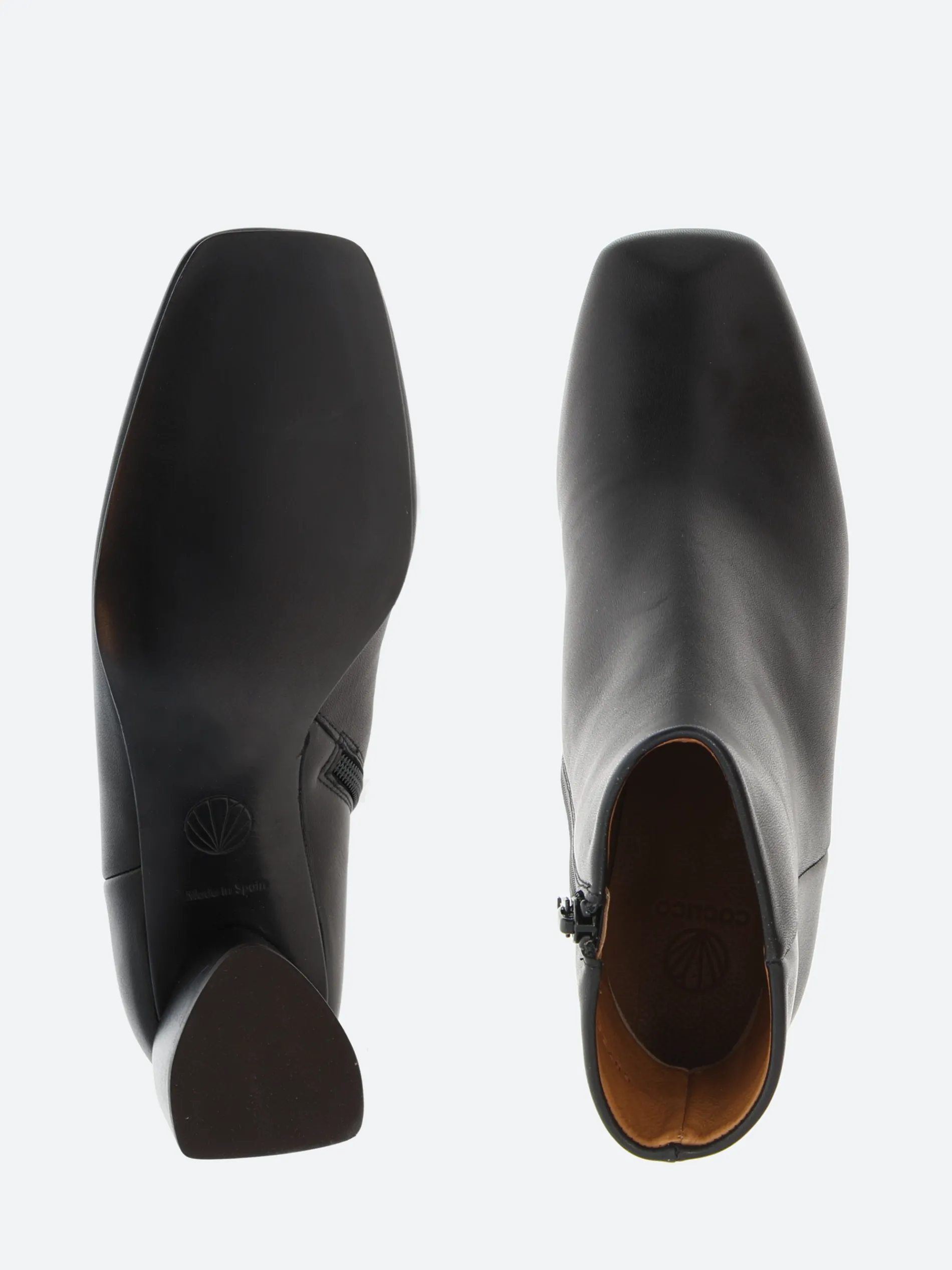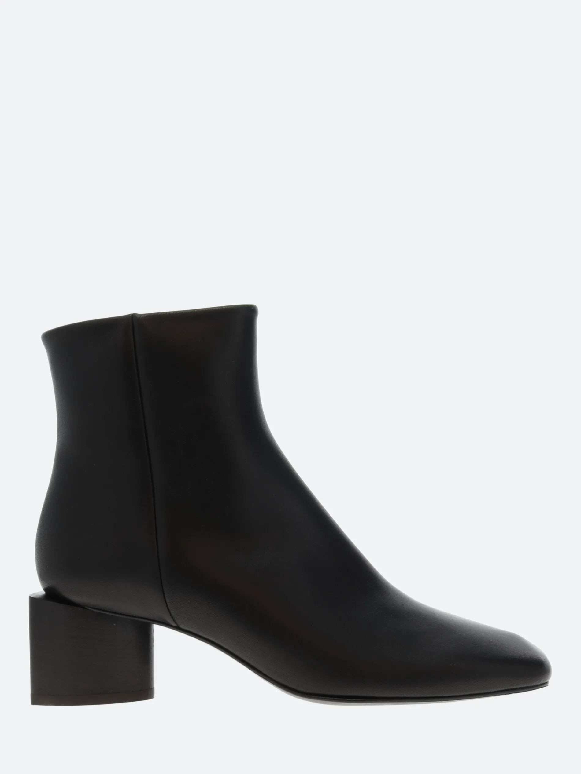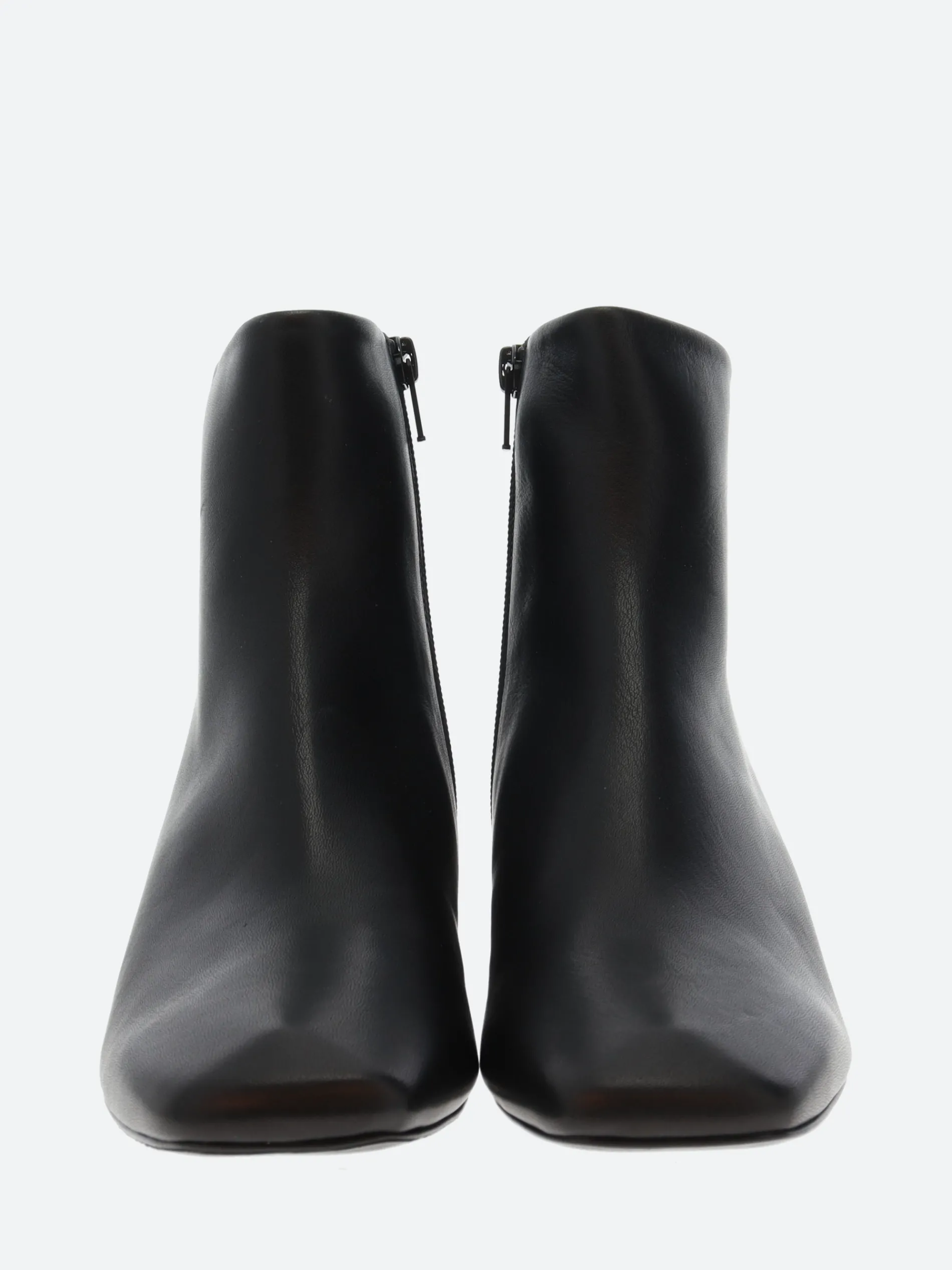 To achieve the perfectly minimal, modern look of the Ione boot no attention to detail was spared. Note the squared off toe with its distinctive toe box which is mirrored by the sculptural block-heel, squared off in the back and curved to a gentle point under the center of the foot.