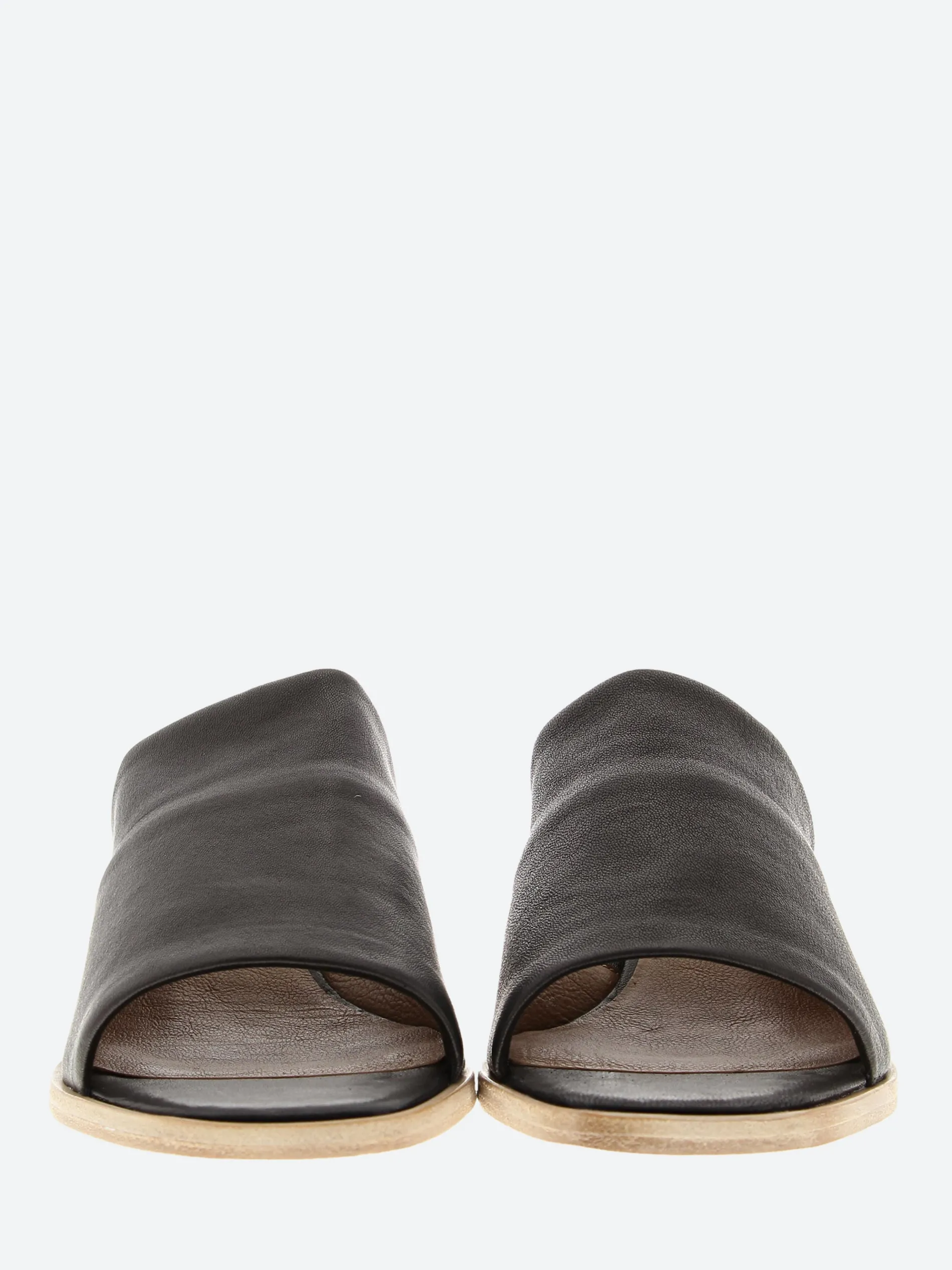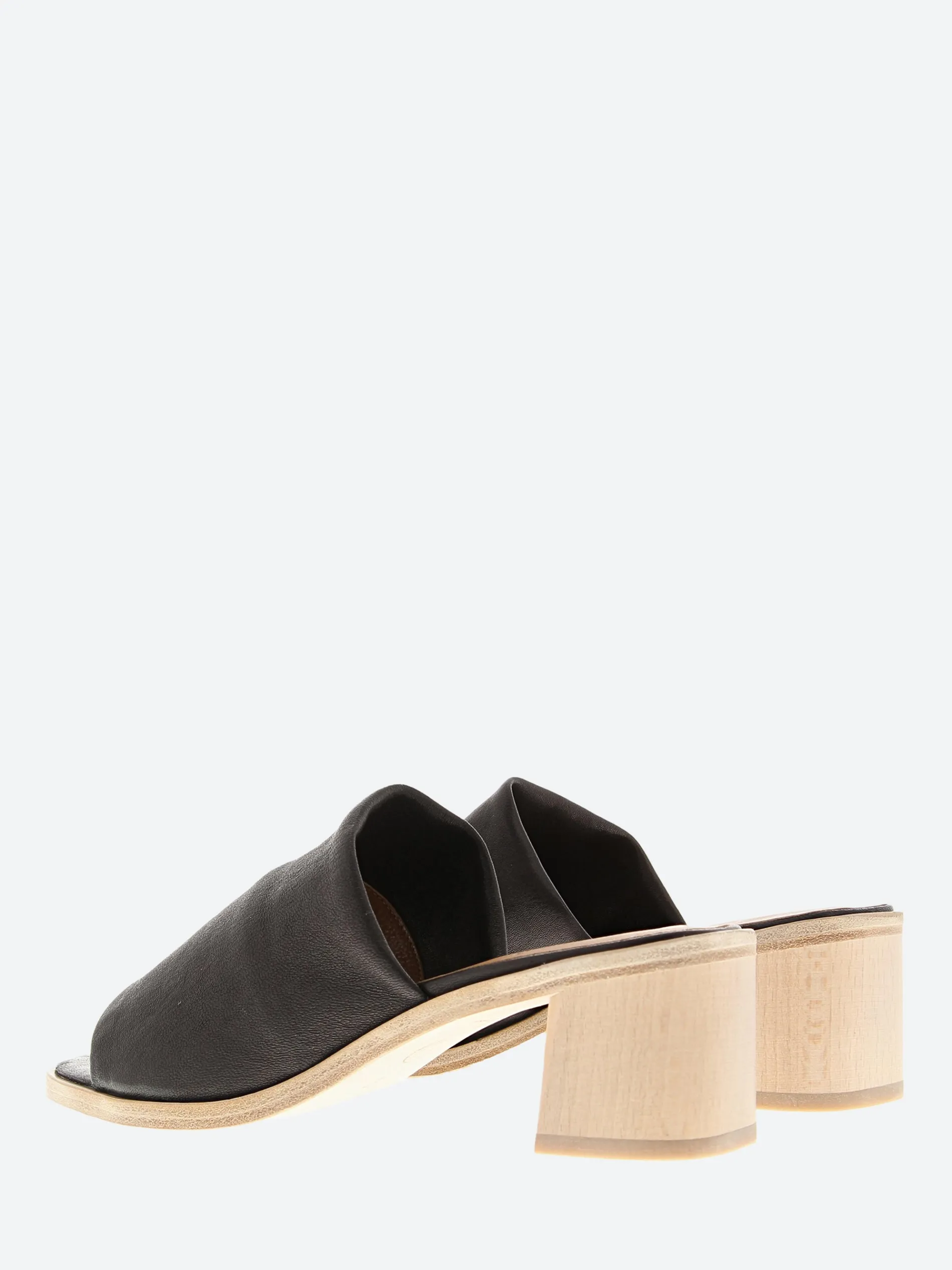 Stretch leather slide on a mid height architectural wood heel that takes you out the door in your own style.