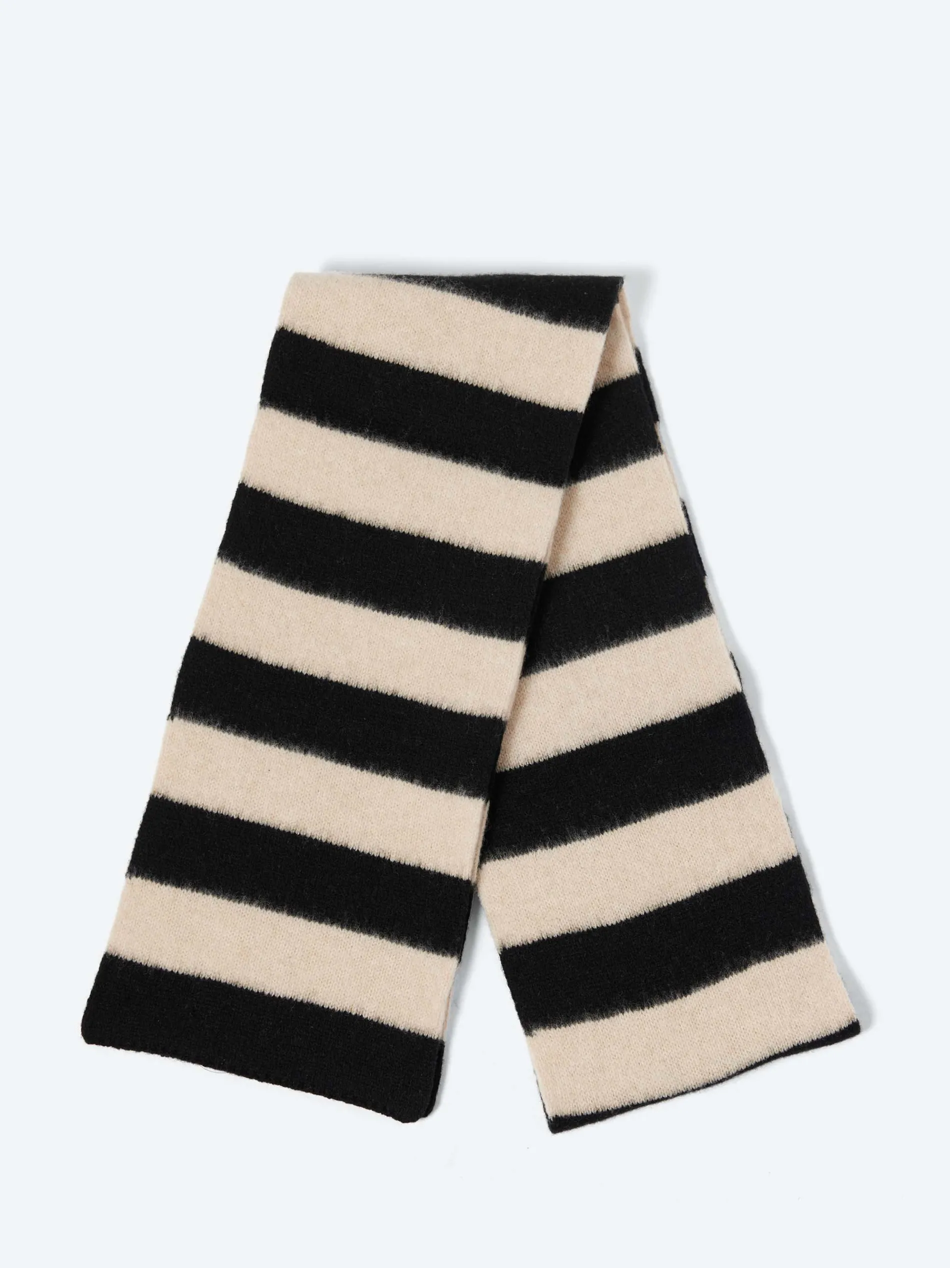 Soft, cozy brushed lambswool in contrasting bold stripes. Medium sized and long enough to tie once or twice round the neck.