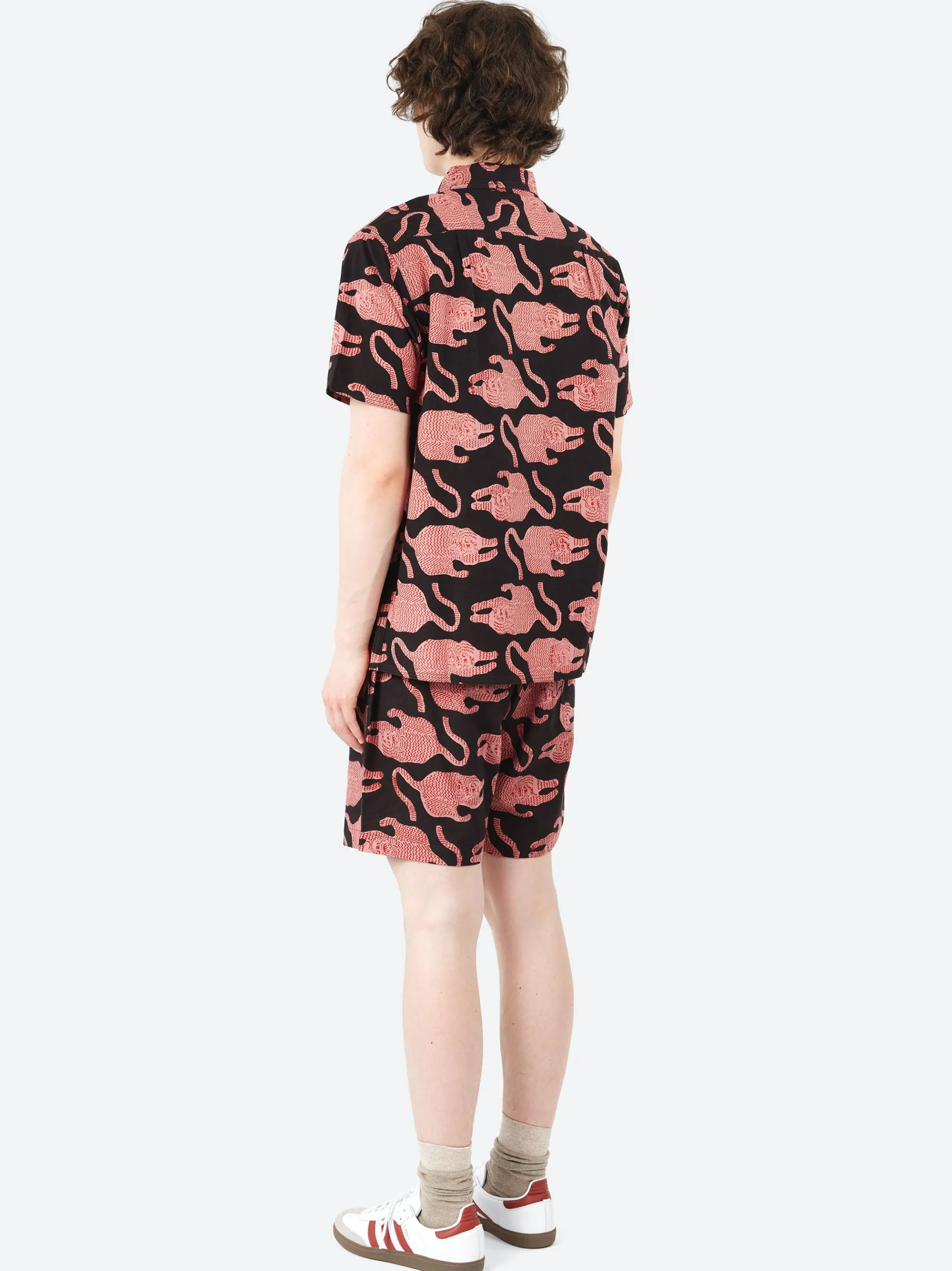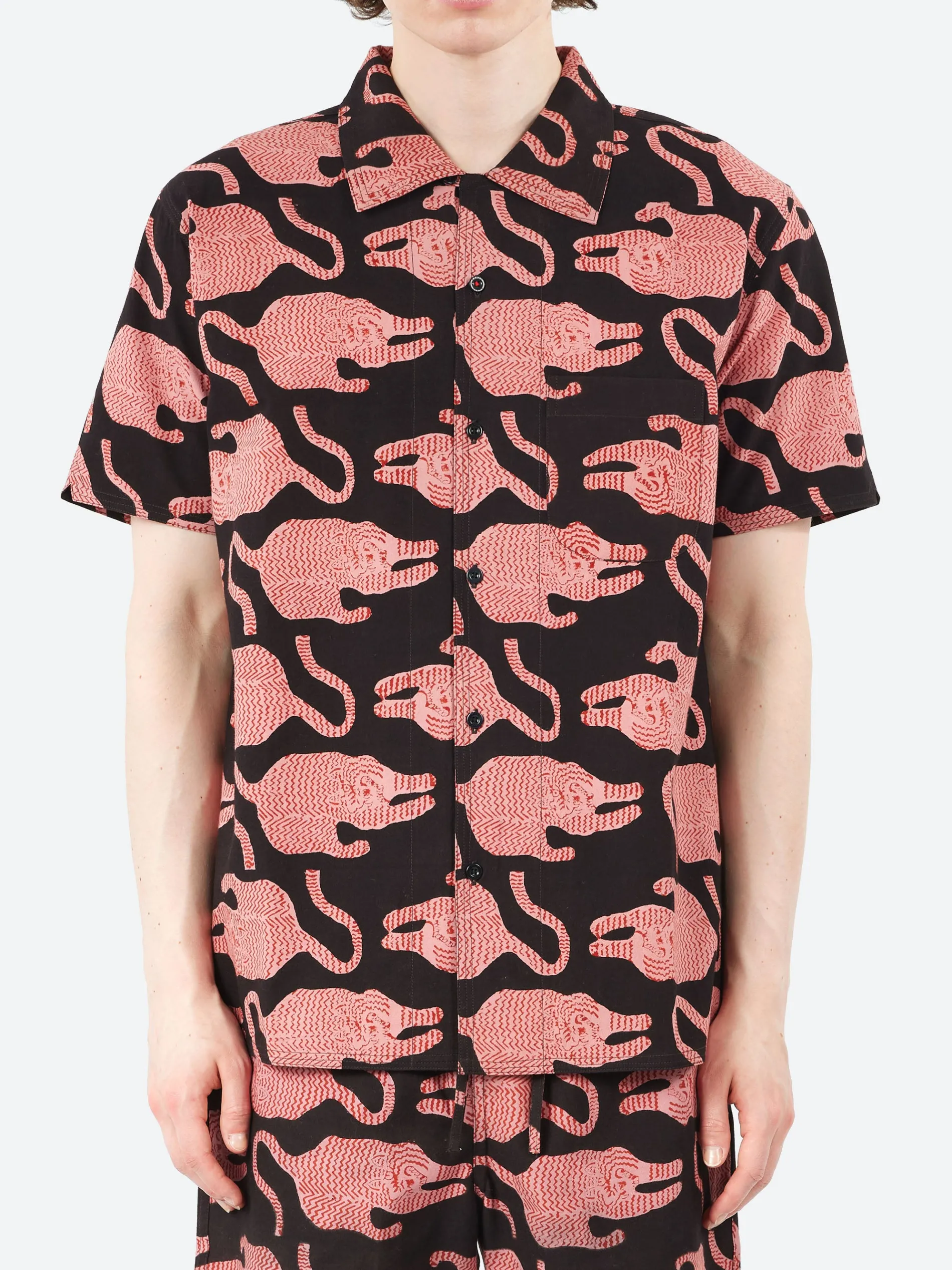This boxy fit, short-sleeve open collar shirt features fabric printed using traditional hand block printing. Skilled artisans carve wooden blocks to create intricate patterns, which are then carefully hand-stamped onto the fabric using natural dyes. Often requiring multiple layers and blocks, this technique demands both time and precision.