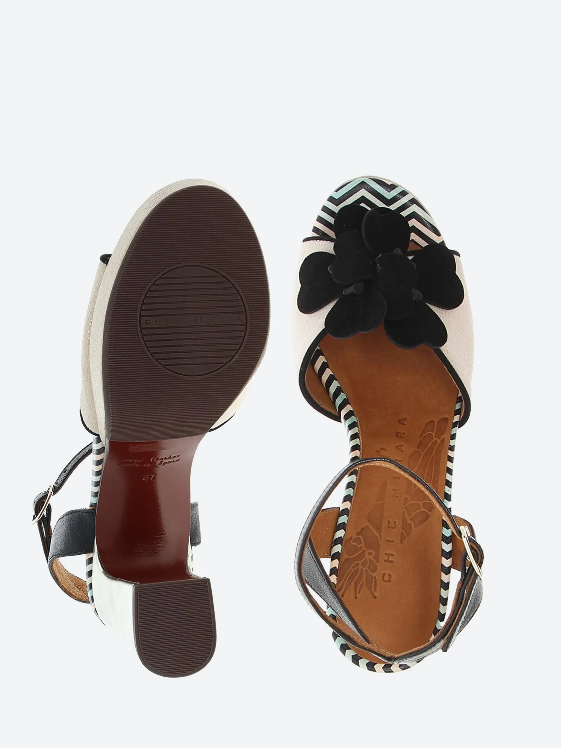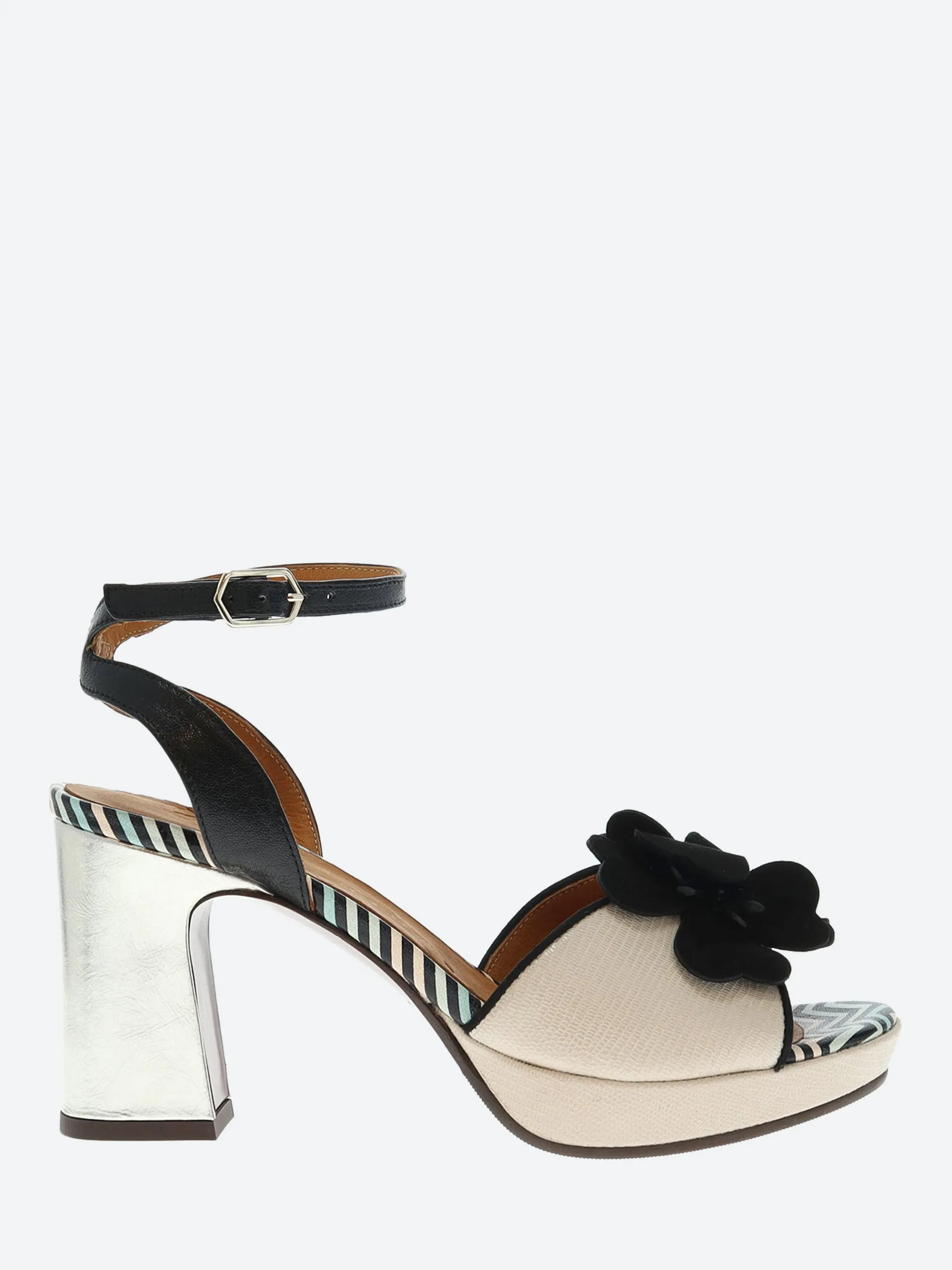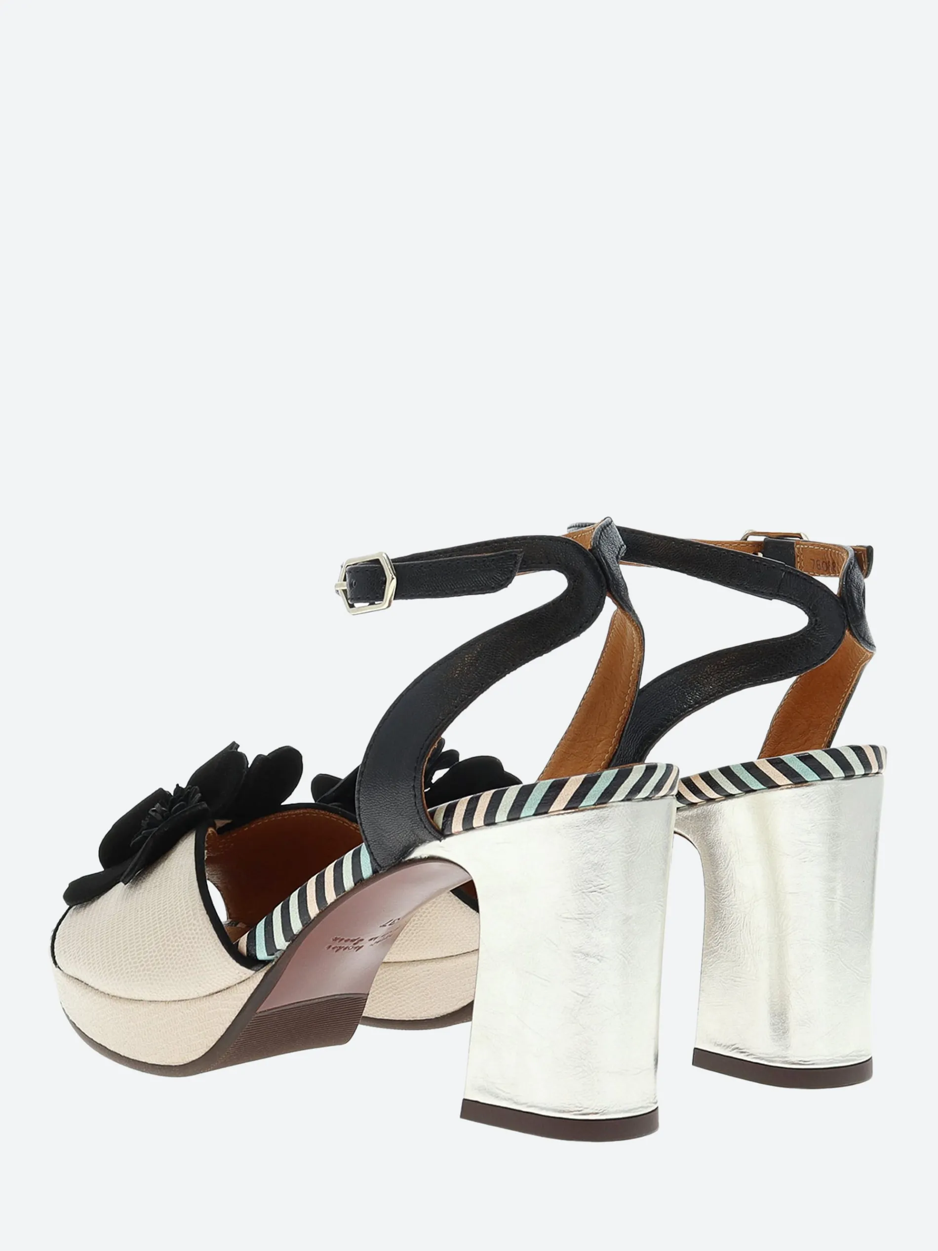 Chie Mihara open toe platform sandal, crafted from soft leather with a cross-ankle buckle closure strap. Complete with a floral applique on the toe piece.