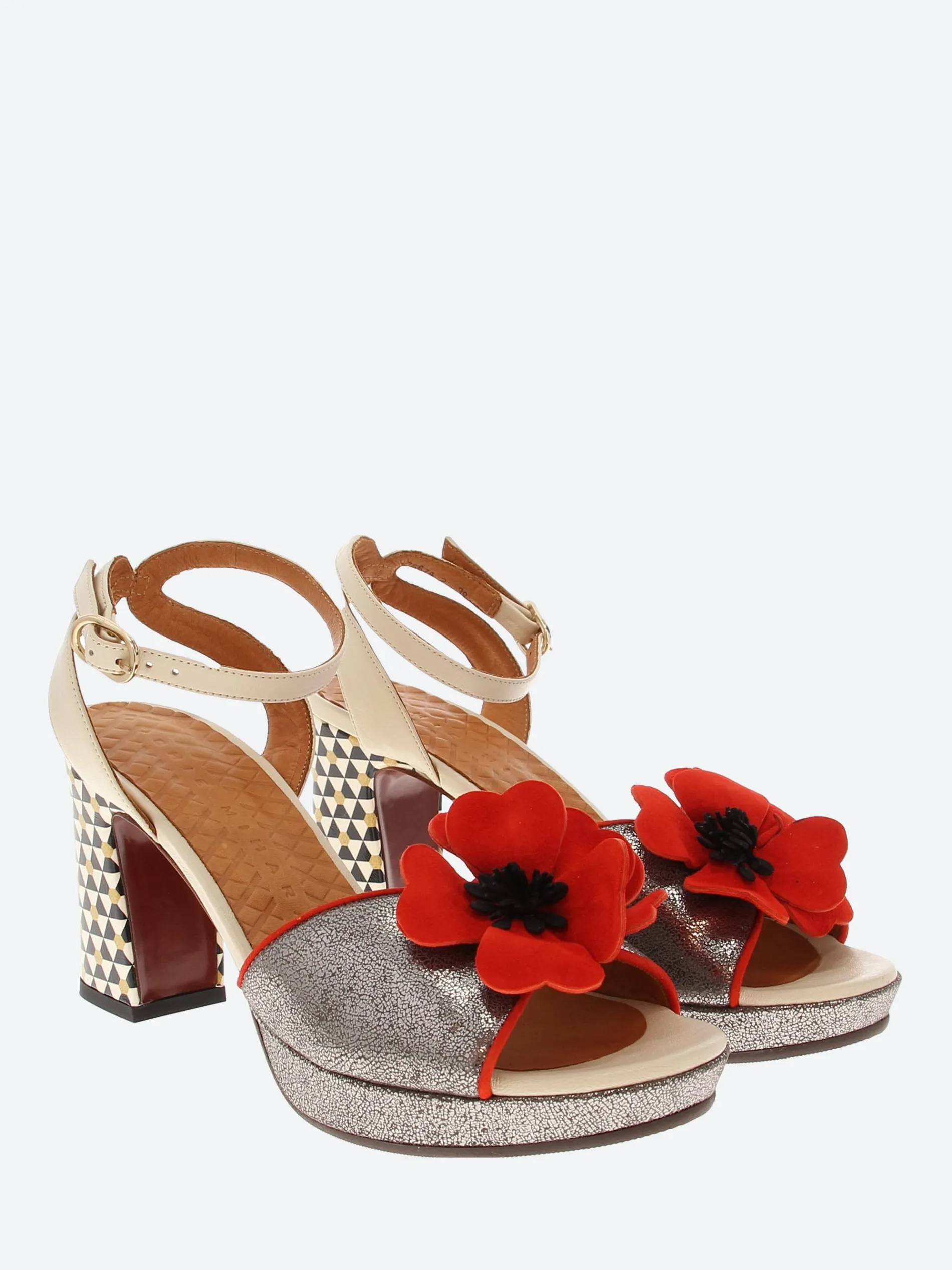 Chie Mihara open toe platform sandal, crafted from soft leather with a cross-ankle buckle closure strap. Complete with a floral applique on the toe piece.