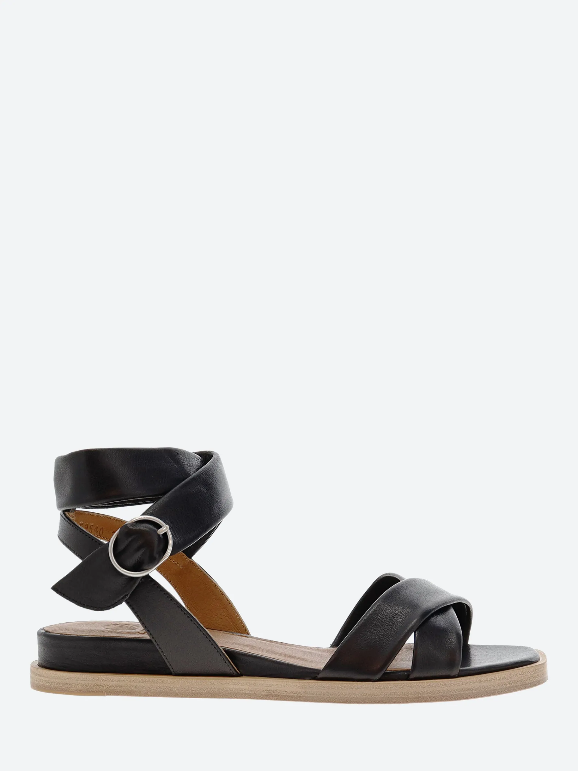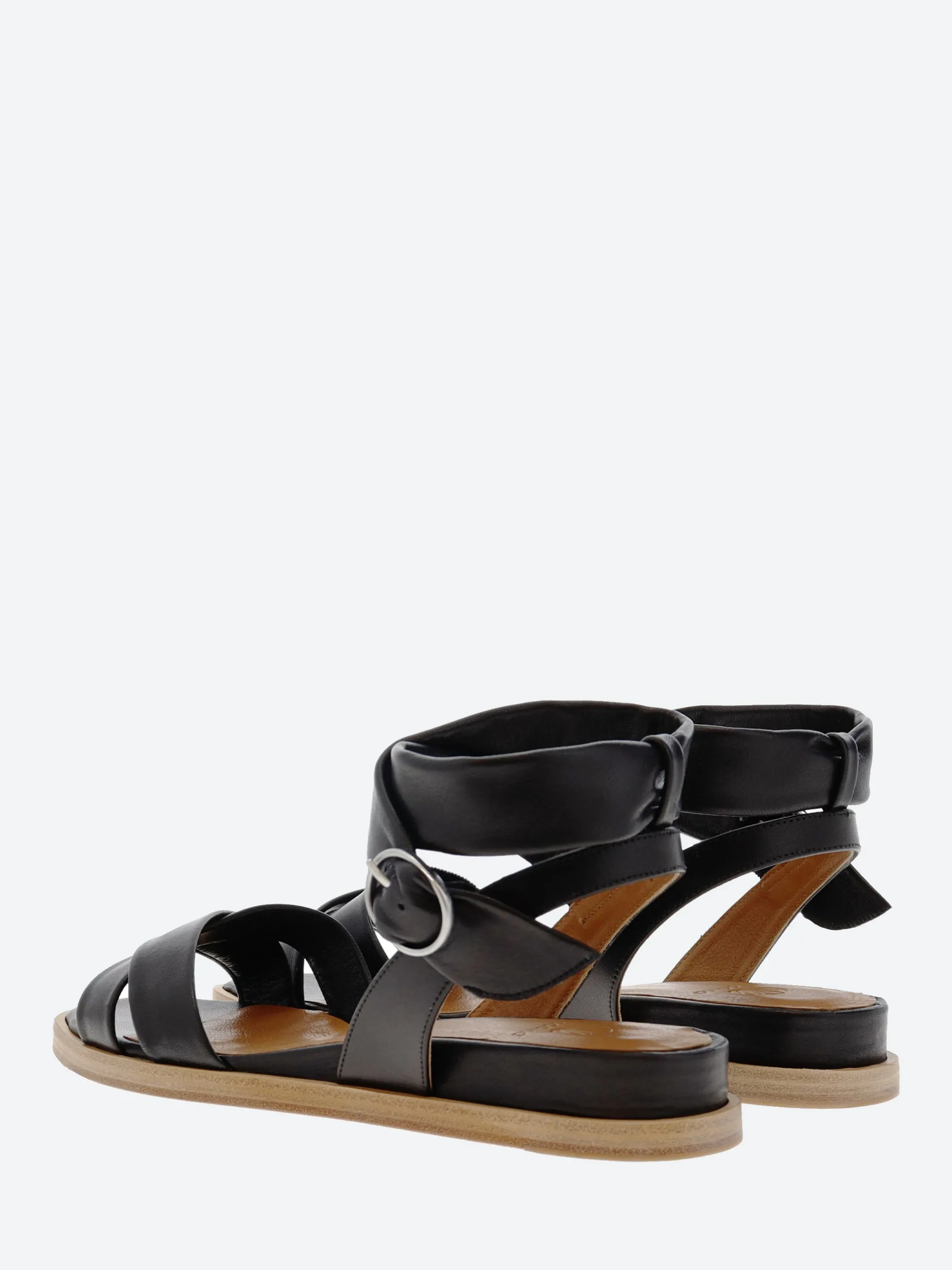 Supple tubular straps cross and support the foot and ankle. Inset leather wrapped wedge and a layered leather sole for urban style and durability.