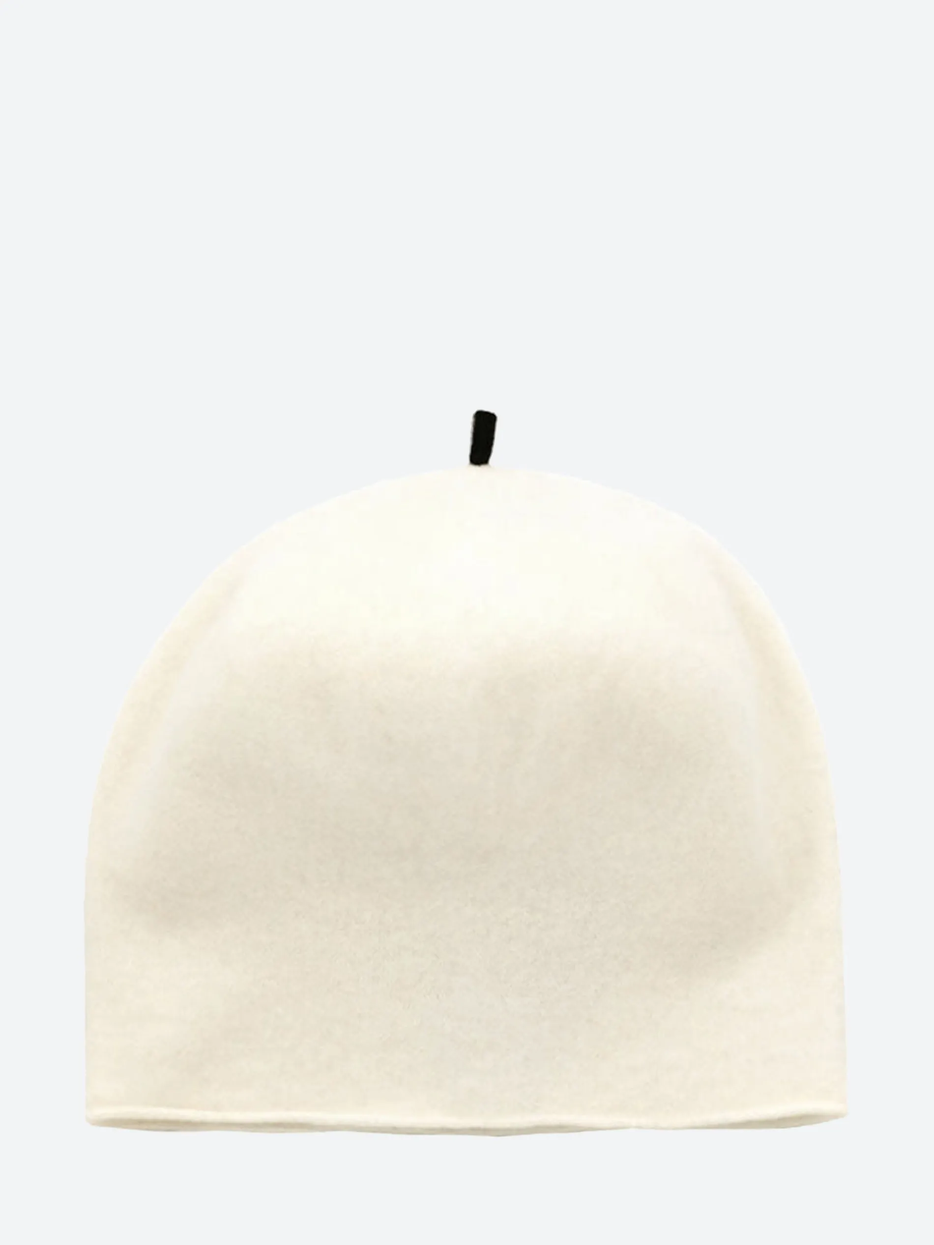 The top half of this soft hat comes in the shape of a beret – with a contrasting tip on top. The lower part offers an elongated brim that you can roll or fold up or, of course, wear as is.
