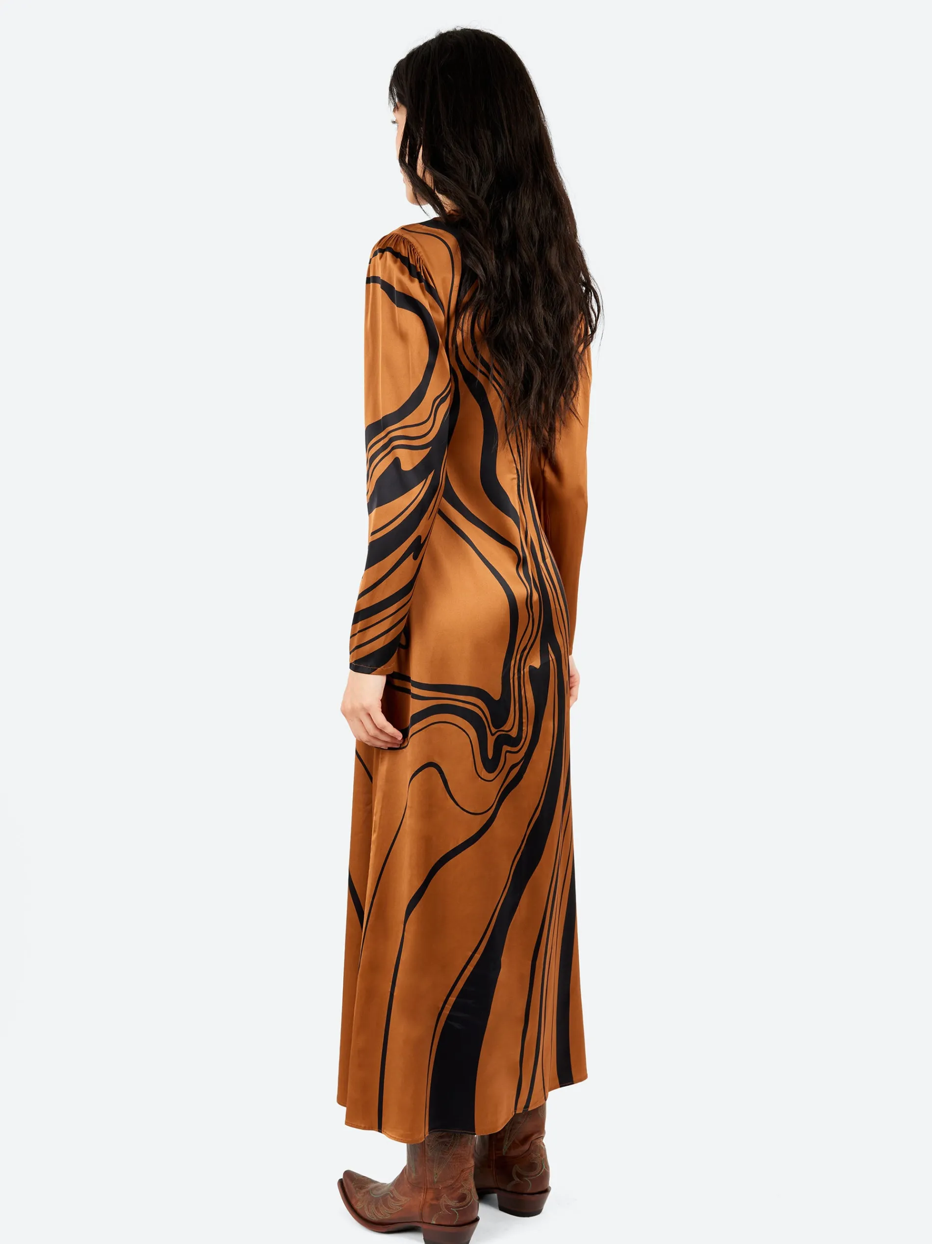 The beloved Long Sleeve Swing Dress is now redefined with a more form-fitting silhouette. It gently hugs the body, flaring out at the hips into an ankle-length skirt. Made from luxurious Italian satin, it’s adorned with the iconic LDJ Big Blooms print, hand-placed for a touch of extra elegance.