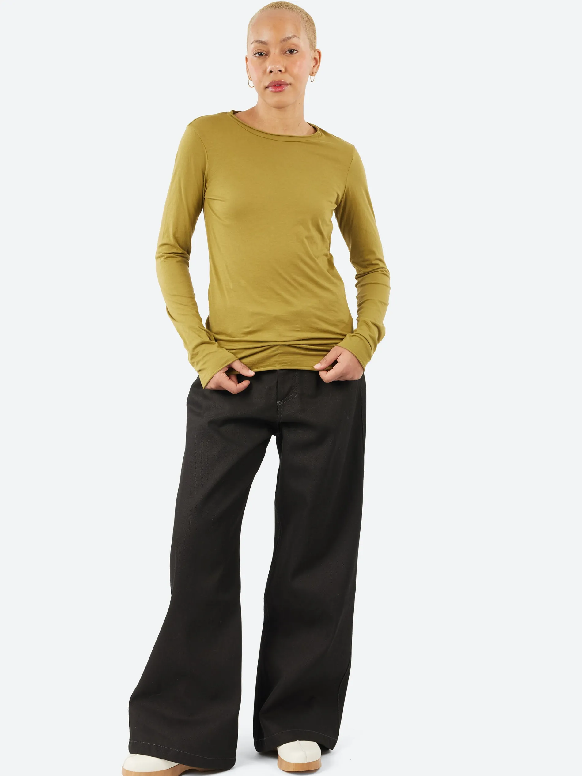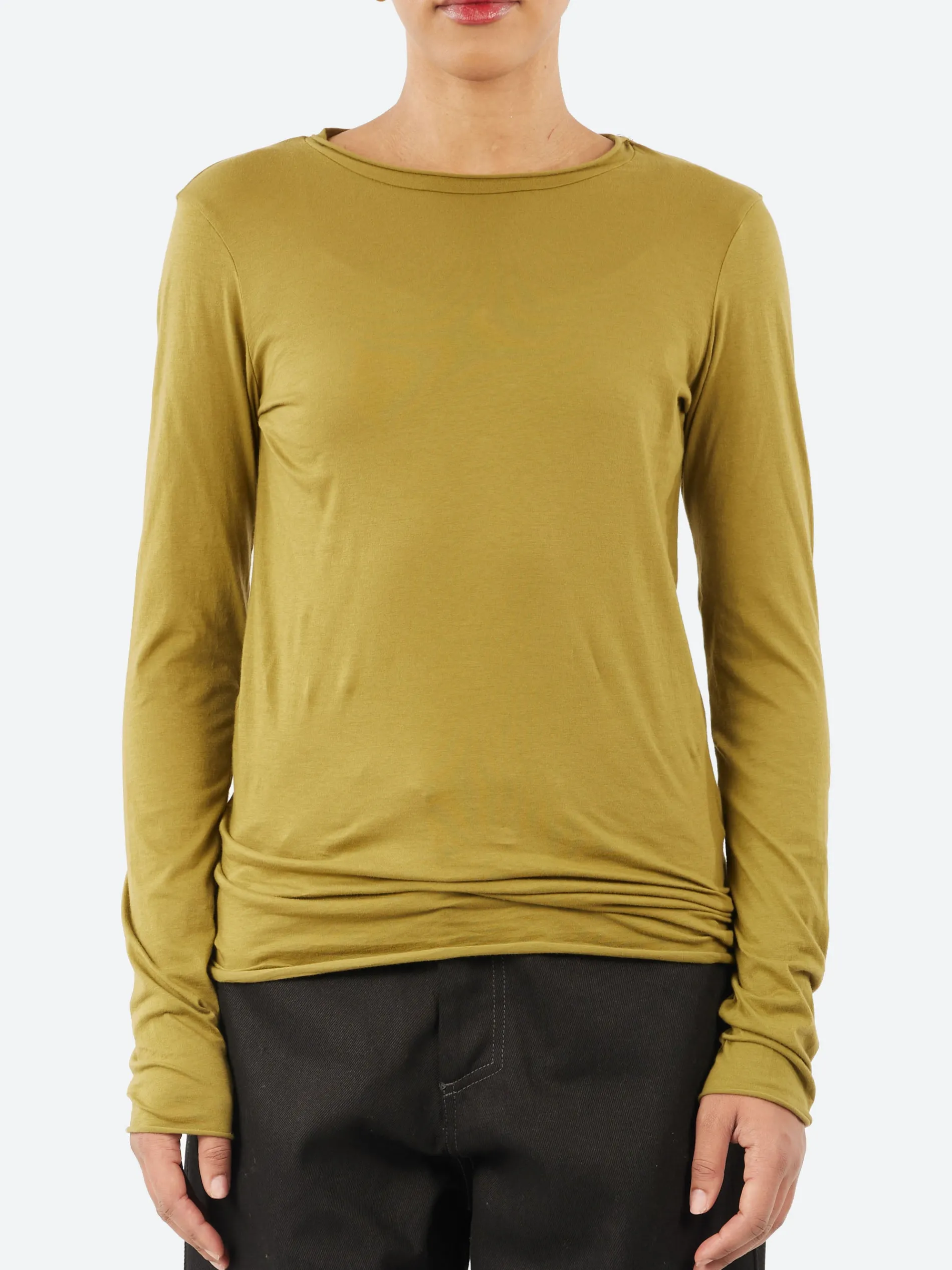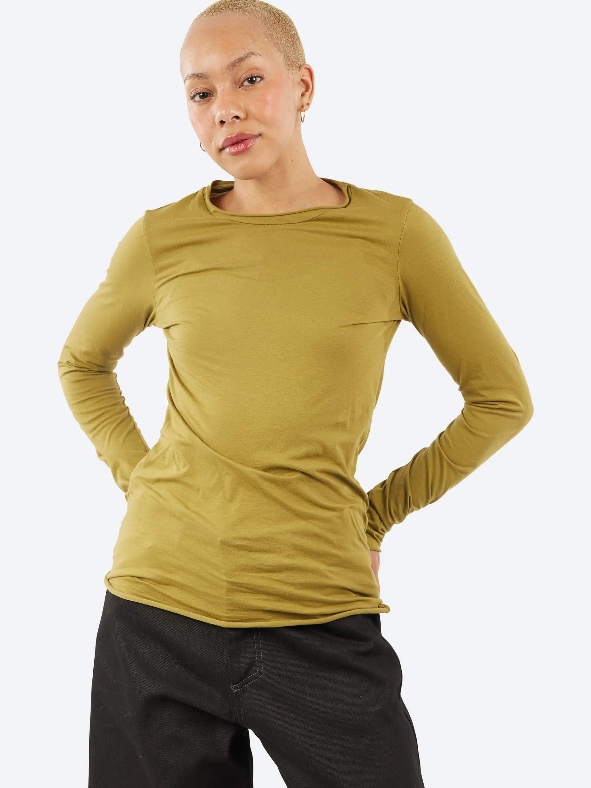 Designed with long sleeves and a classic crew neck, this t-shirt is crafted from light elastic cotton jersey, providing a slight stretch for a flattering fit and added comfort. Its simple yet versatile design makes it a perfect staple for layering or wearing on its own.