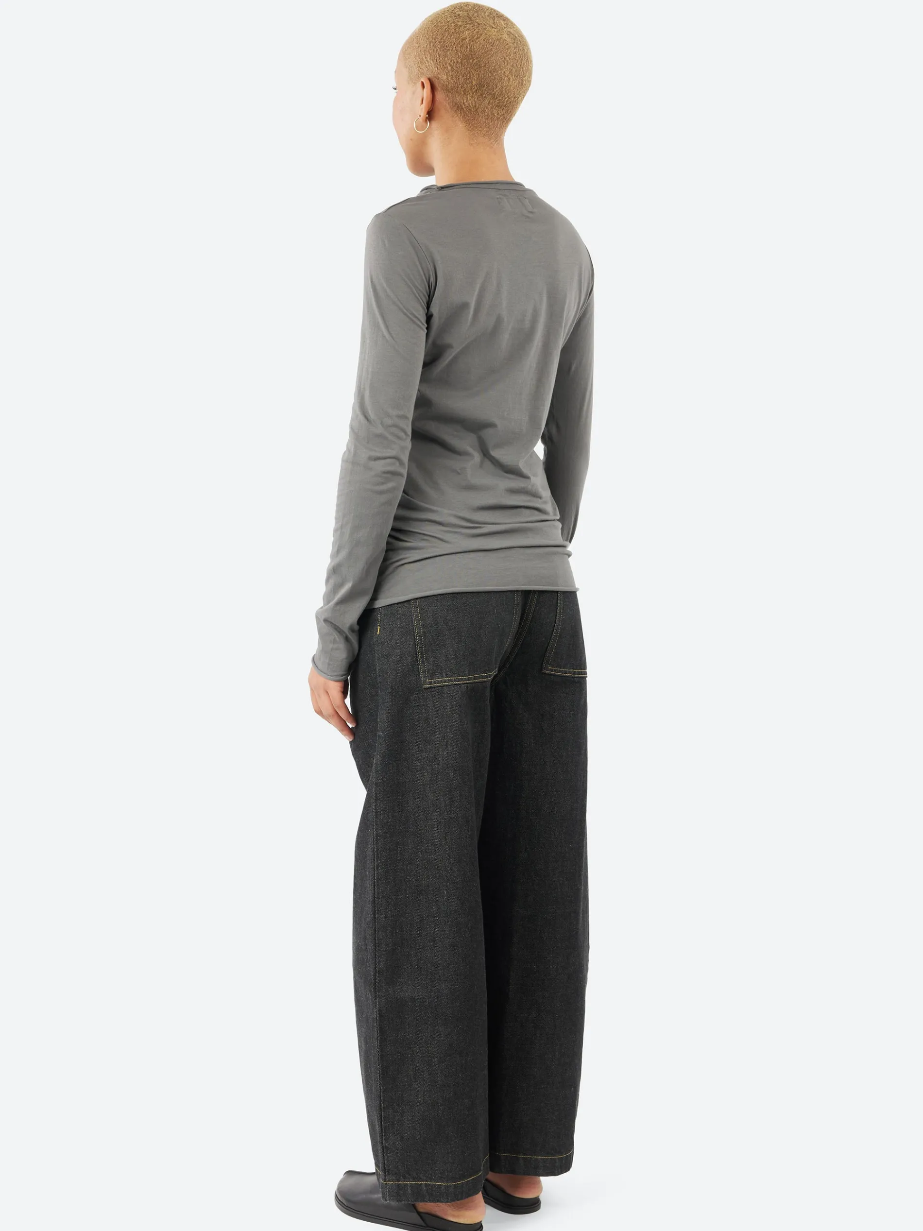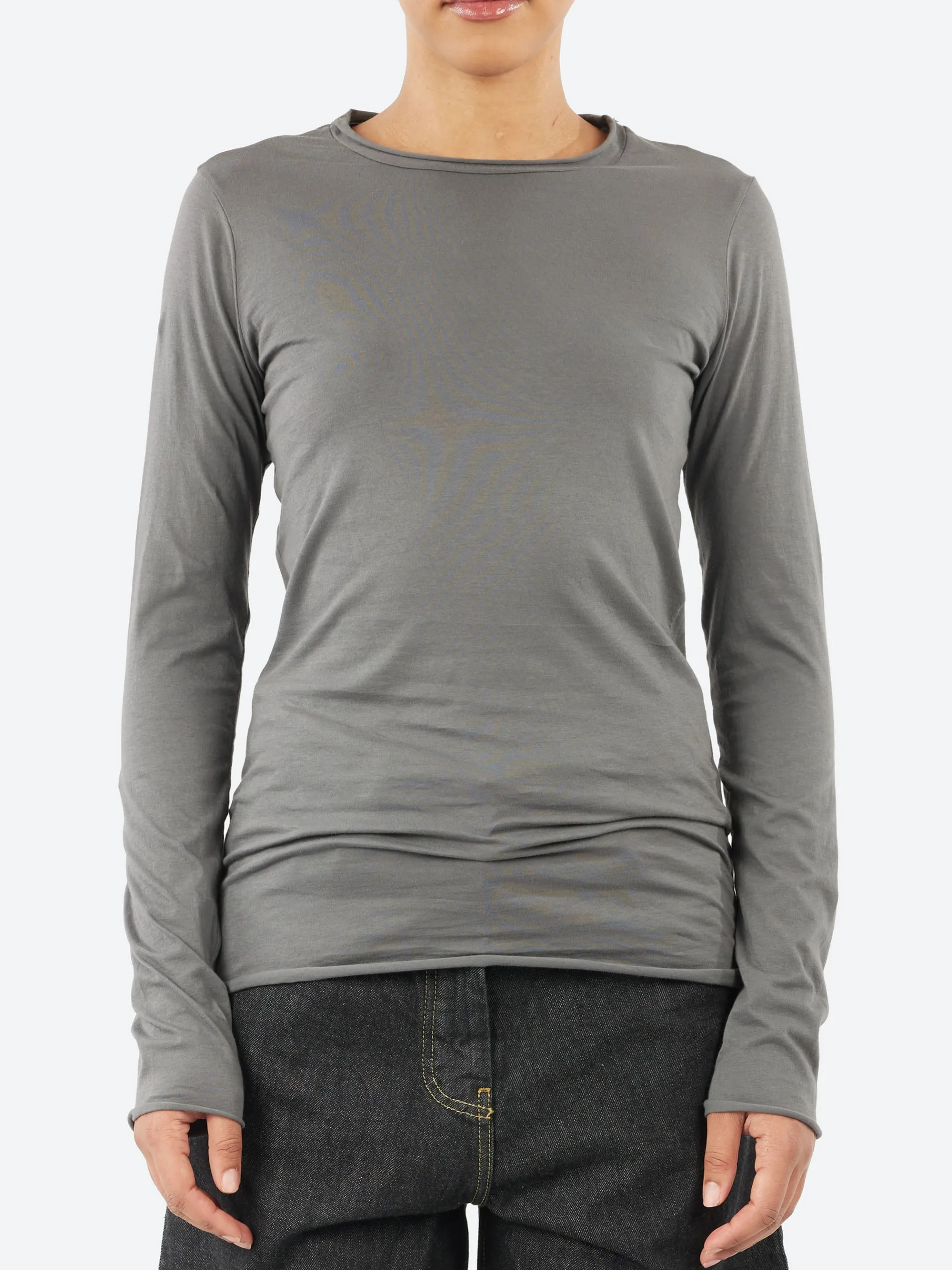 Designed with long sleeves and a classic crew neck, this t-shirt is crafted from light elastic cotton jersey, providing a slight stretch for a flattering fit and added comfort. Its simple yet versatile design makes it a perfect staple for layering or wearing on its own.