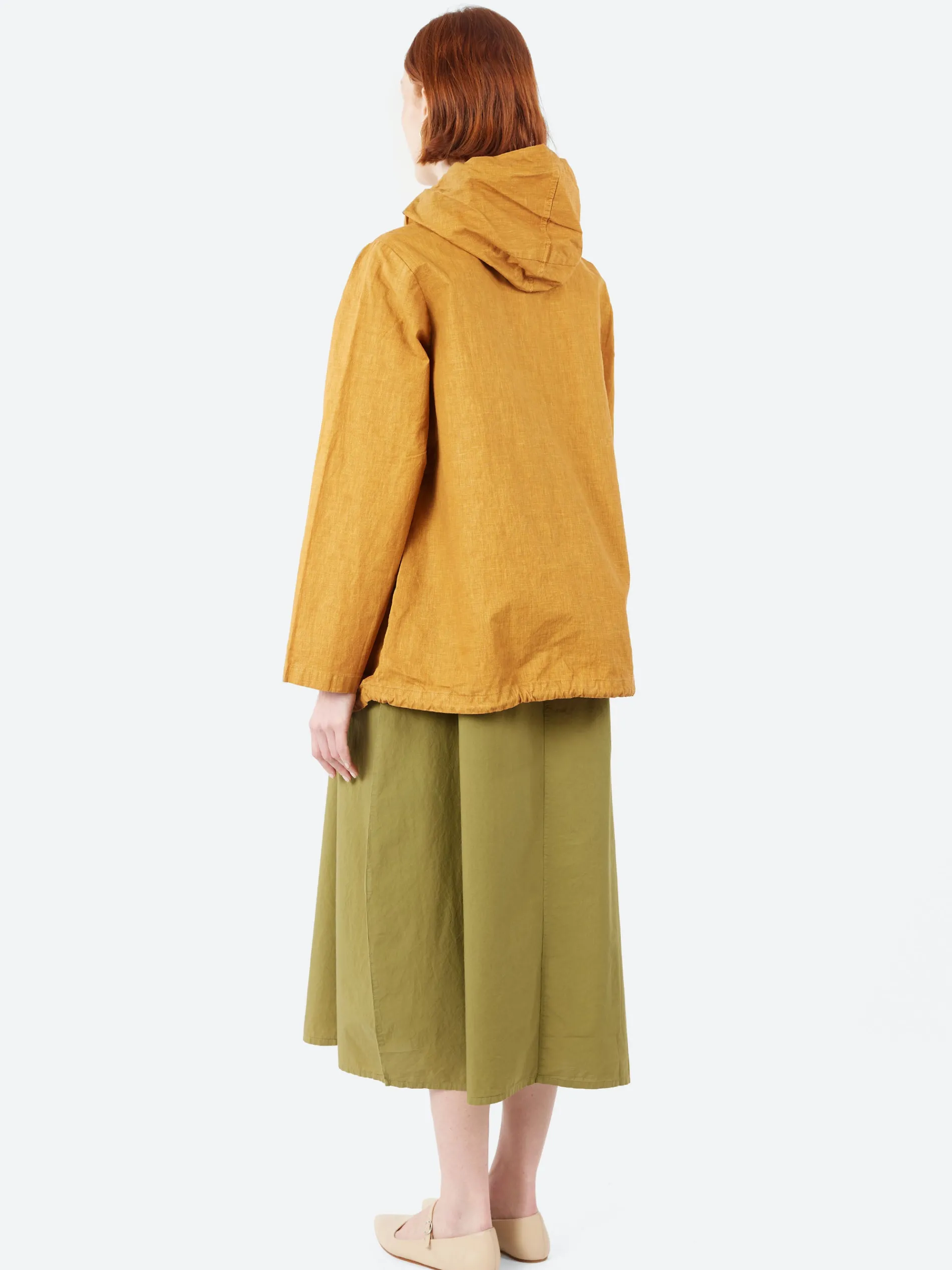 The Labo.Art Ada hooded jacket features a zip closure, two side pockets for convenience, and a gathered drawstring at the bottom, allowing for a customizable fit and added style. Made from polyurethane-coated linen this jacket provides a sleek, water-repellent finish, making it perfect for unpredictable weather. Its minimalistic yet functional design ensures both comfort and versatility for everyday wear.