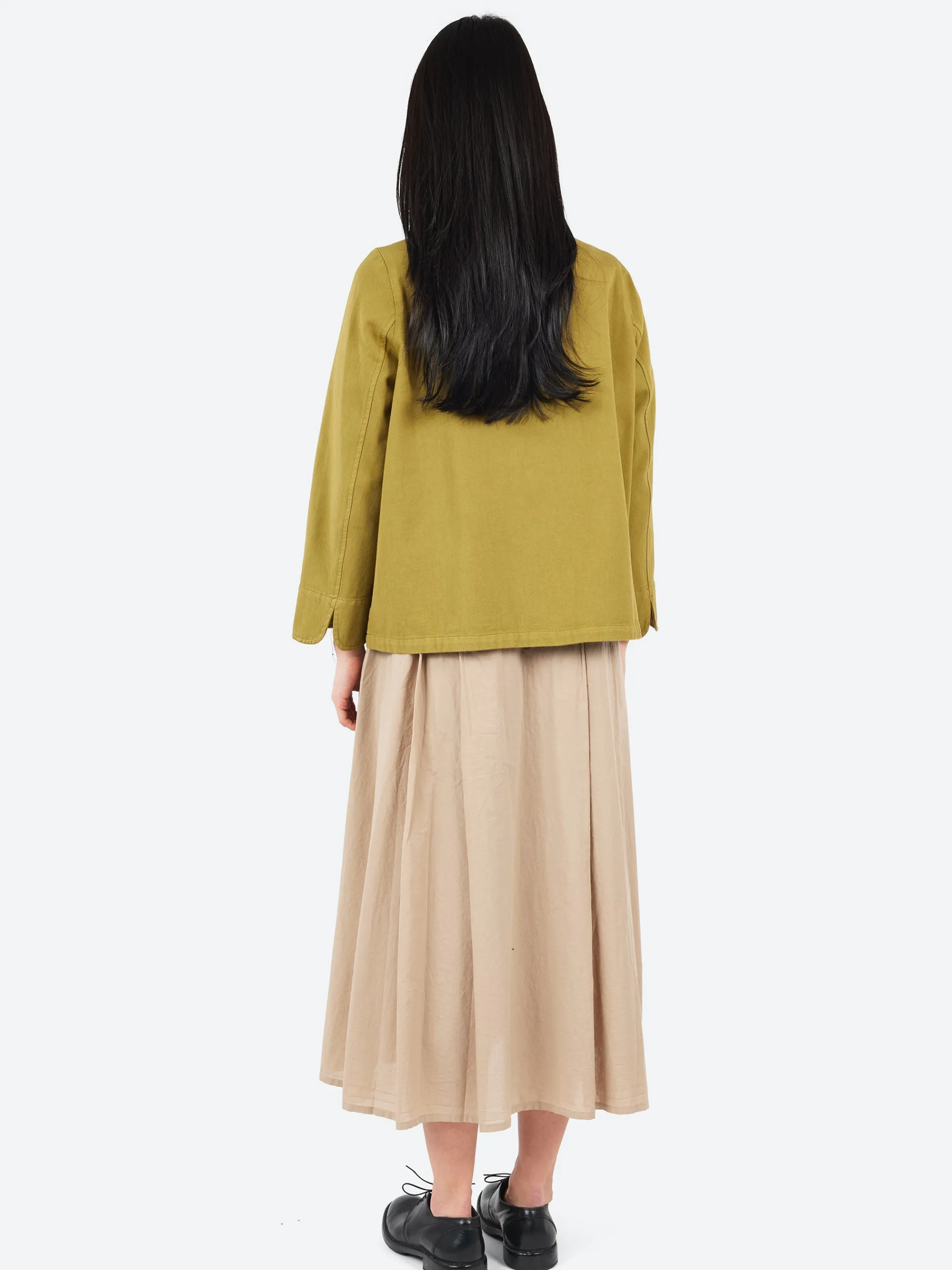 Labo.Art A-line jacket is designed with a mandarin collar and flap pockets, crafted from durable cotton twill. Its relaxed, structured fit offers a flattering silhouette, making it a versatile piece that can easily be styled for both casual and more polished occasions. The functional flap pockets add an extra touch of practicality.