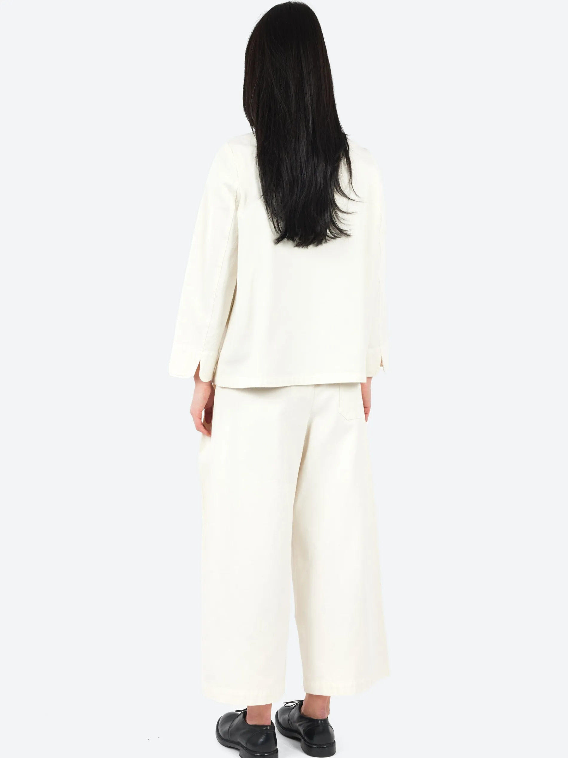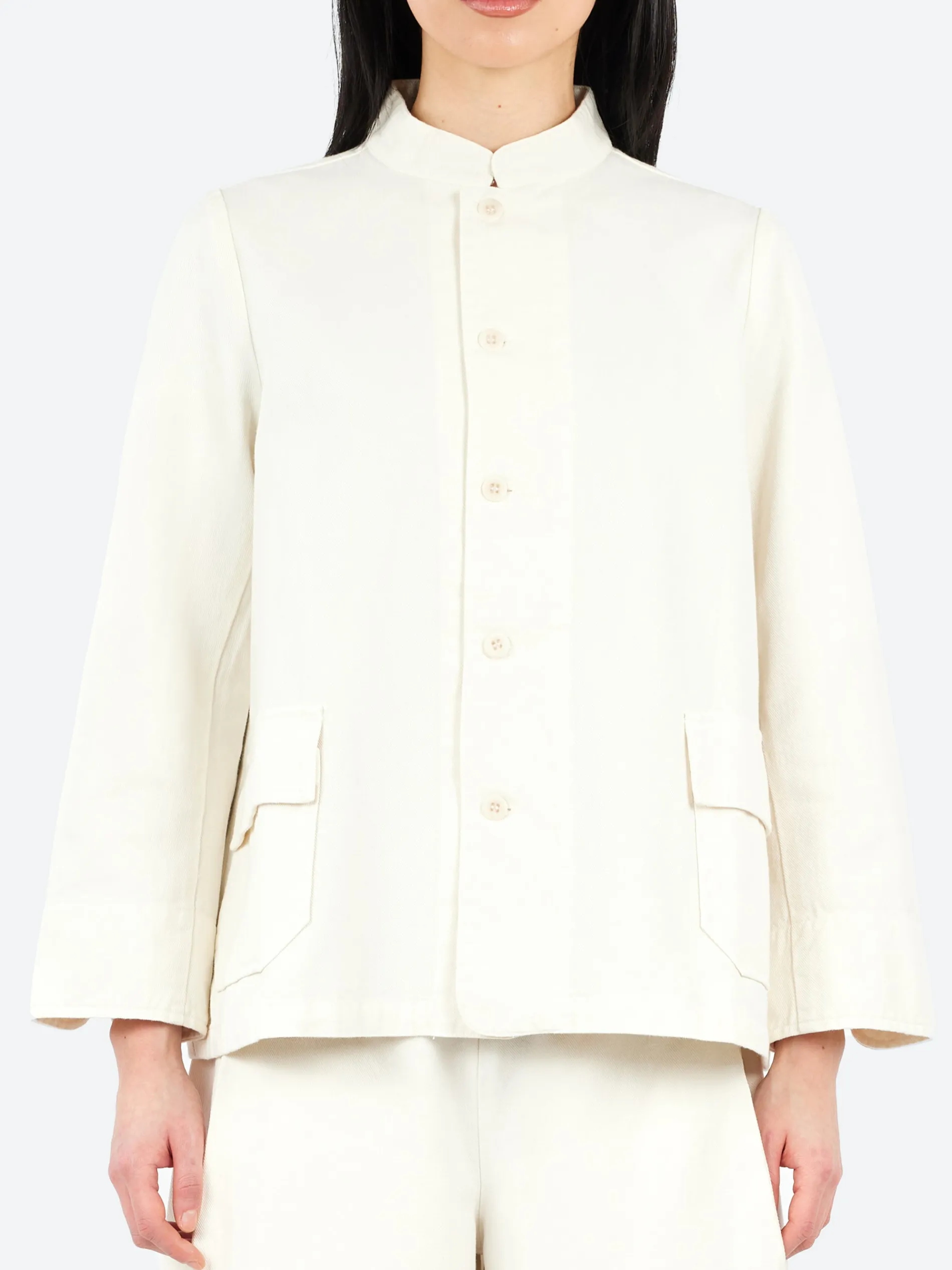 Labo.Art A-line jacket is designed with a mandarin collar and flap pockets, crafted from durable cotton twill. Its relaxed, structured fit offers a flattering silhouette, making it a versatile piece that can easily be styled for both casual and more polished occasions. The functional flap pockets add an extra touch of practicality.